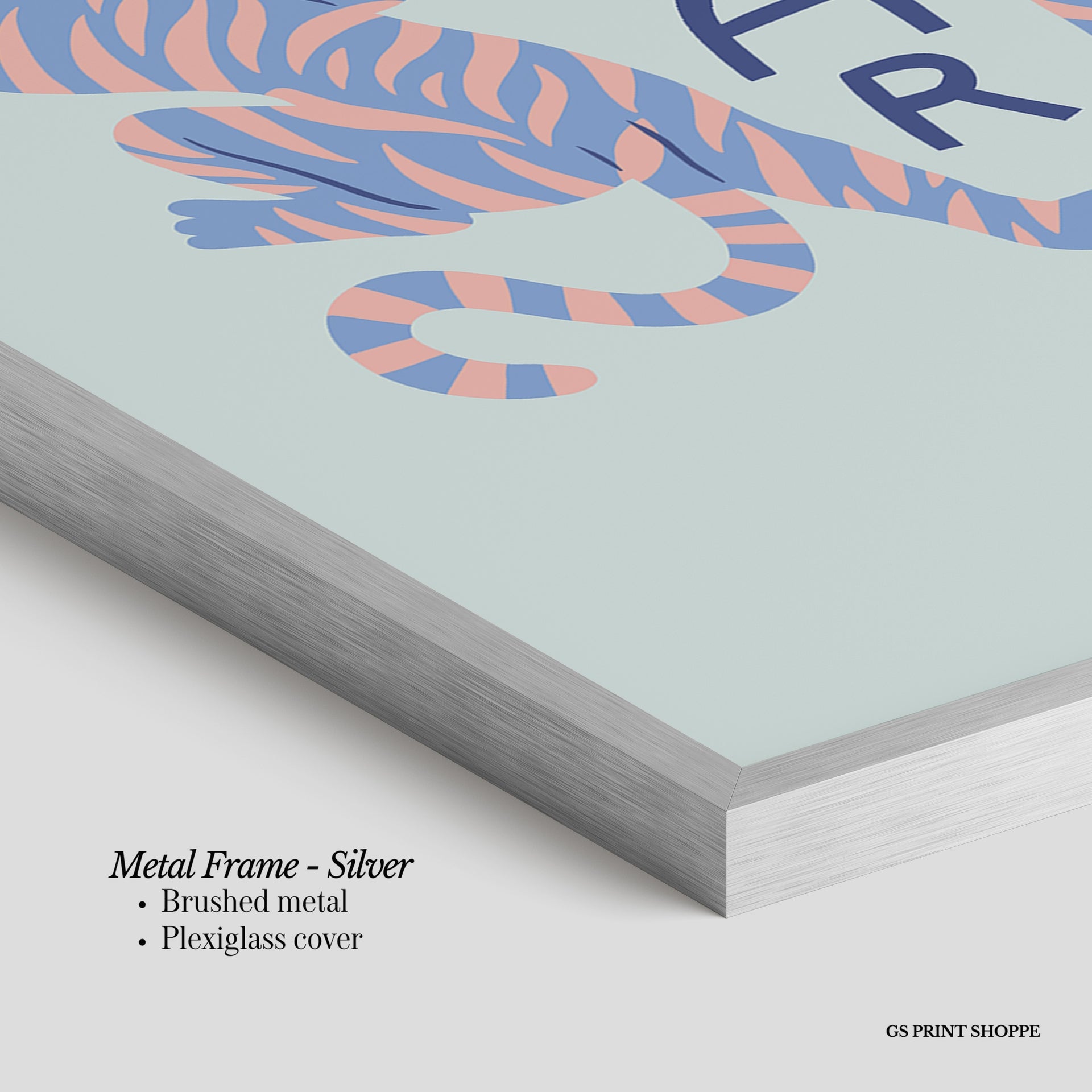 Metal Frame: Sleek and modern, our metal frame is crafted with brushed metal for a polished finish. It comes with durable plexiglass and sturdy metal hangers for horizontal or vertical display.