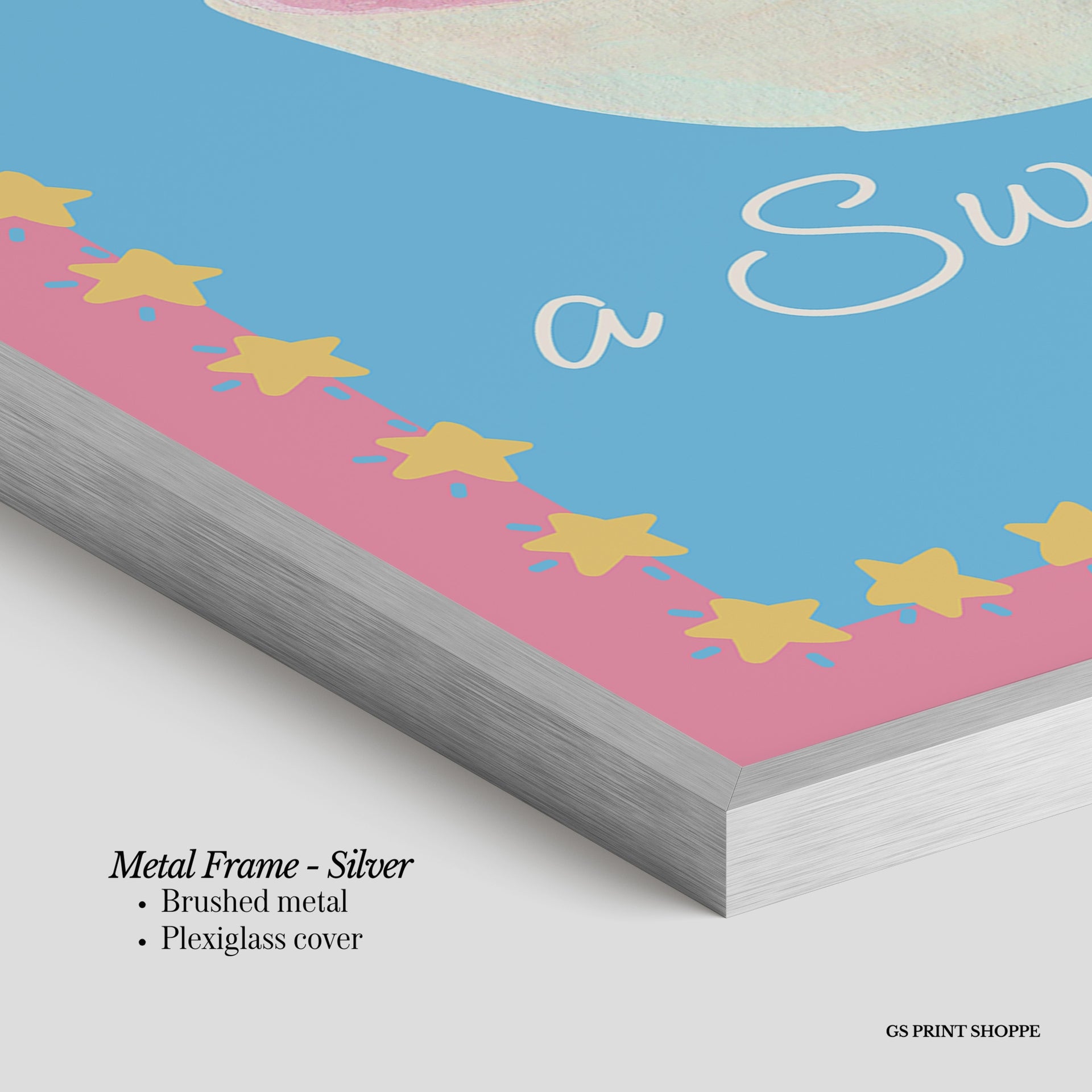 Metal Frame: Sleek and modern, our metal frame is crafted with brushed metal for a polished finish. It comes with durable plexiglass and sturdy metal hangers for horizontal or vertical display.
