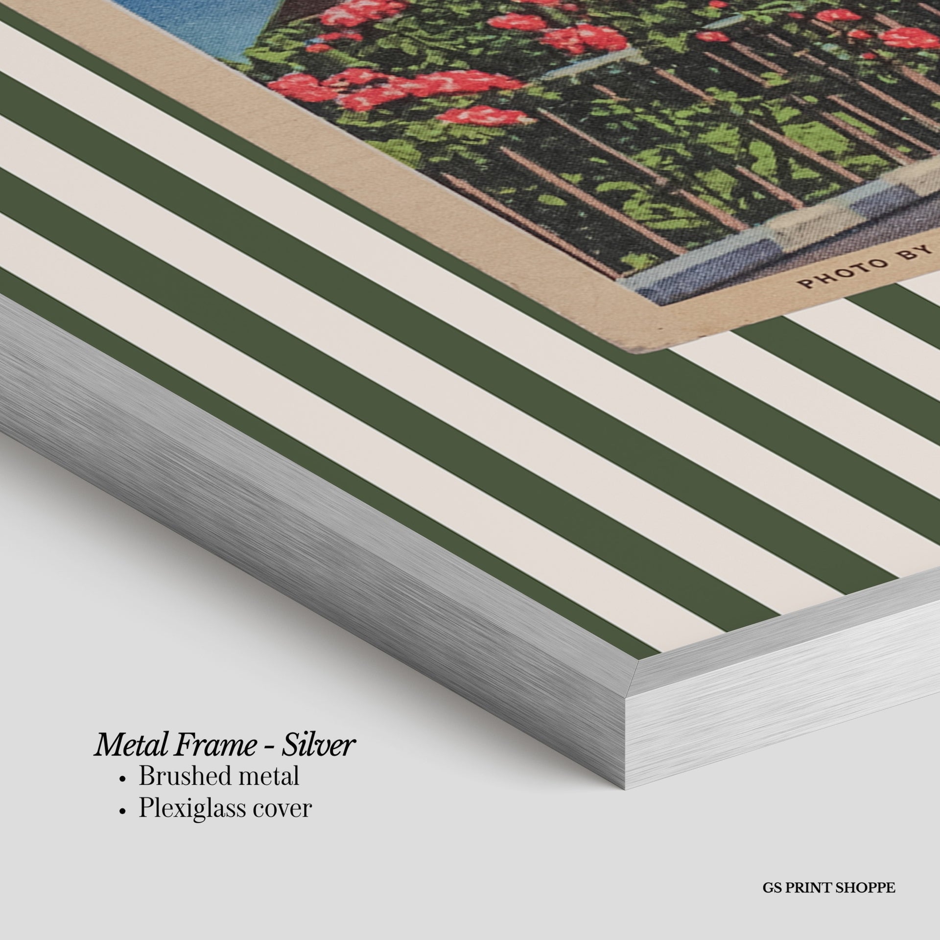 Metal Frame: Sleek and modern, our metal frame is crafted with brushed metal for a polished finish. It comes with durable plexiglass and sturdy metal hangers for horizontal or vertical display.
