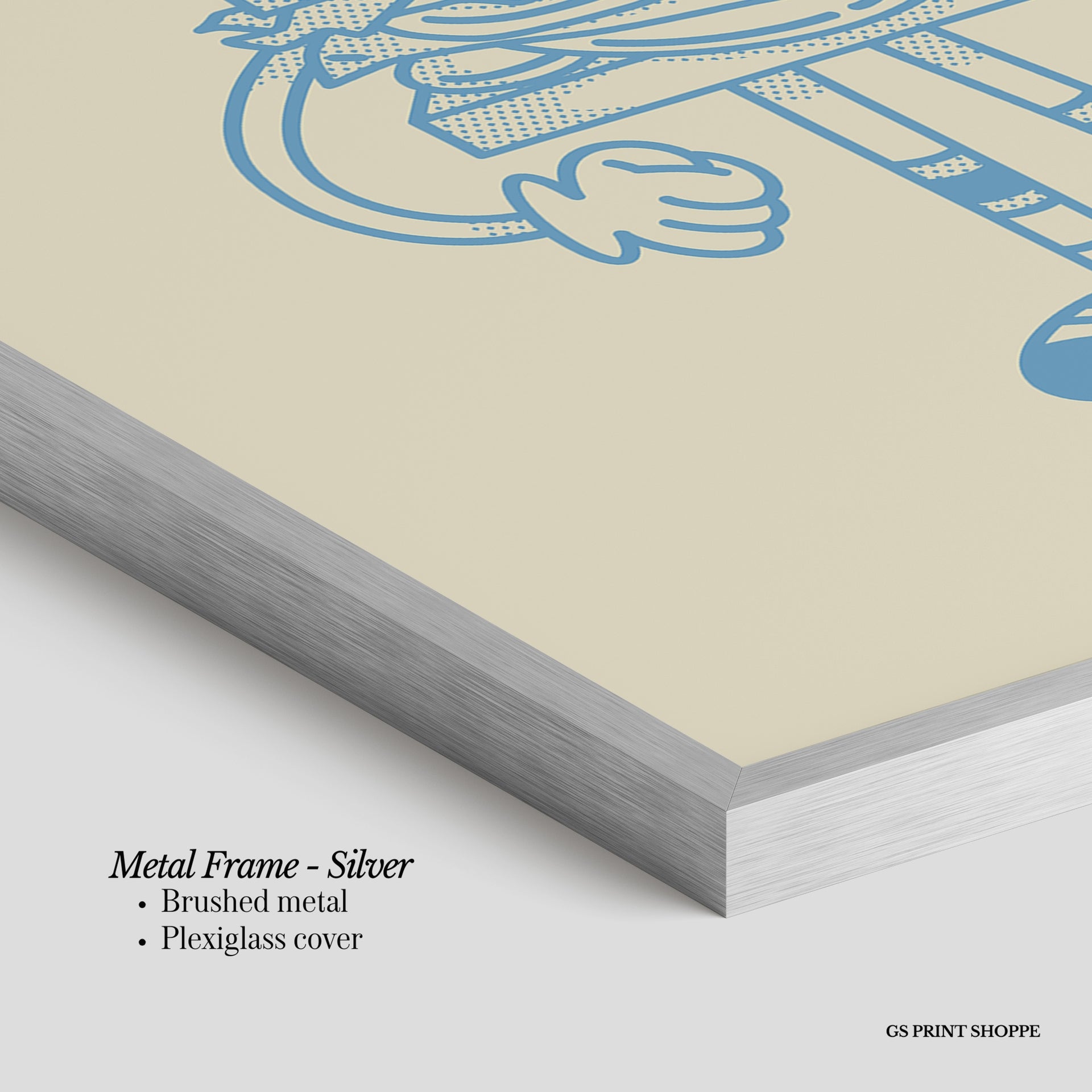 Metal Frame: Sleek and modern, our metal frame is crafted with brushed metal for a polished finish. It comes with durable plexiglass and sturdy metal hangers for horizontal or vertical display.