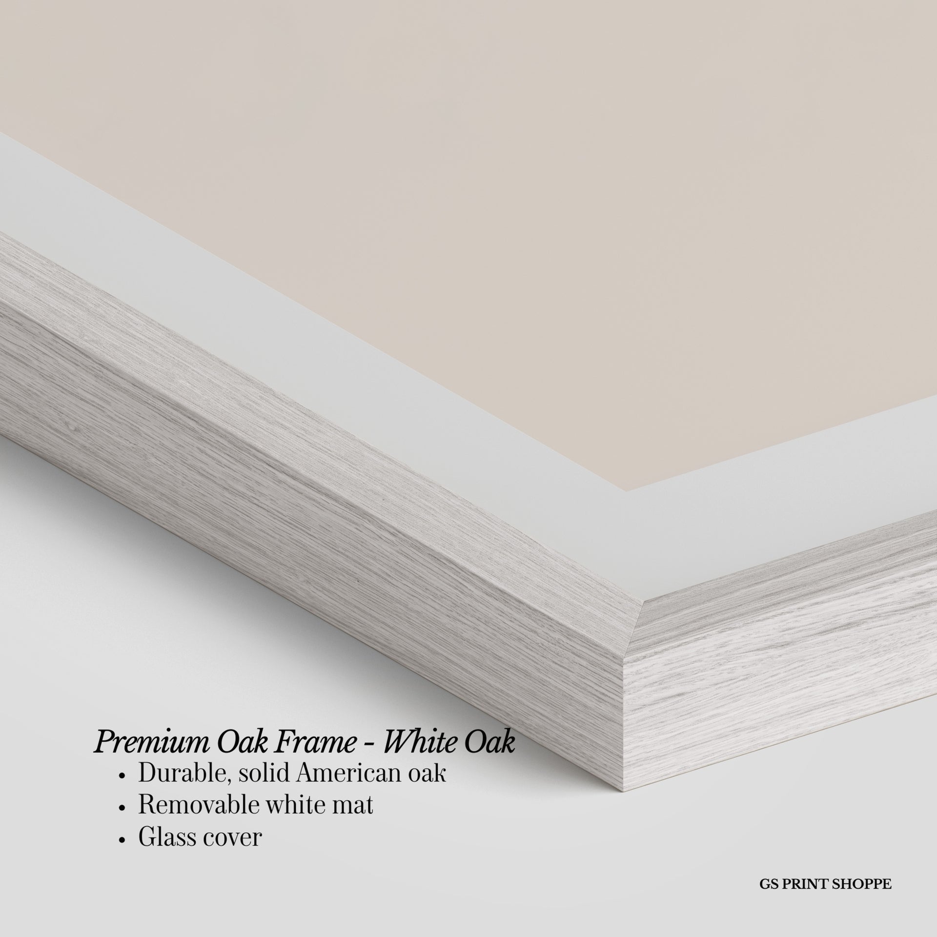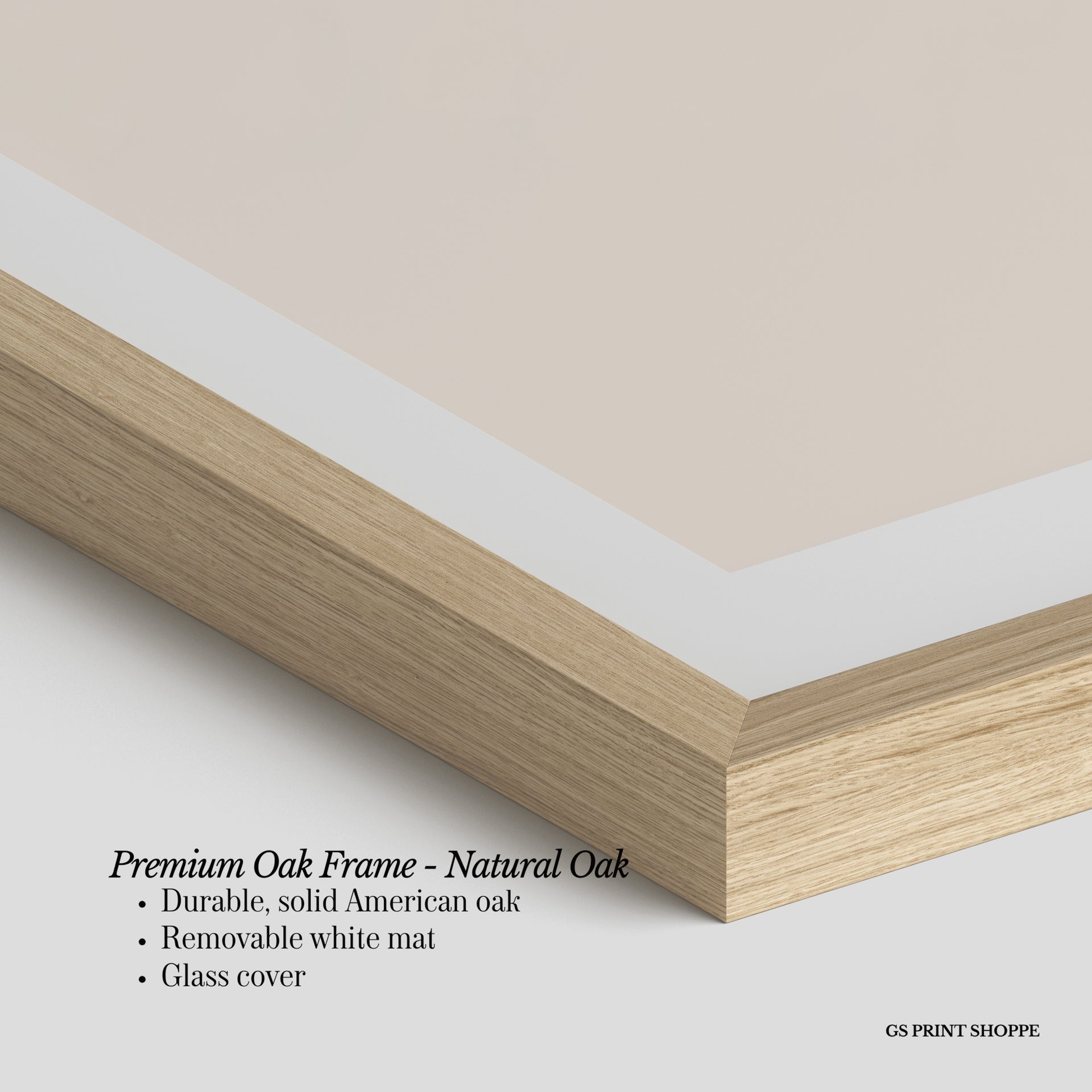 Premium Oak Frame: Our premium oak frame is crafted from solid American oak, offering a warm, natural feel with a high-end finish. We complete this elevated offering with a bright white removable mat and real glass for a versatile and polished look.