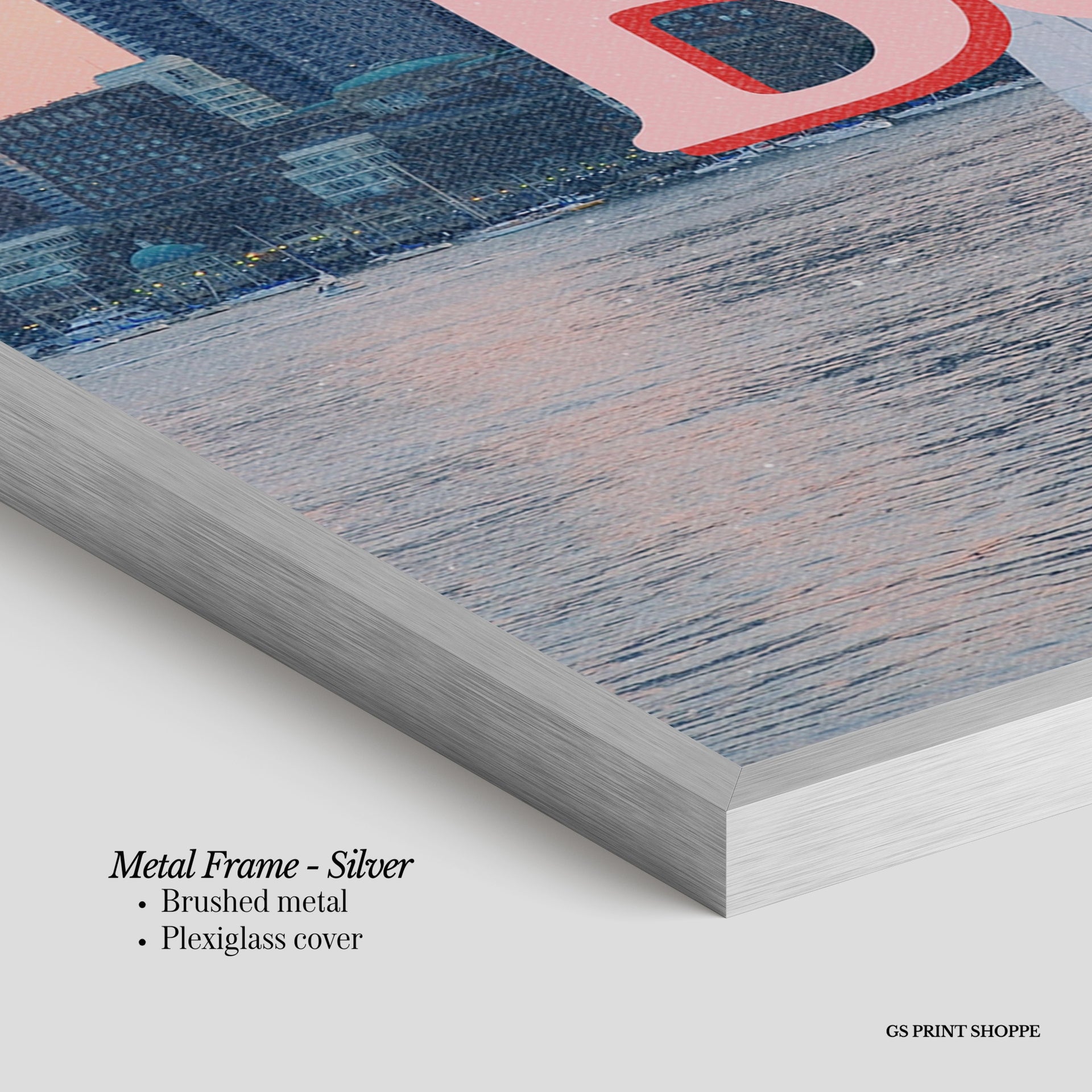 Metal Frame: Sleek and modern, our metal frame is crafted with brushed metal for a polished finish. It comes with durable plexiglass and sturdy metal hangers for horizontal or vertical display.