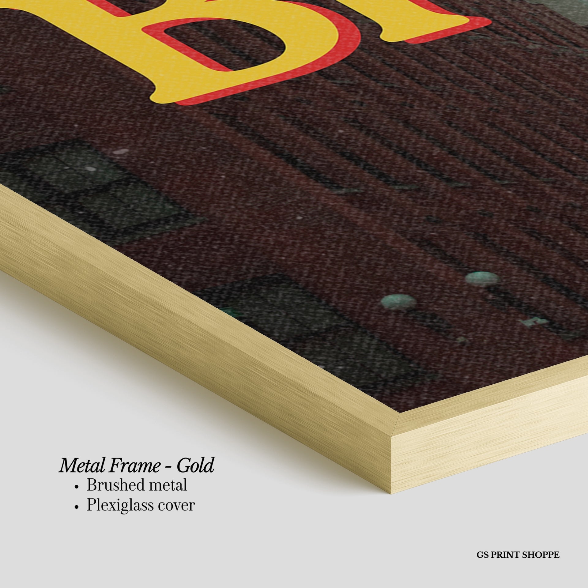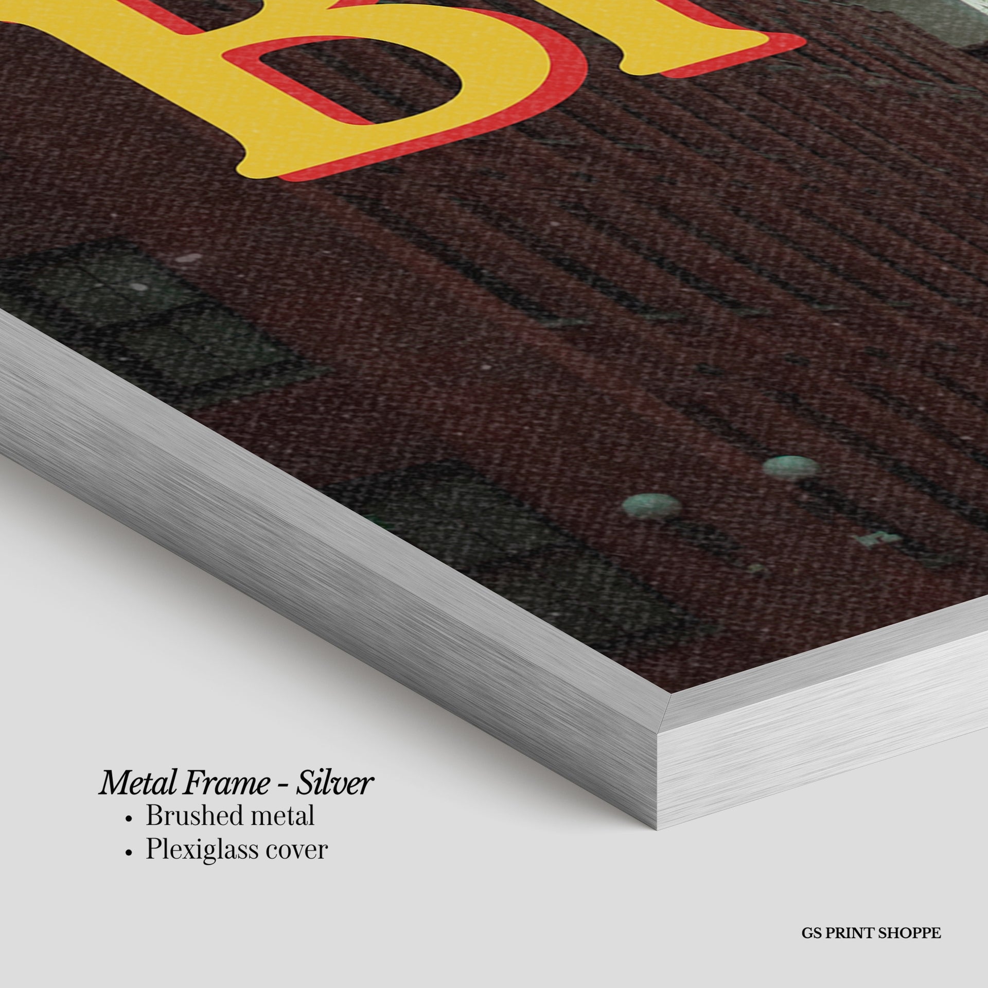 Metal Frame: Sleek and modern, our metal frame is crafted with brushed metal for a polished finish. It comes with durable plexiglass and sturdy metal hangers for horizontal or vertical display.