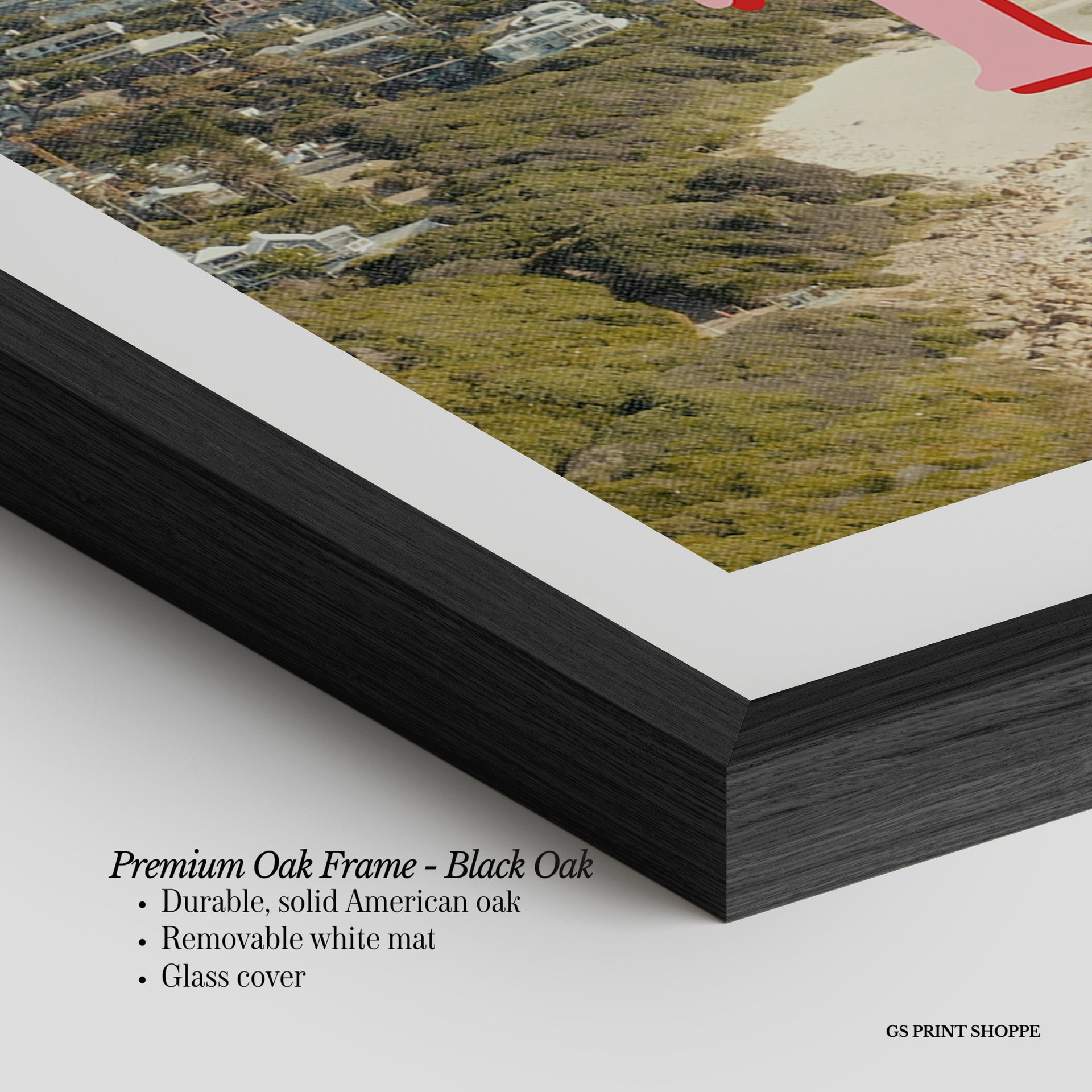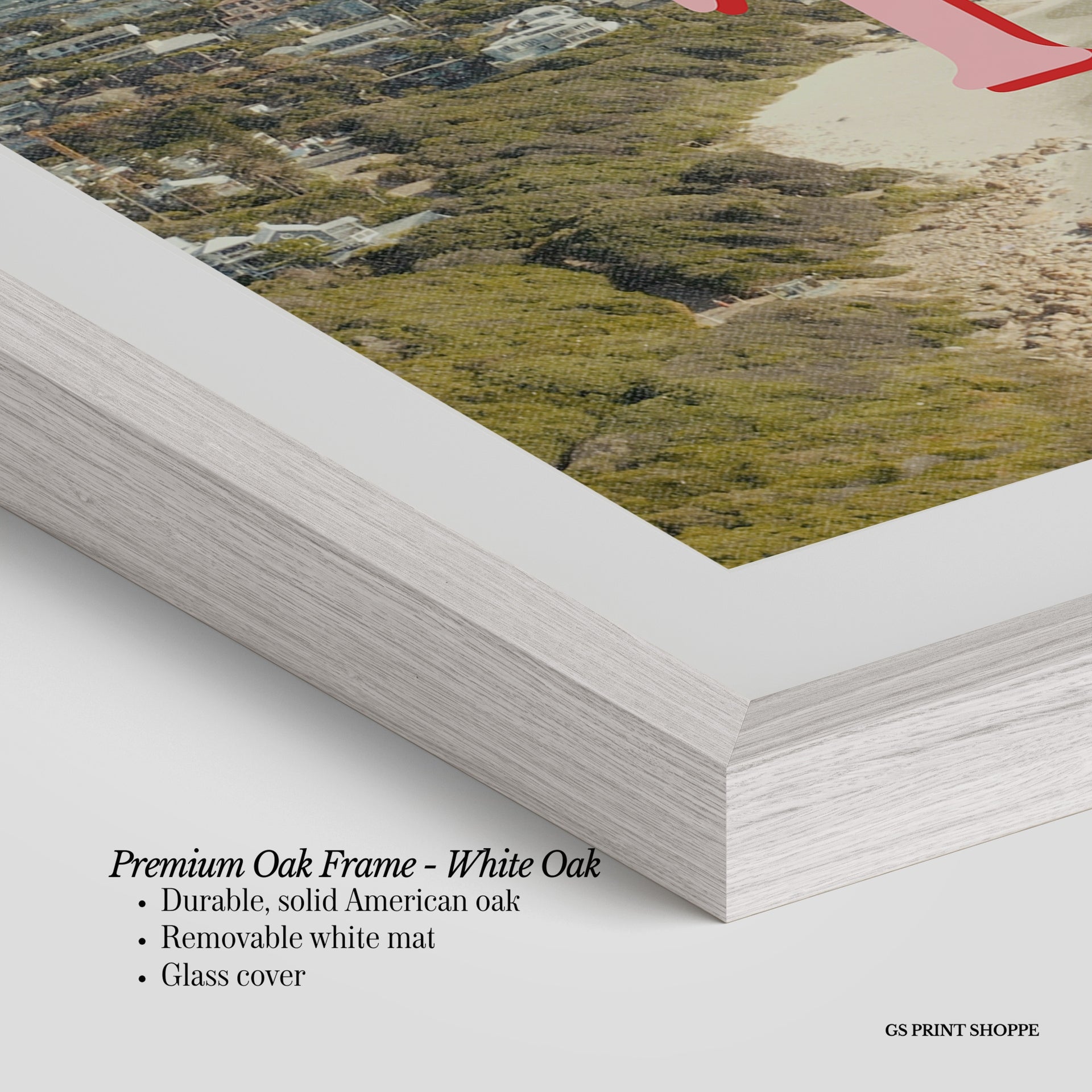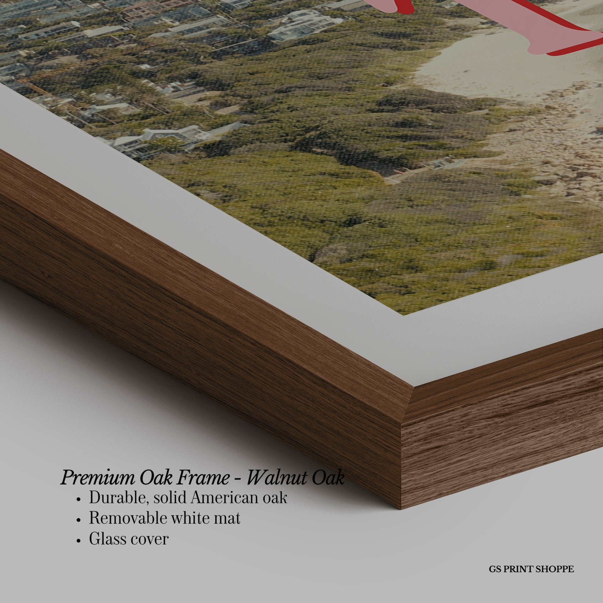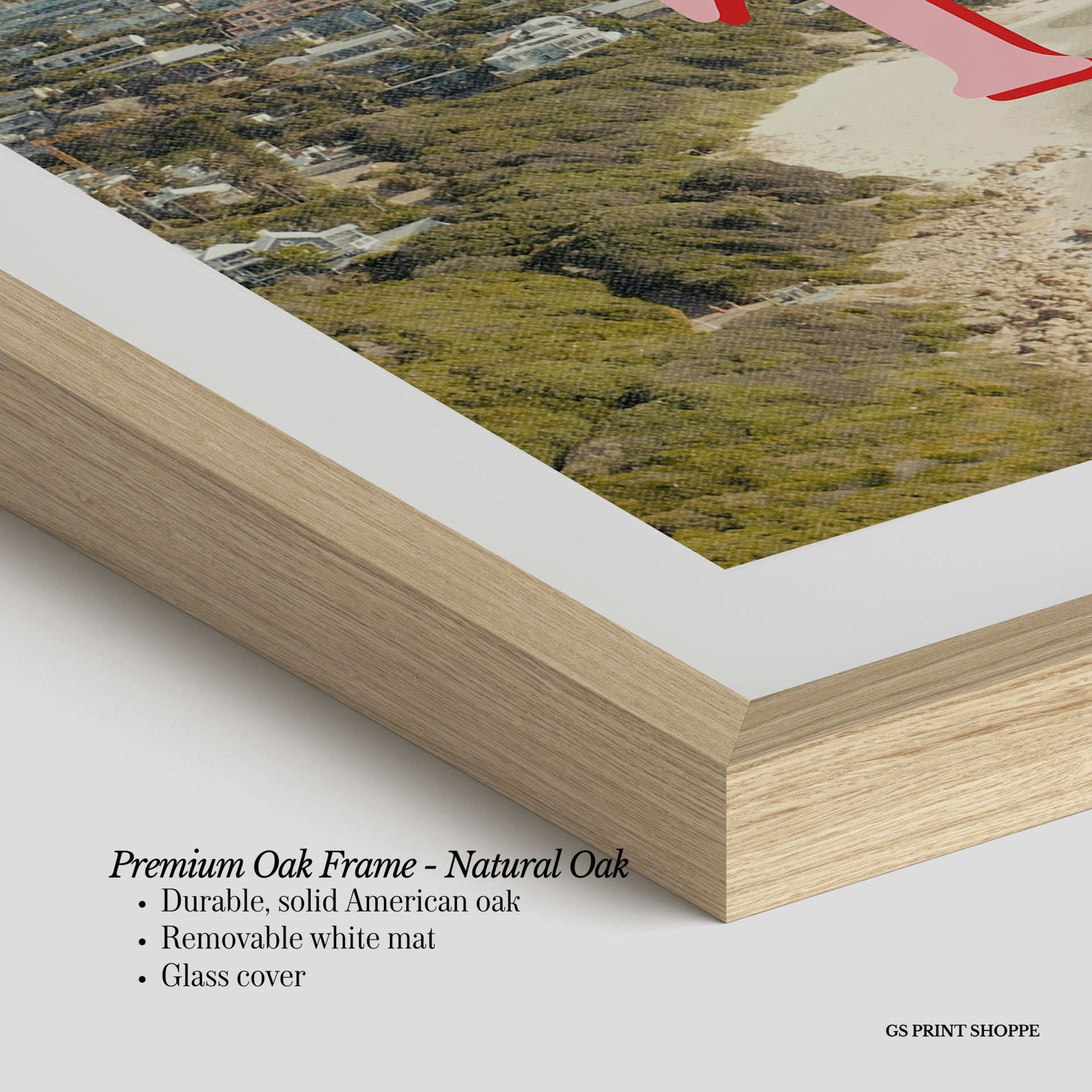 Premium Oak Frame: Our premium oak frame is crafted from solid American oak, offering a warm, natural feel with a high-end finish. We complete this elevated offering with a bright white removable mat and real glass for a versatile and polished look.