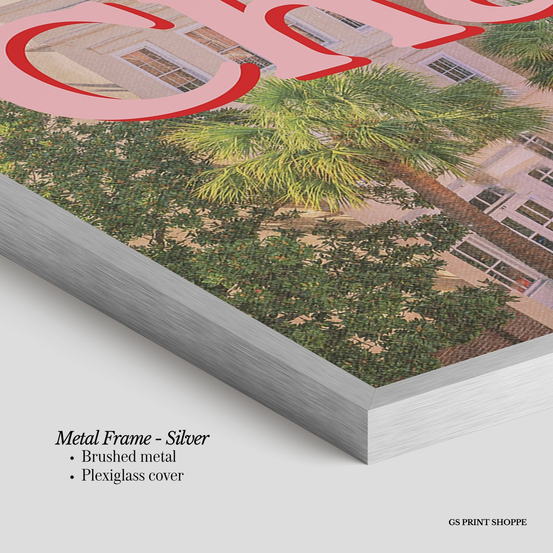 Metal Frame: Sleek and modern, our metal frame is crafted with brushed metal for a polished finish. It comes with durable plexiglass and sturdy metal hangers for horizontal or vertical display.