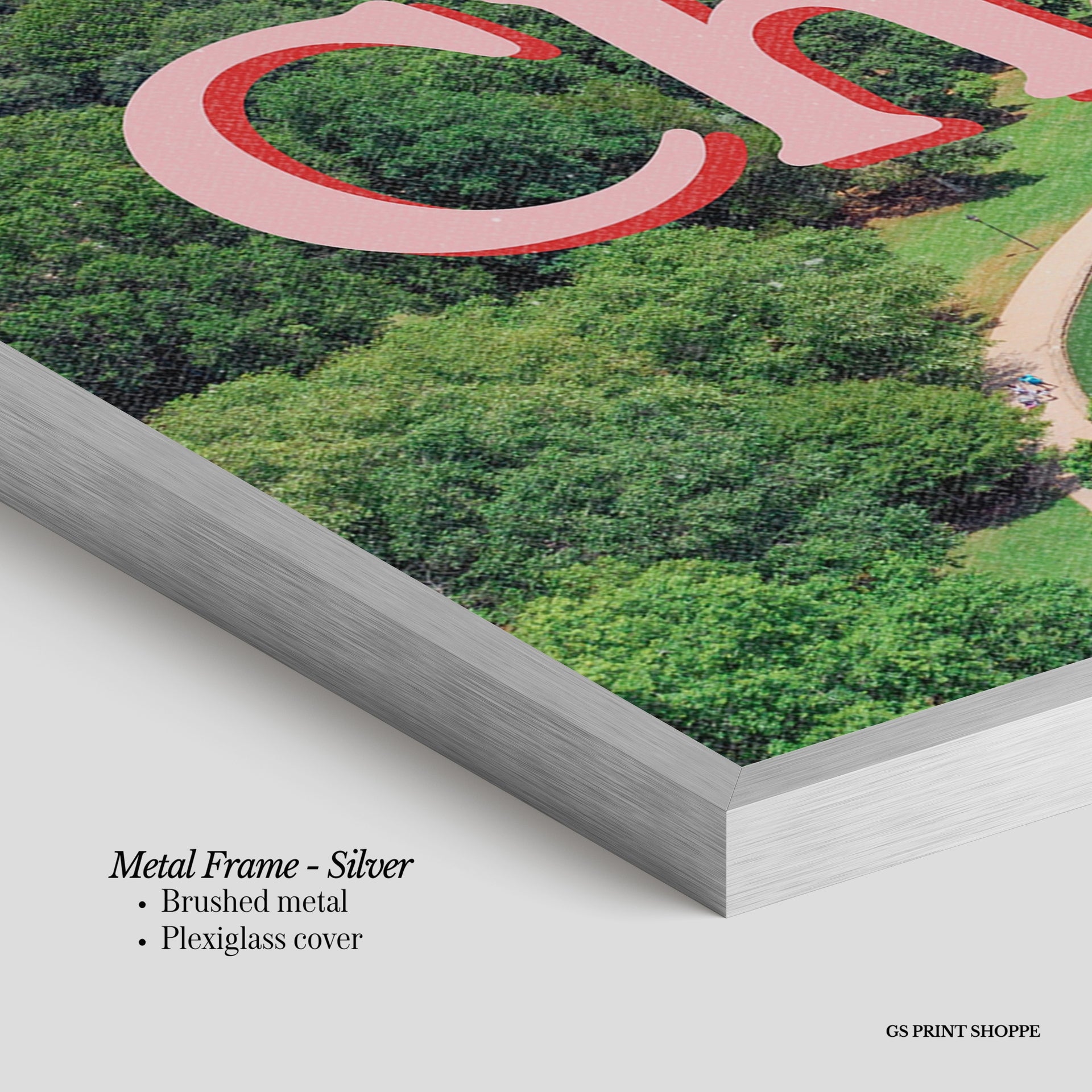 Metal Frame: Sleek and modern, our metal frame is crafted with brushed metal for a polished finish. It comes with durable plexiglass and sturdy metal hangers for horizontal or vertical display.