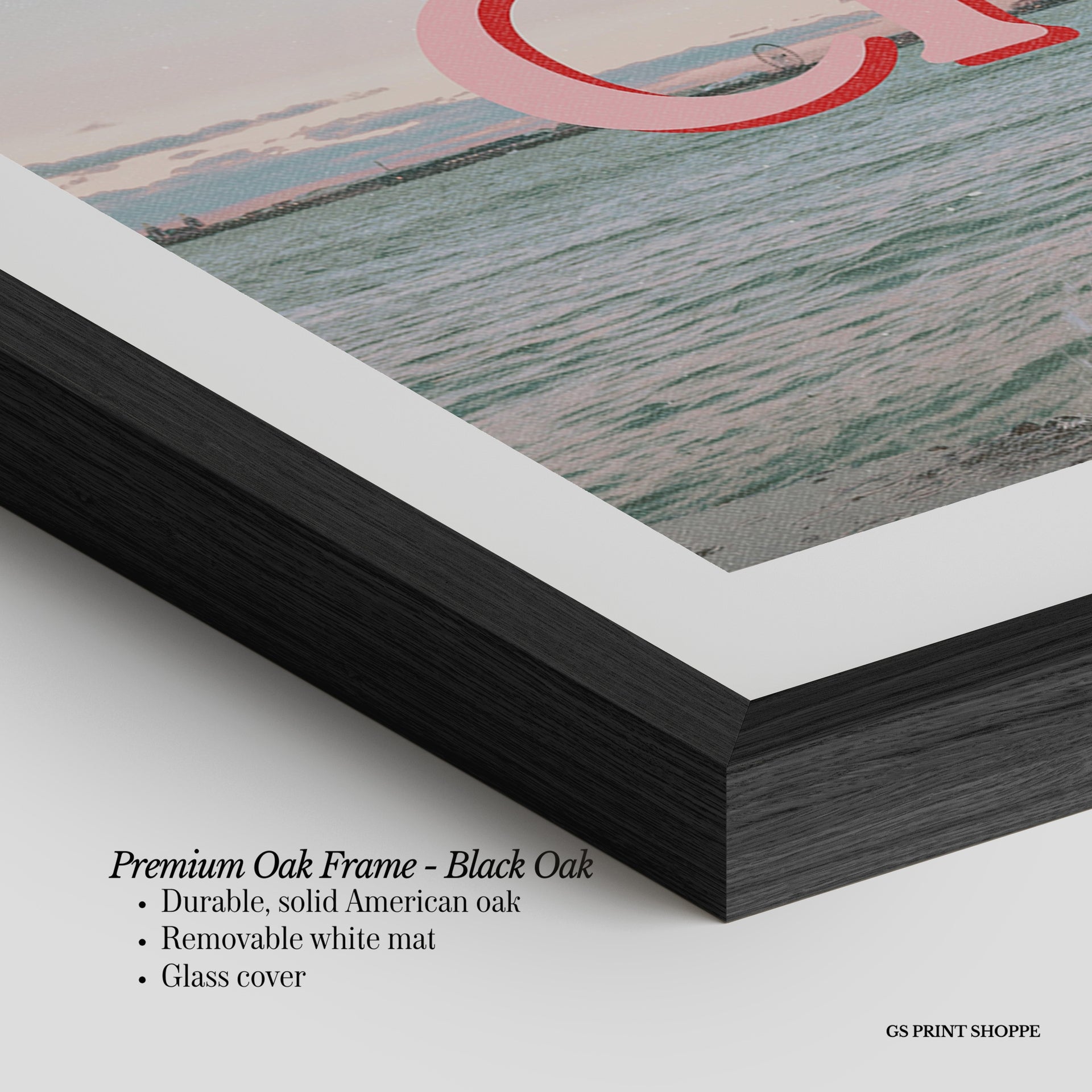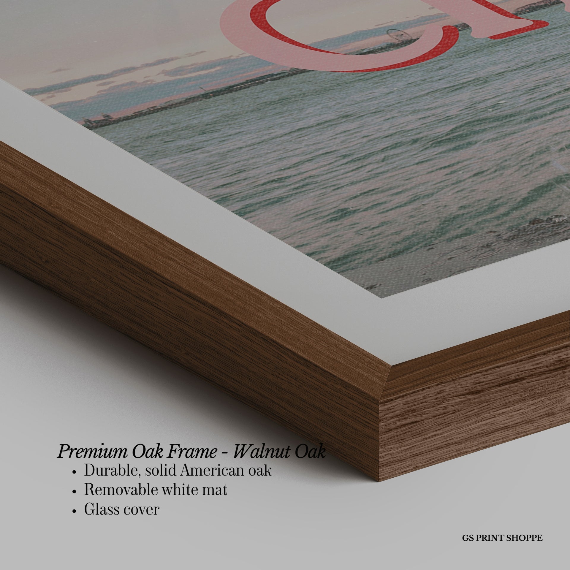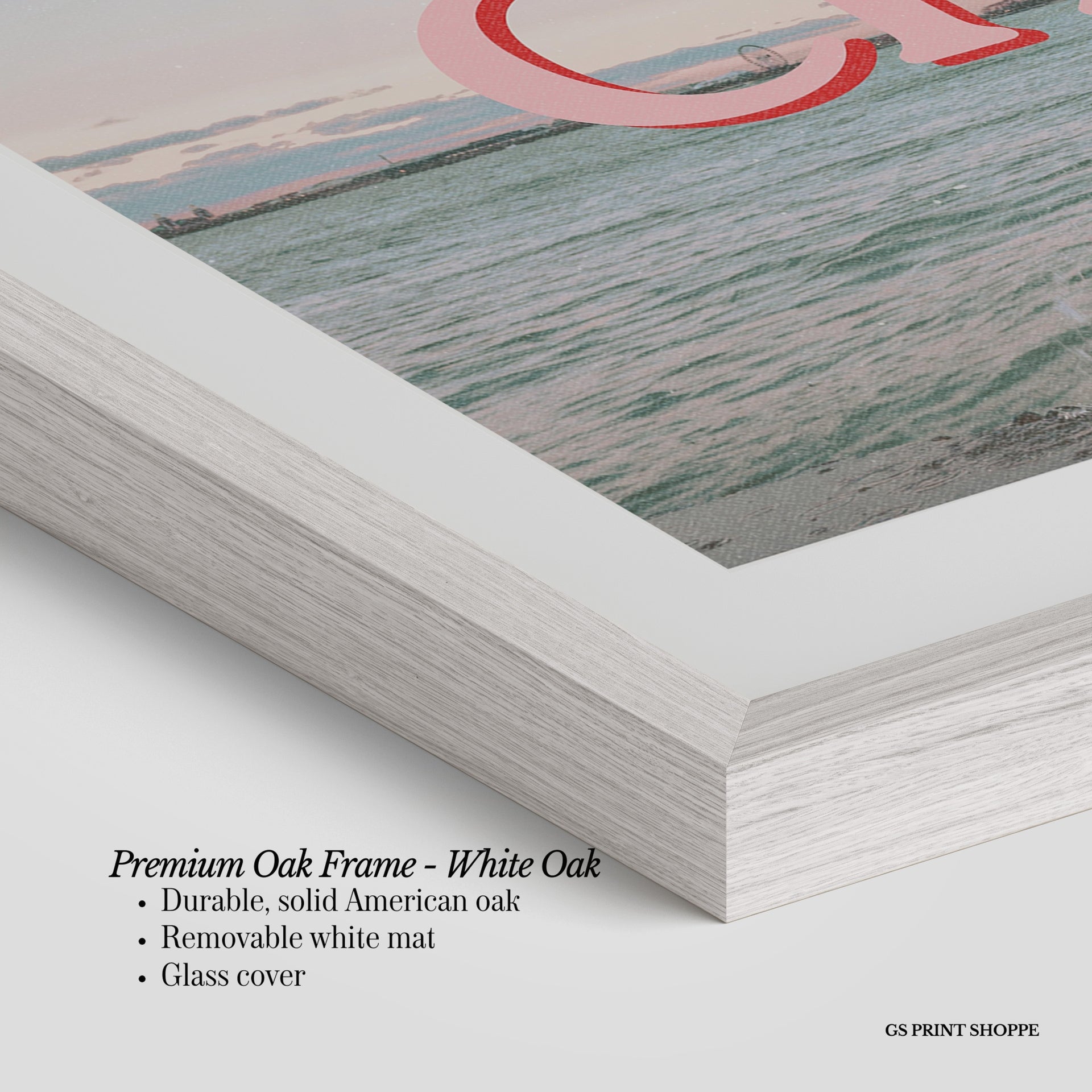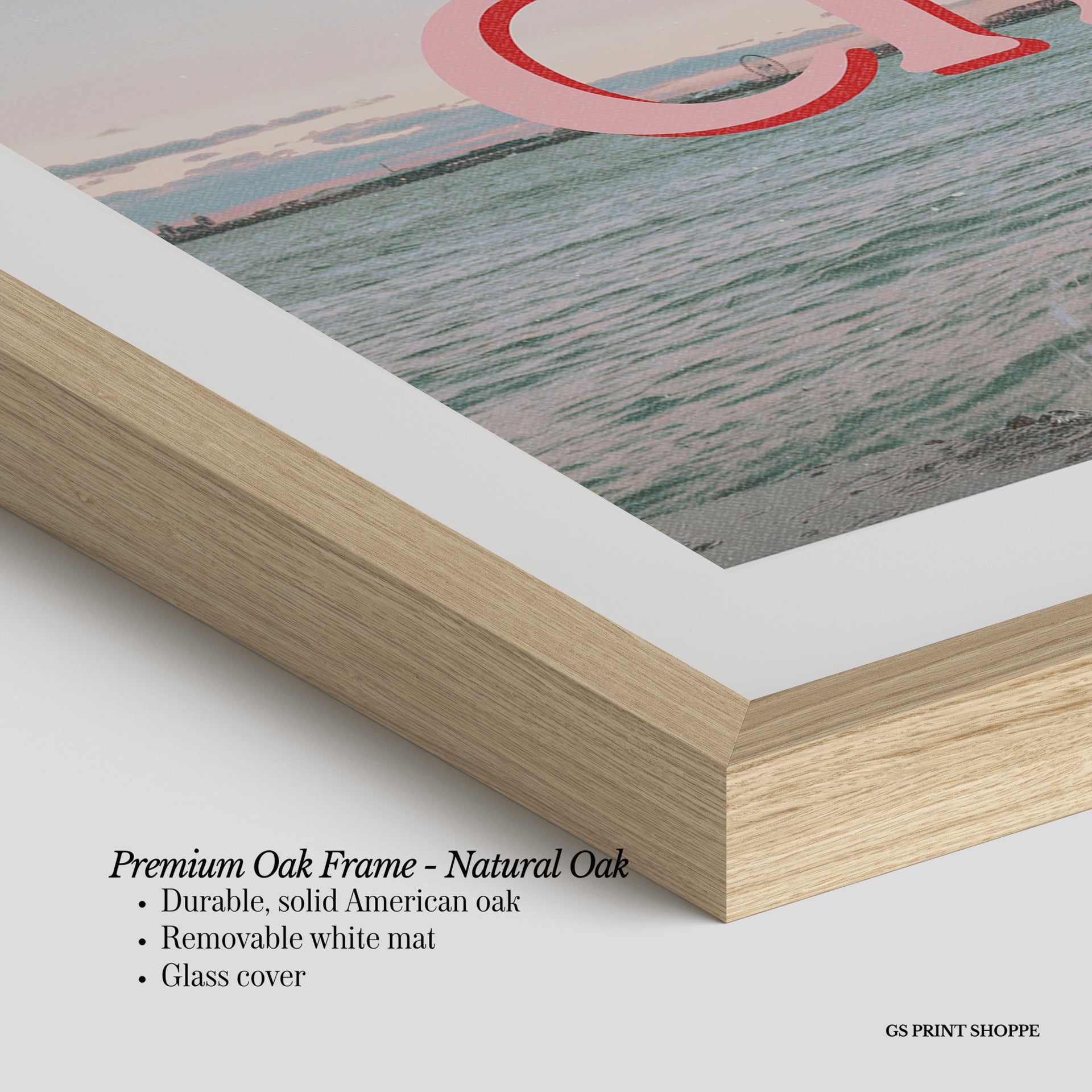 Premium Oak Frame: Our premium oak frame is crafted from solid American oak, offering a warm, natural feel with a high-end finish. We complete this elevated offering with a bright white removable mat and real glass for a versatile and polished look.