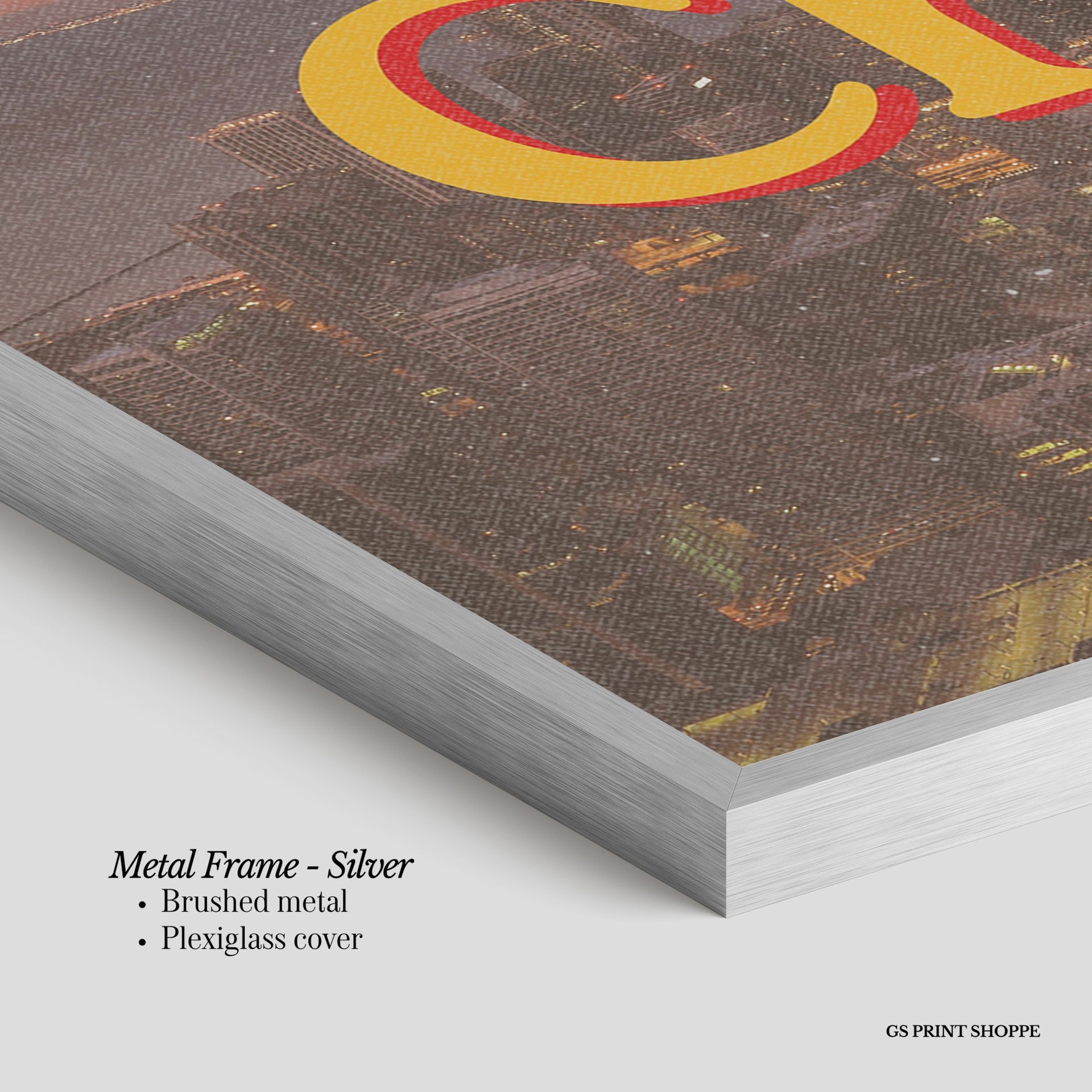 Metal Frame: Sleek and modern, our metal frame is crafted with brushed metal for a polished finish. It comes with durable plexiglass and sturdy metal hangers for horizontal or vertical display.