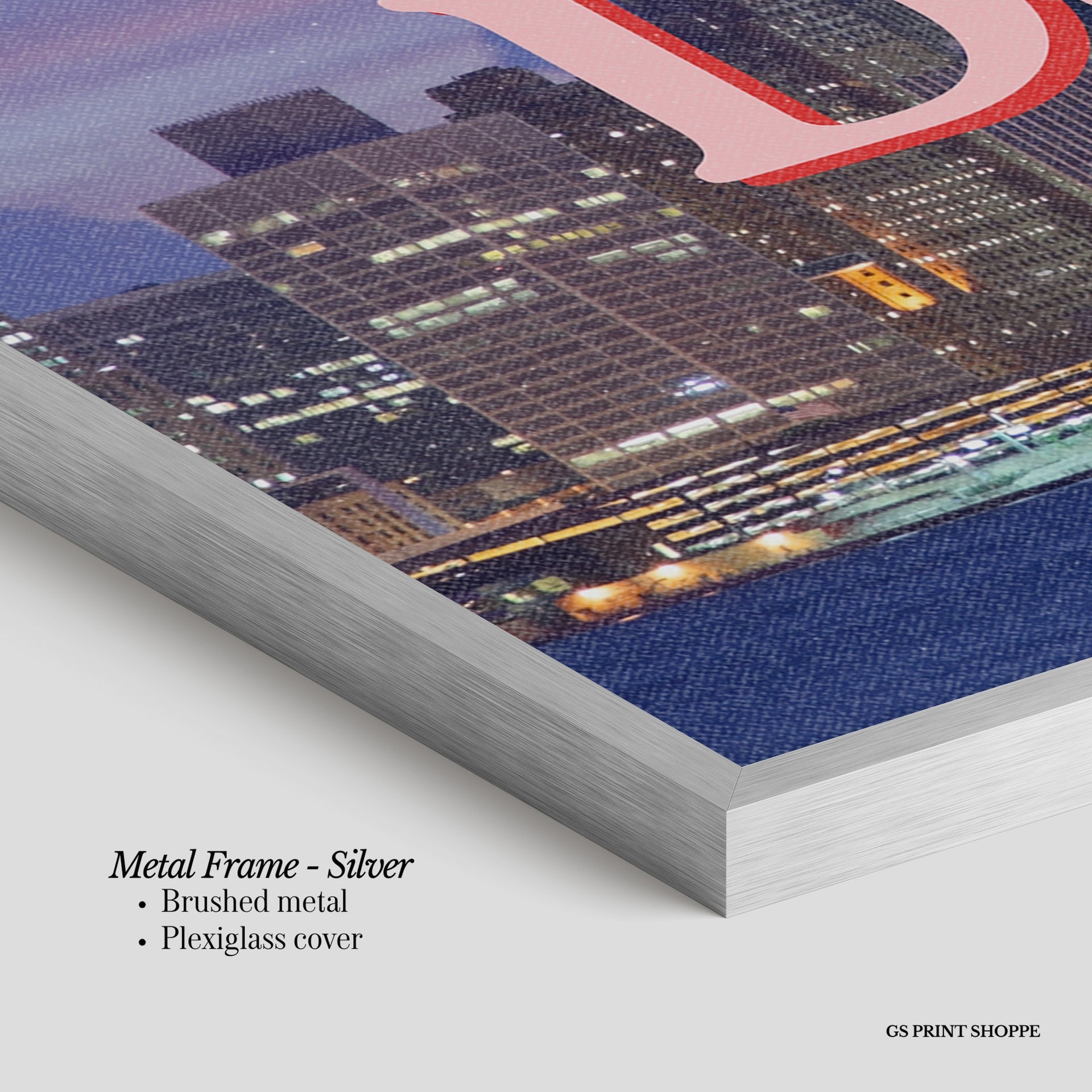 Metal Frame: Sleek and modern, our metal frame is crafted with brushed metal for a polished finish. It comes with durable plexiglass and sturdy metal hangers for horizontal or vertical display.