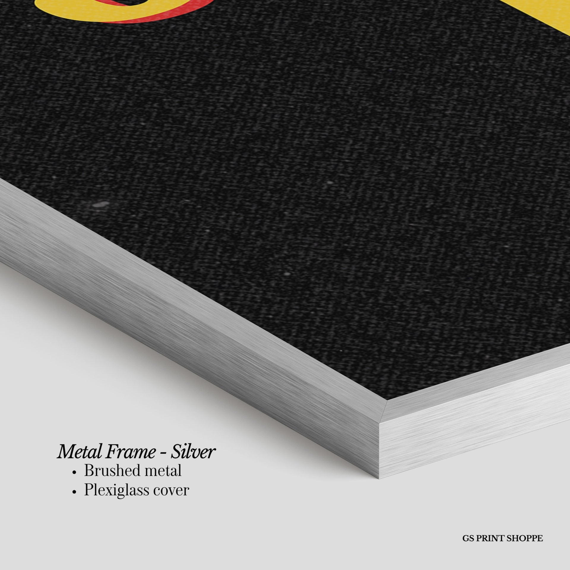 Metal Frame: Sleek and modern, our metal frame is crafted with brushed metal for a polished finish. It comes with durable plexiglass and sturdy metal hangers for horizontal or vertical display.