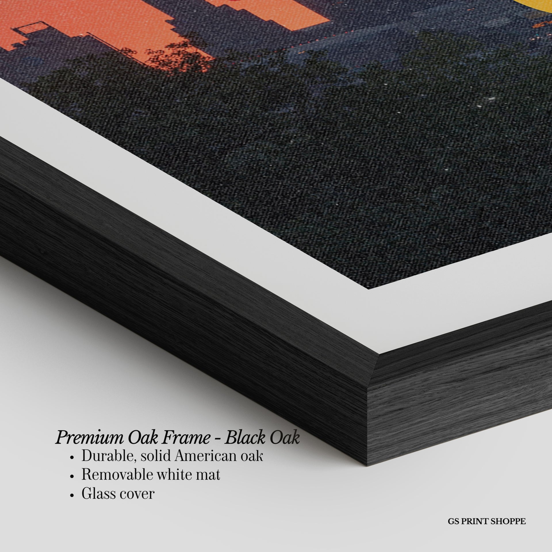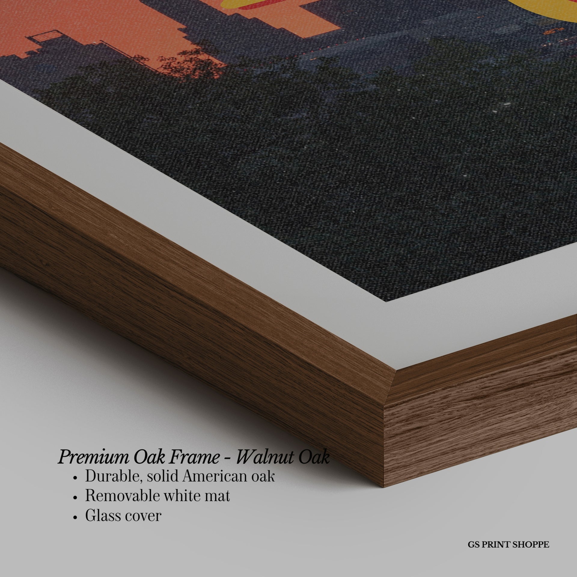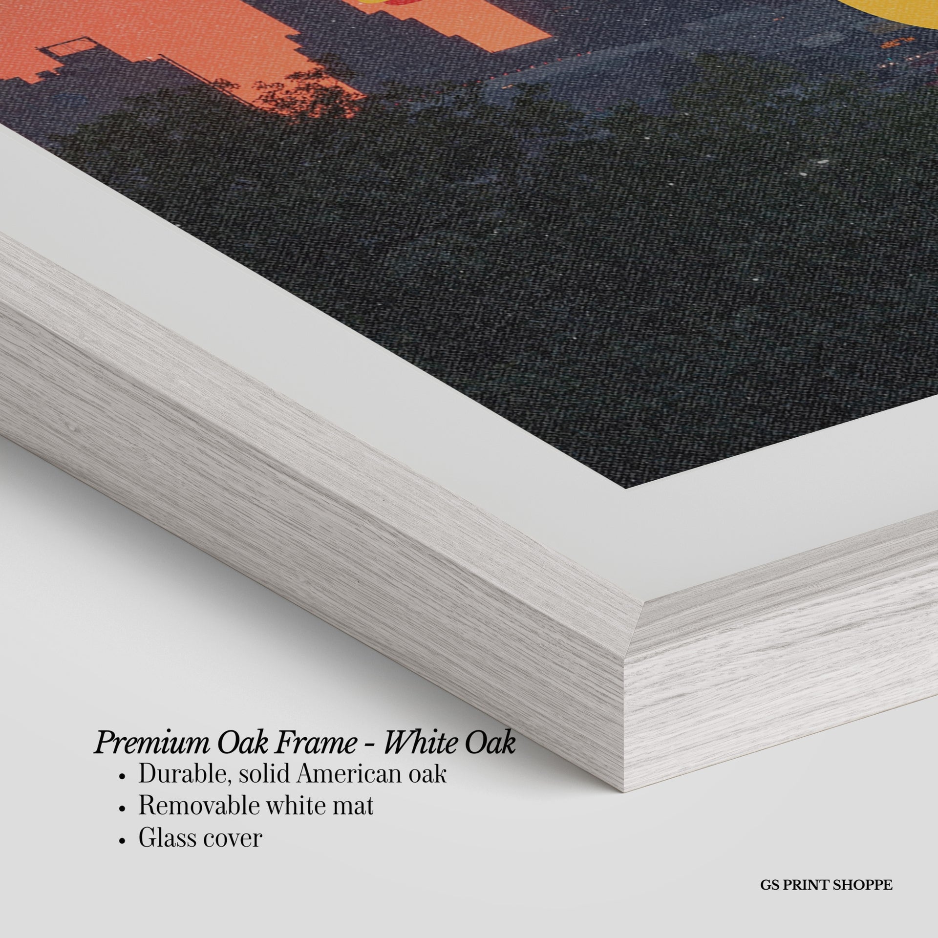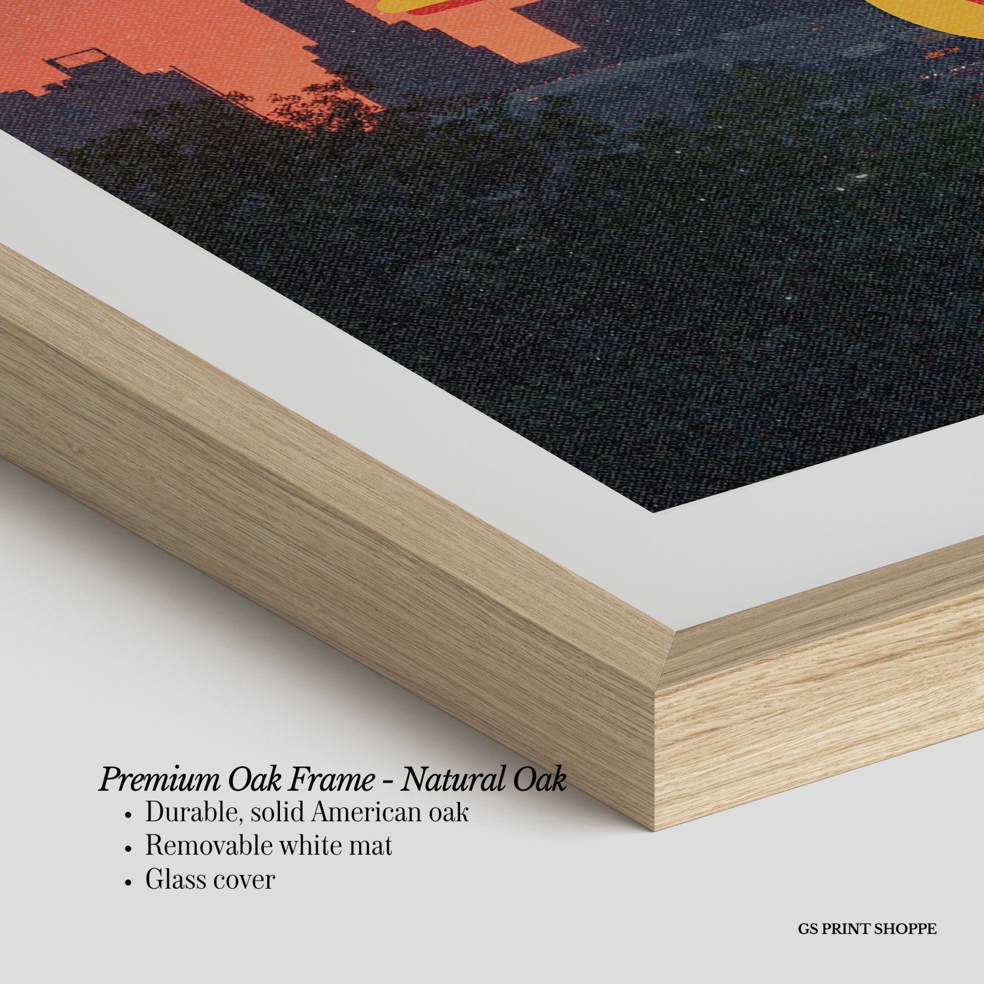 Premium Oak Frame: Our premium oak frame is crafted from solid American oak, offering a warm, natural feel with a high-end finish. We complete this elevated offering with a bright white removable mat and real glass for a versatile and polished look.
