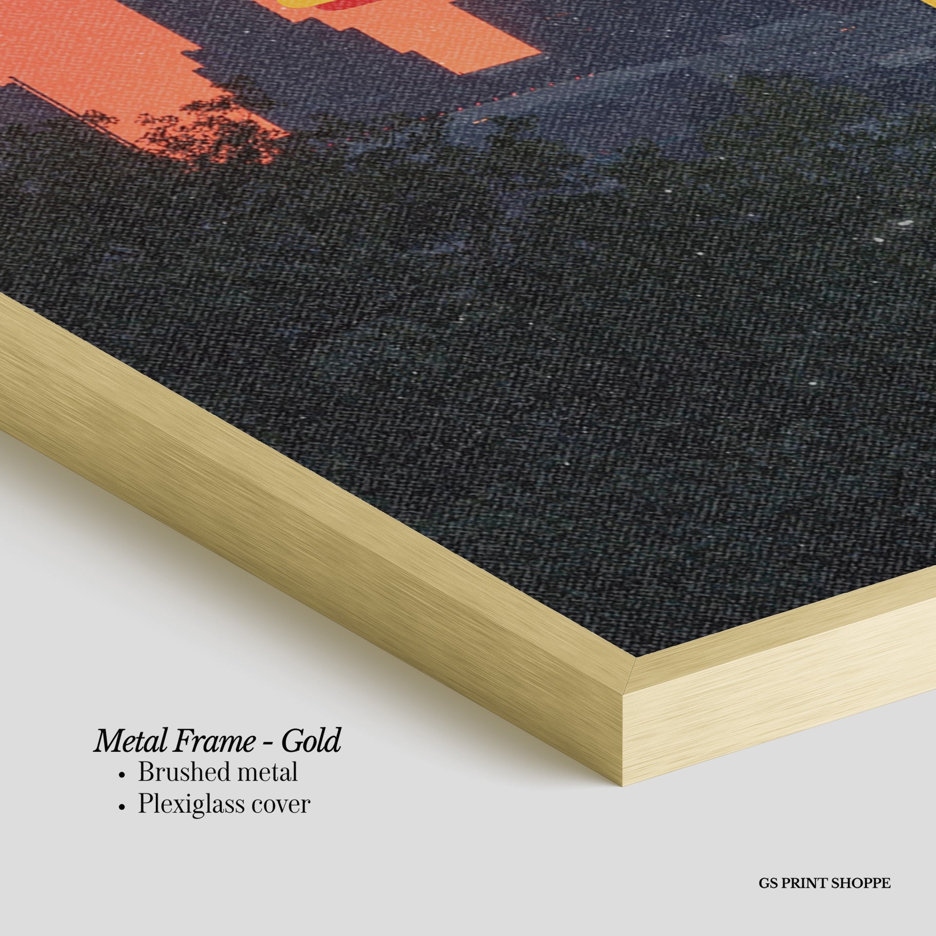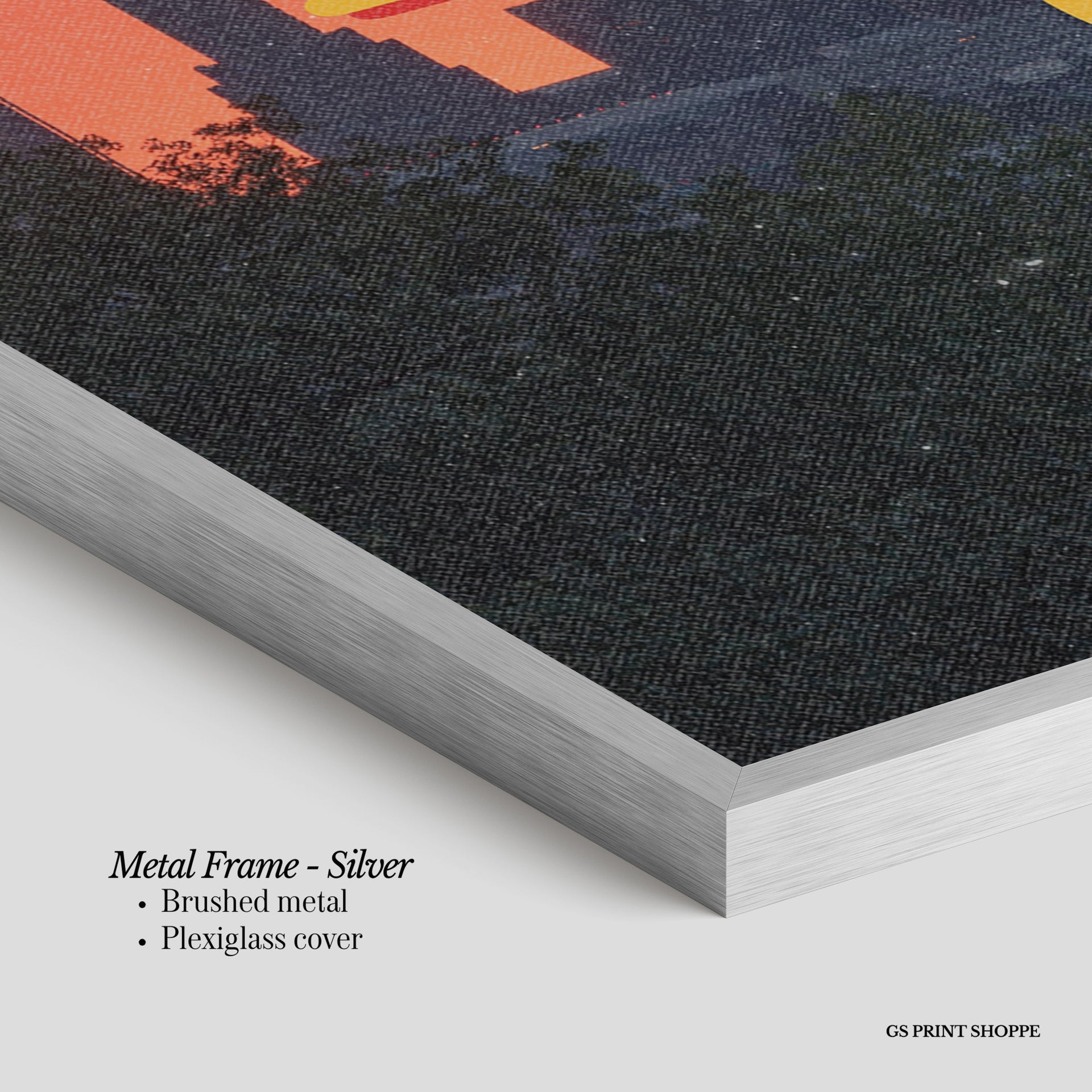 Metal Frame: Sleek and modern, our metal frame is crafted with brushed metal for a polished finish. It comes with durable plexiglass and sturdy metal hangers for horizontal or vertical display.