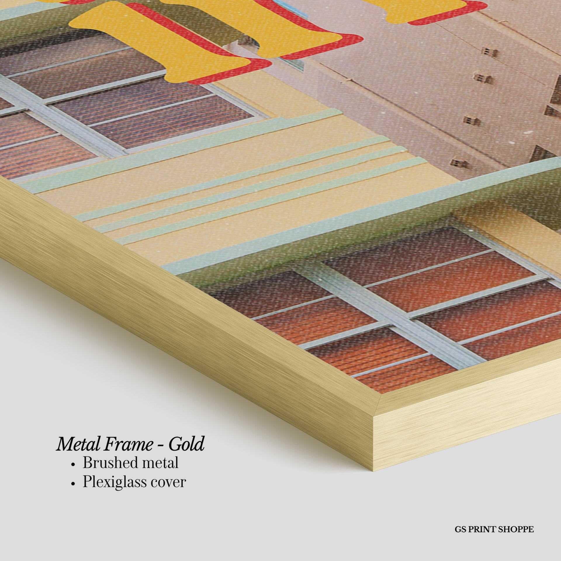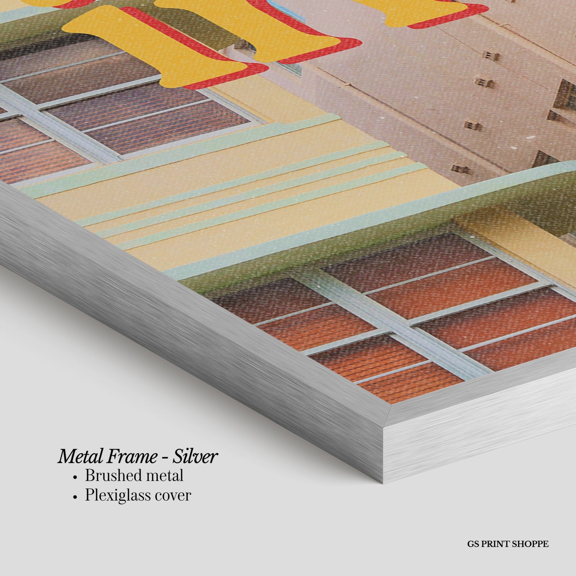 Metal Frame: Sleek and modern, our metal frame is crafted with brushed metal for a polished finish. It comes with durable plexiglass and sturdy metal hangers for horizontal or vertical display.