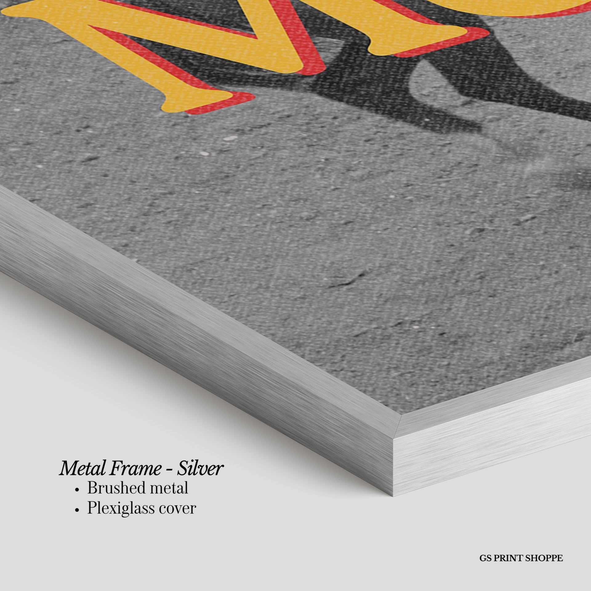 Metal Frame: Sleek and modern, our metal frame is crafted with brushed metal for a polished finish. It comes with durable plexiglass and sturdy metal hangers for horizontal or vertical display.