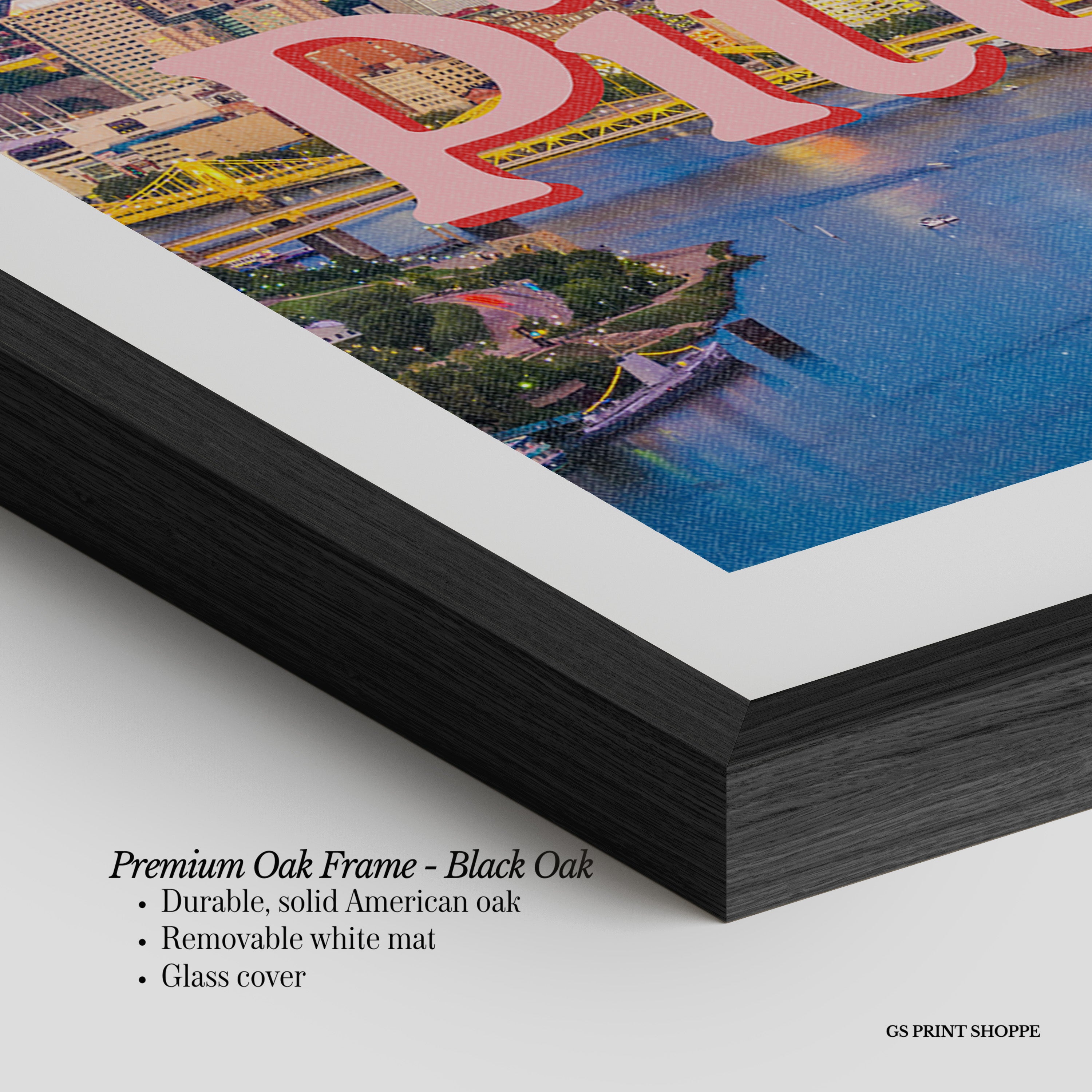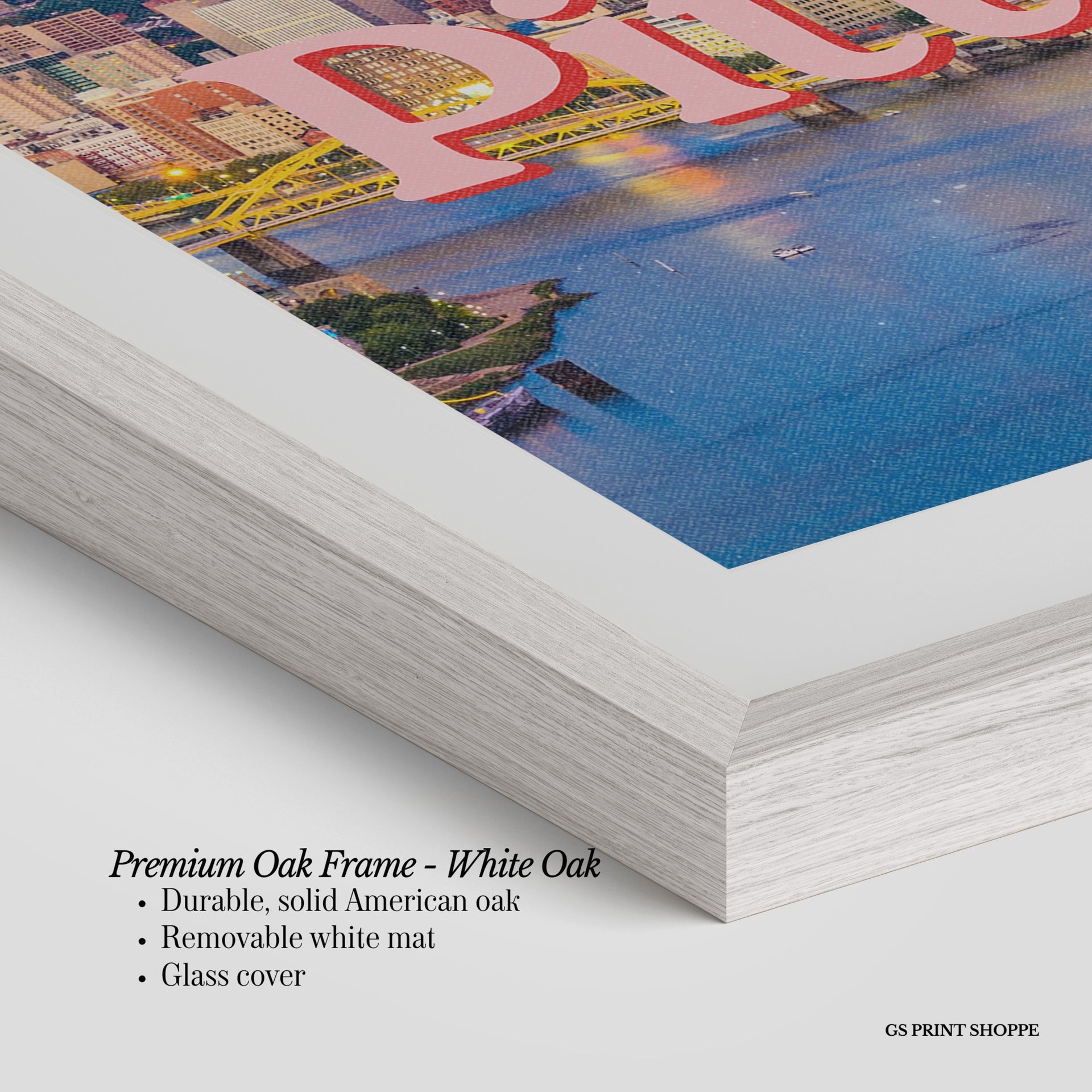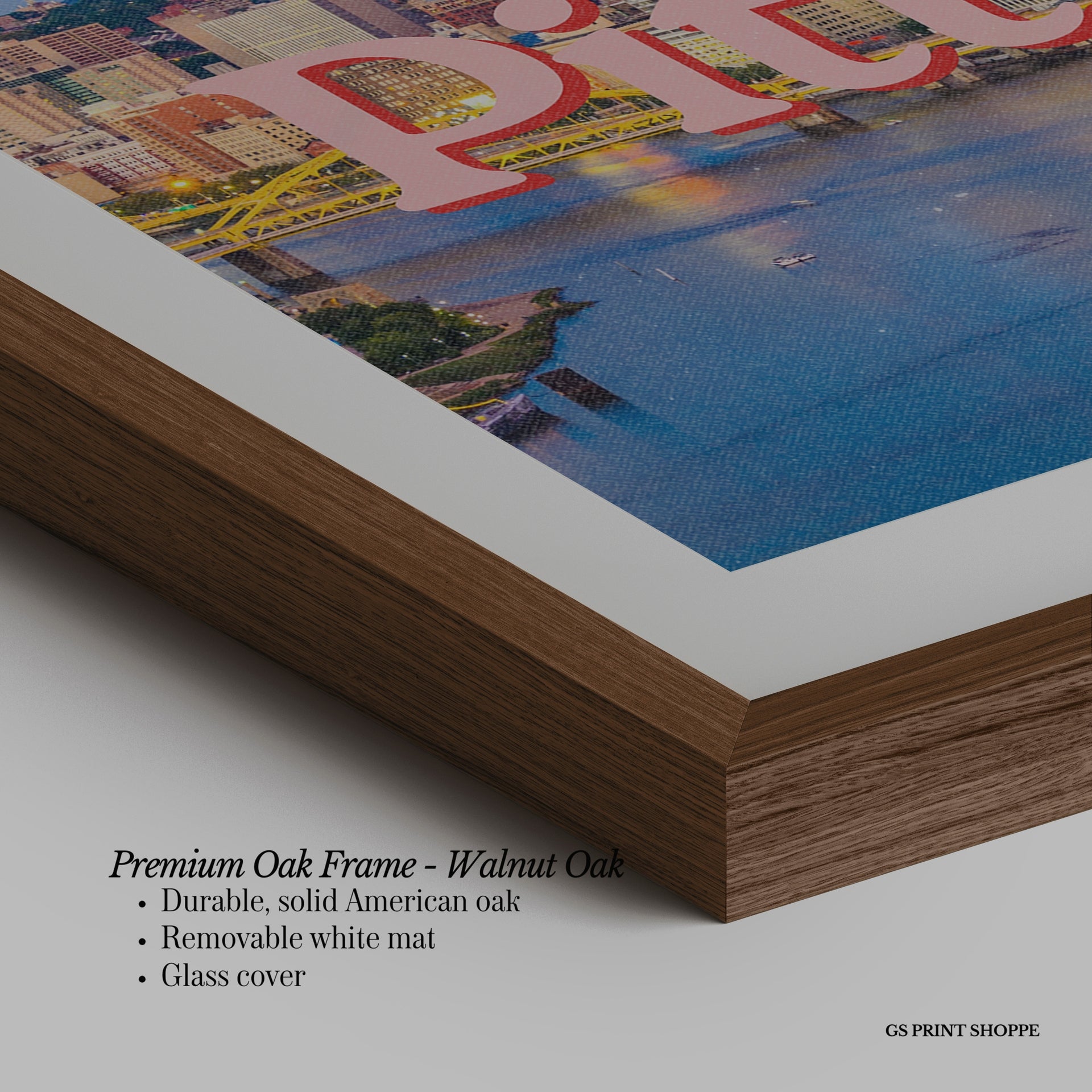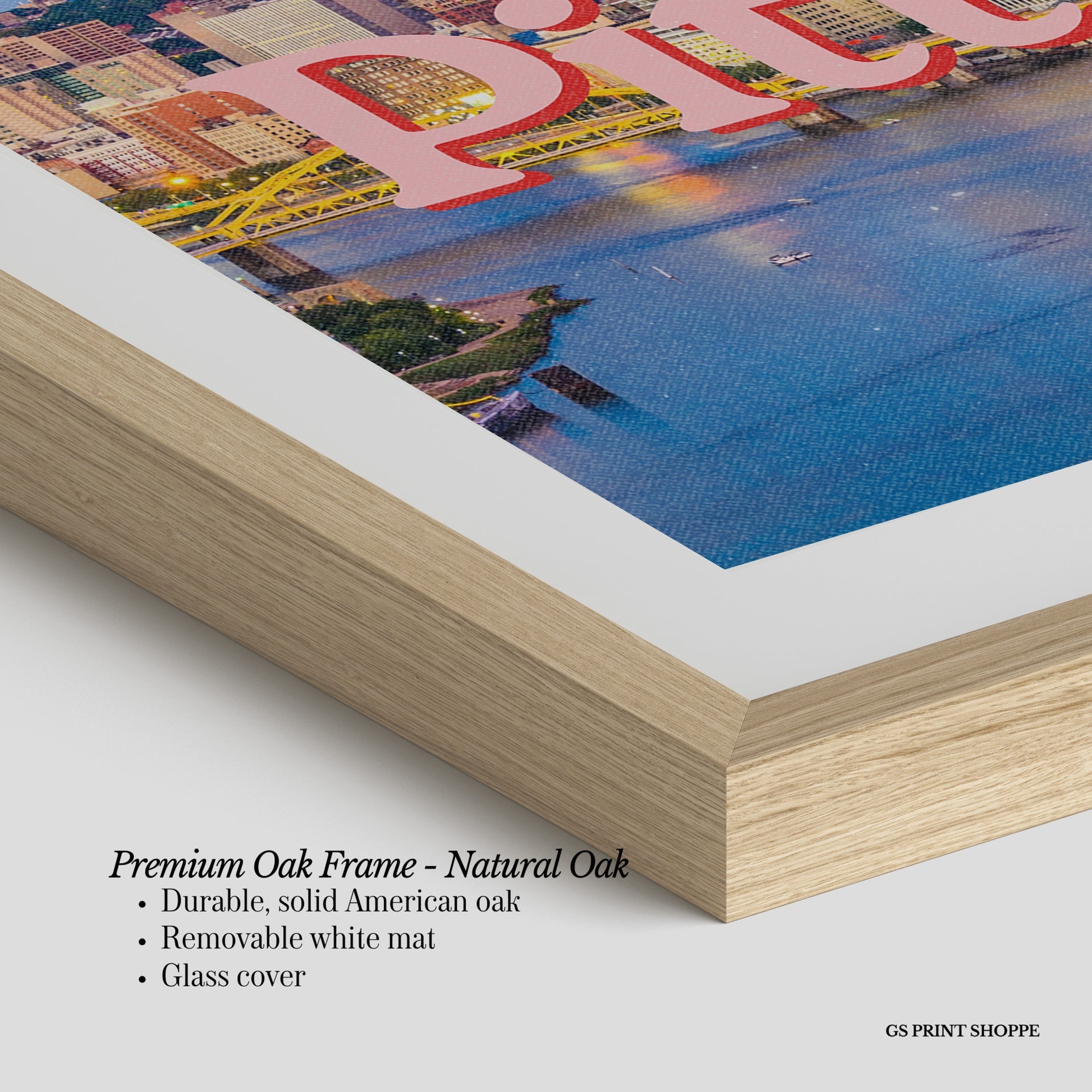 Premium Oak Frame: Our premium oak frame is crafted from solid American oak, offering a warm, natural feel with a high-end finish. We complete this elevated offering with a bright white removable mat and real glass for a versatile and polished look.