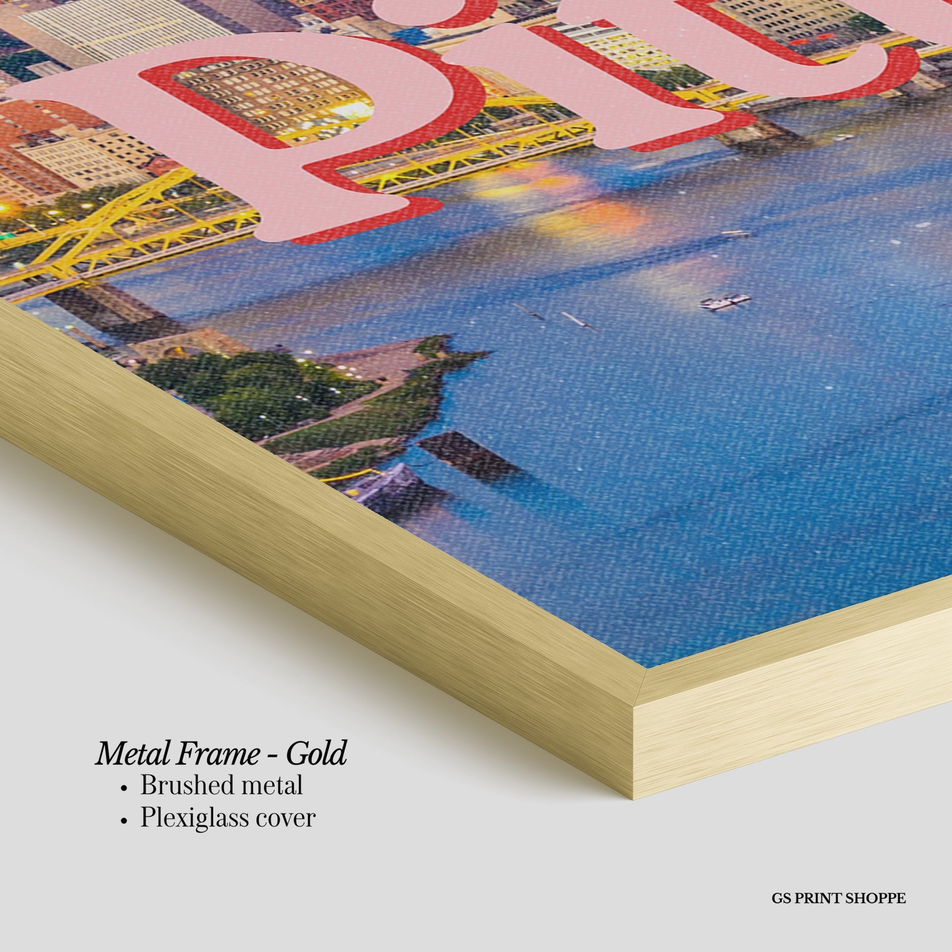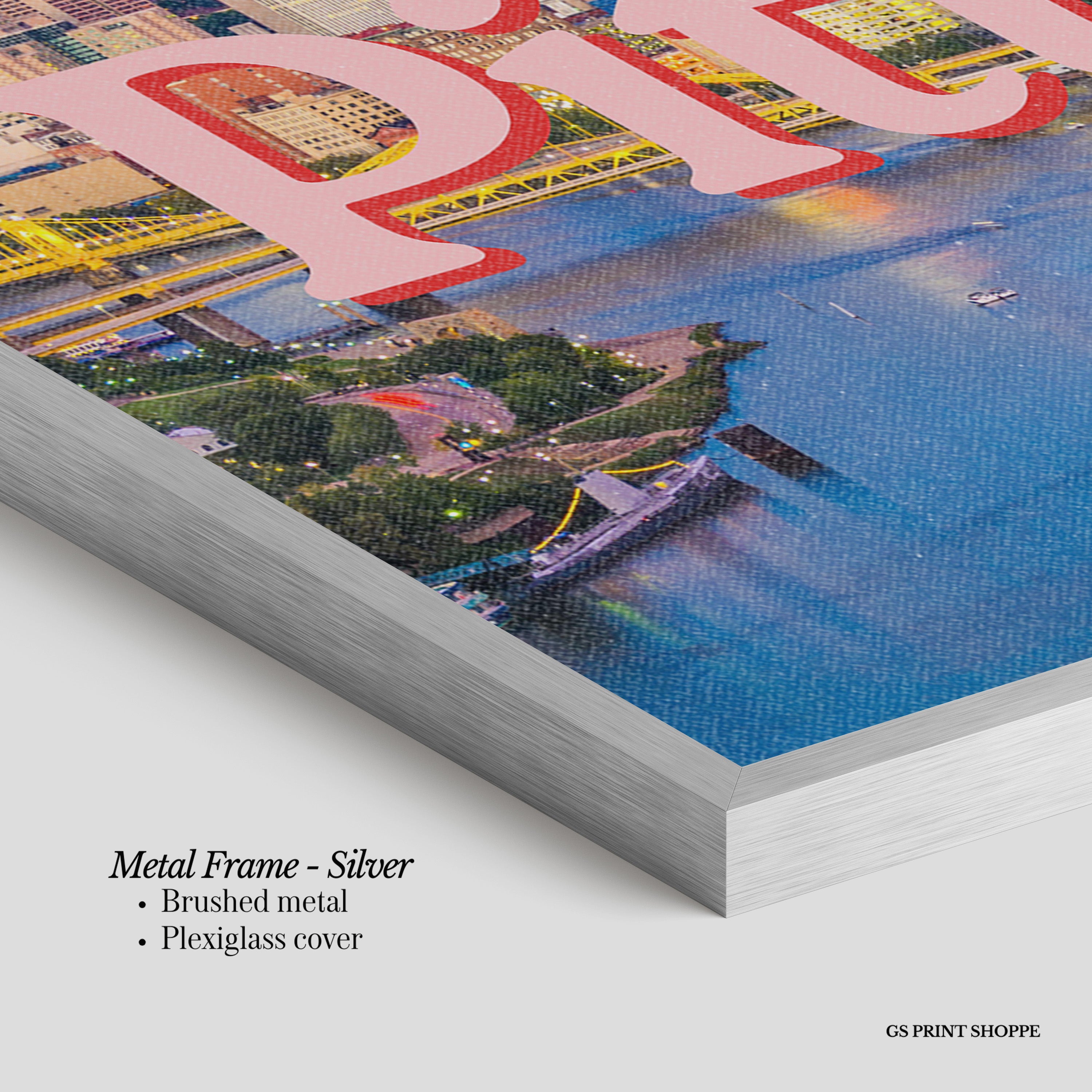 Metal Frame: Sleek and modern, our metal frame is crafted with brushed metal for a polished finish. It comes with durable plexiglass and sturdy metal hangers for horizontal or vertical display.