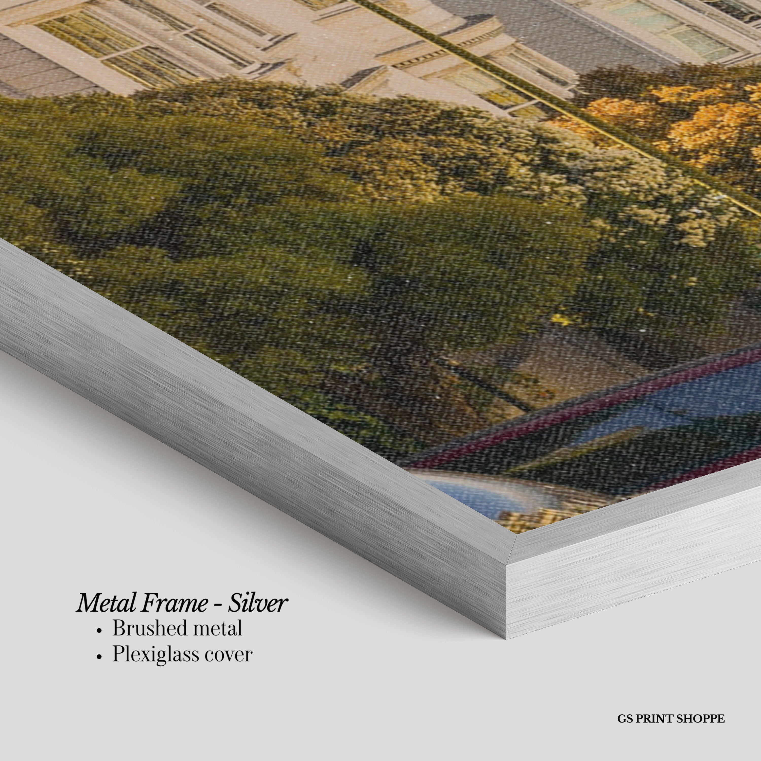 Metal Frame: Sleek and modern, our metal frame is crafted with brushed metal for a polished finish. It comes with durable plexiglass and sturdy metal hangers for horizontal or vertical display.
