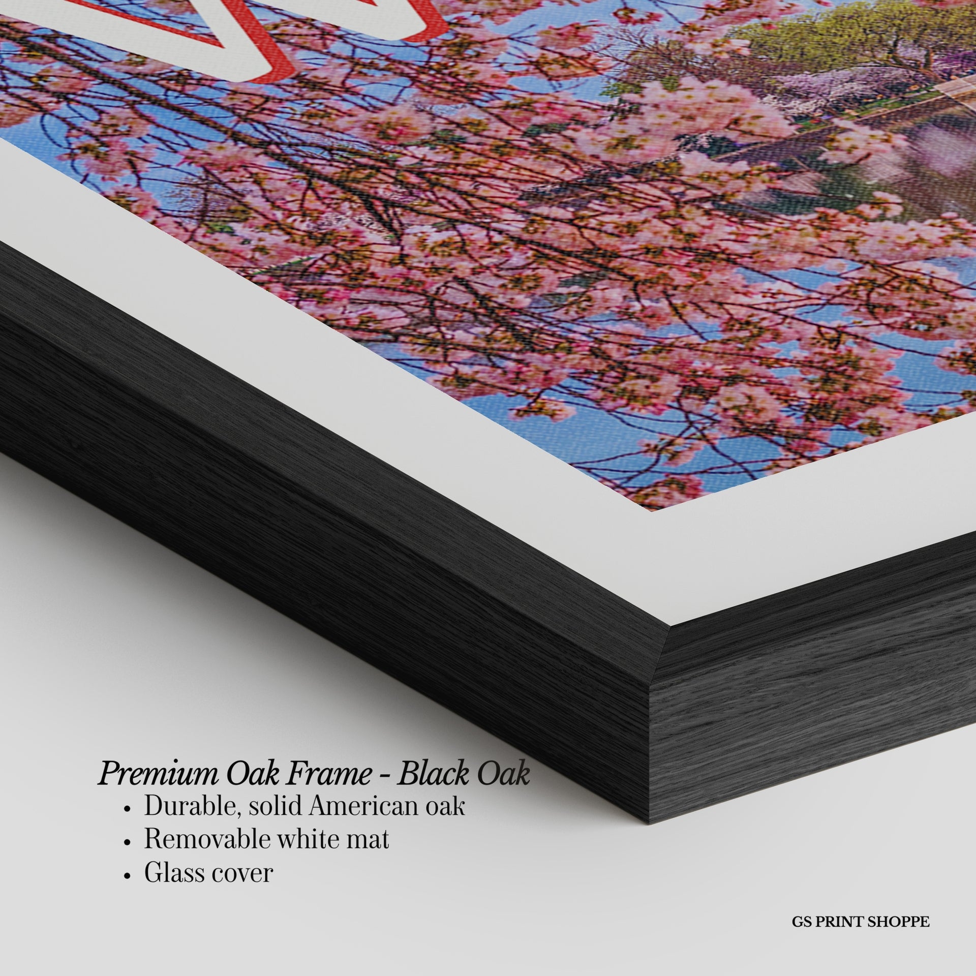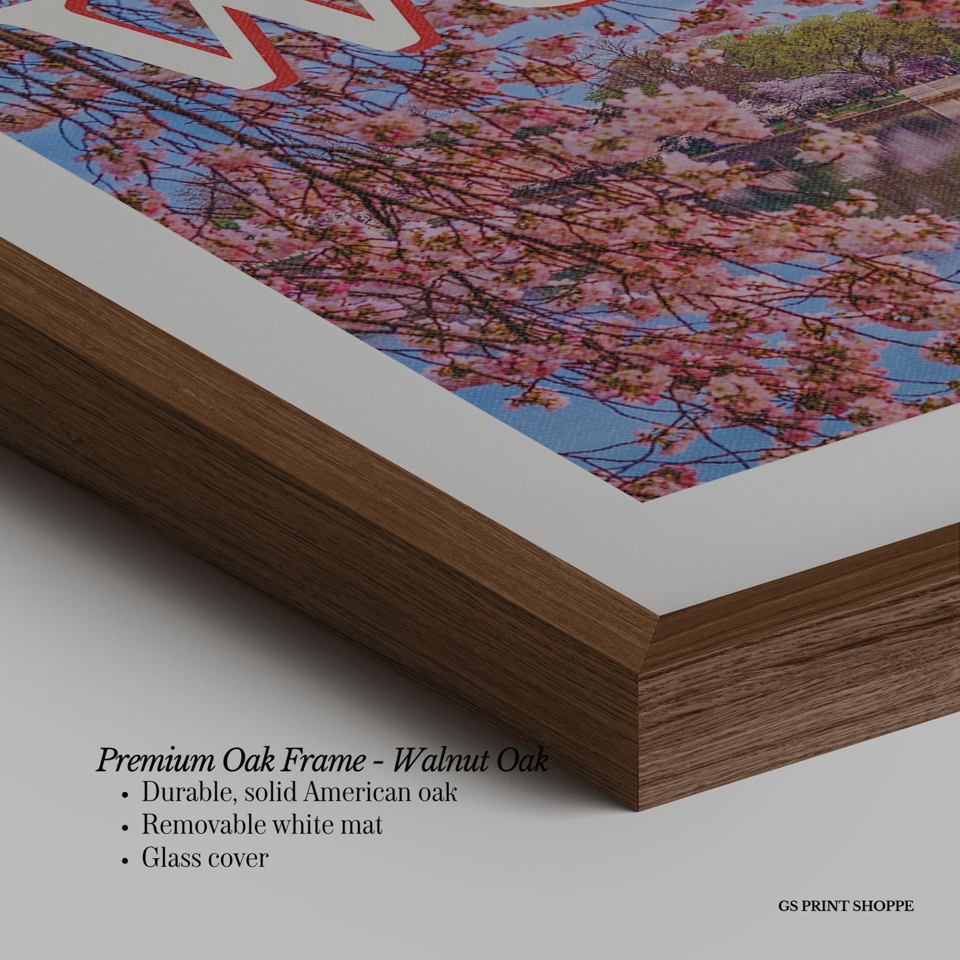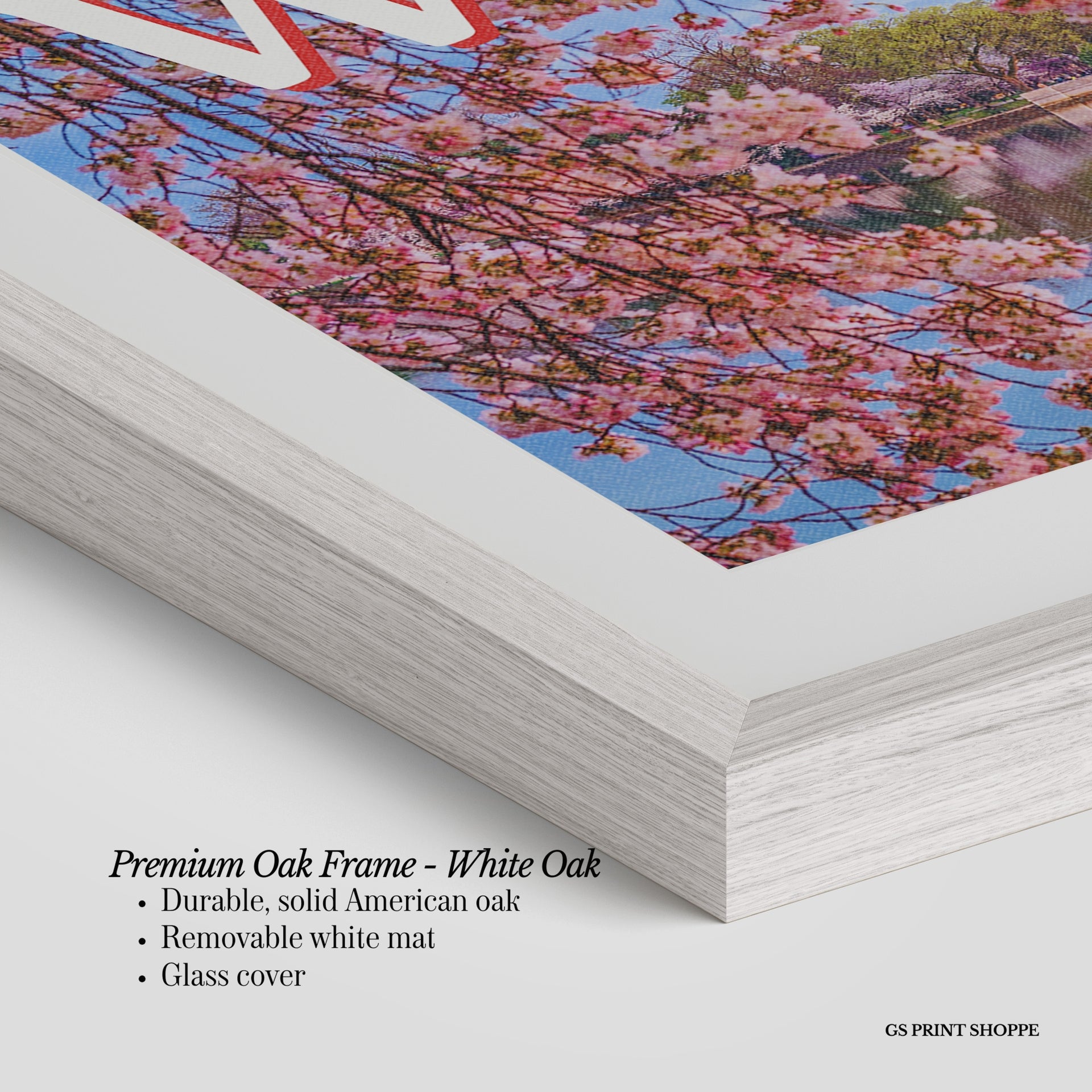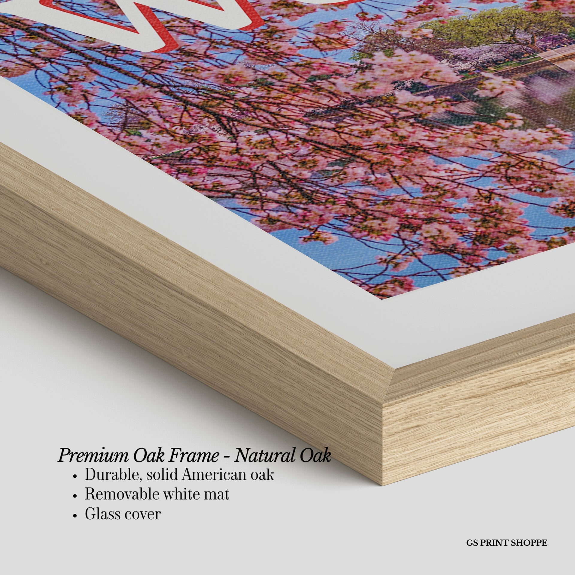 Premium Oak Frame: Our premium oak frame is crafted from solid American oak, offering a warm, natural feel with a high-end finish. We complete this elevated offering with a bright white removable mat and real glass for a versatile and polished look.