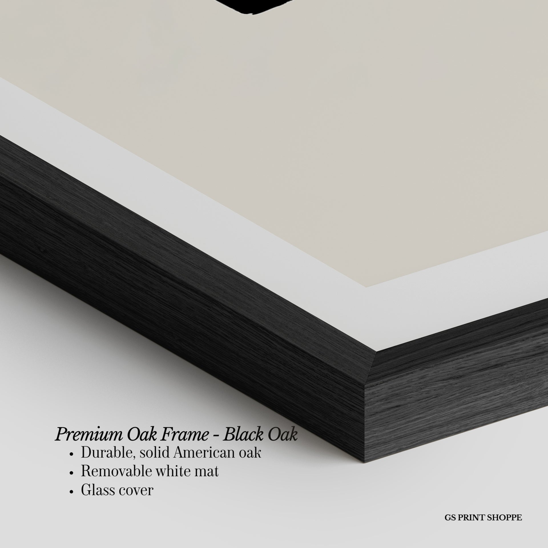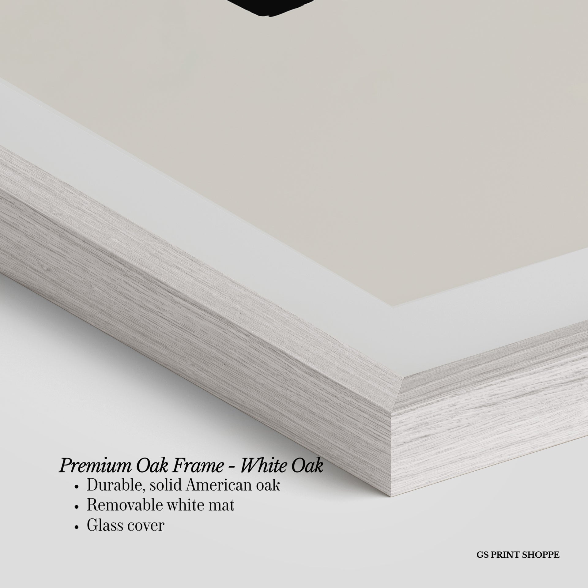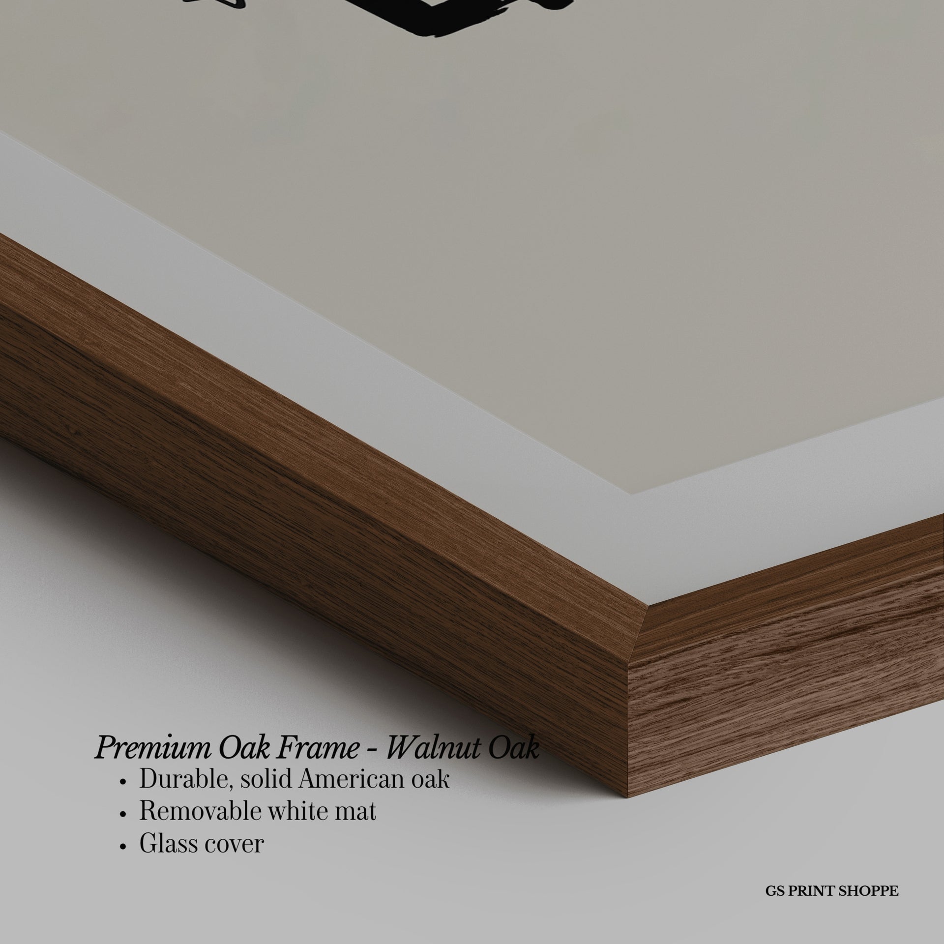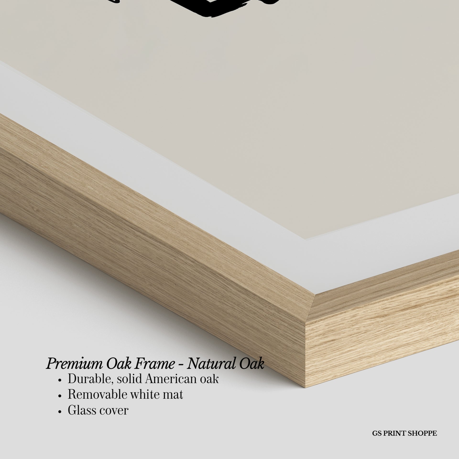 Premium Oak Frame: Our premium oak frame is crafted from solid American oak, offering a warm, natural feel with a high-end finish. We complete this elevated offering with a bright white removable mat and real glass for a versatile and polished look.