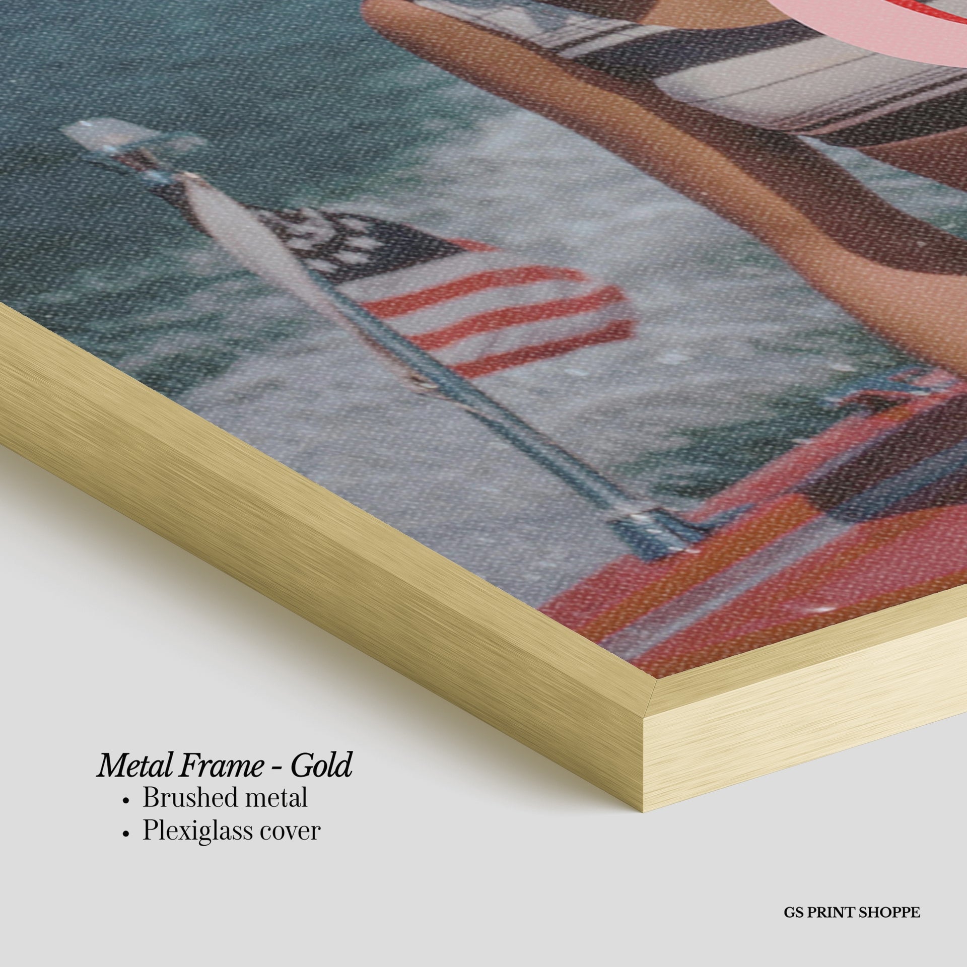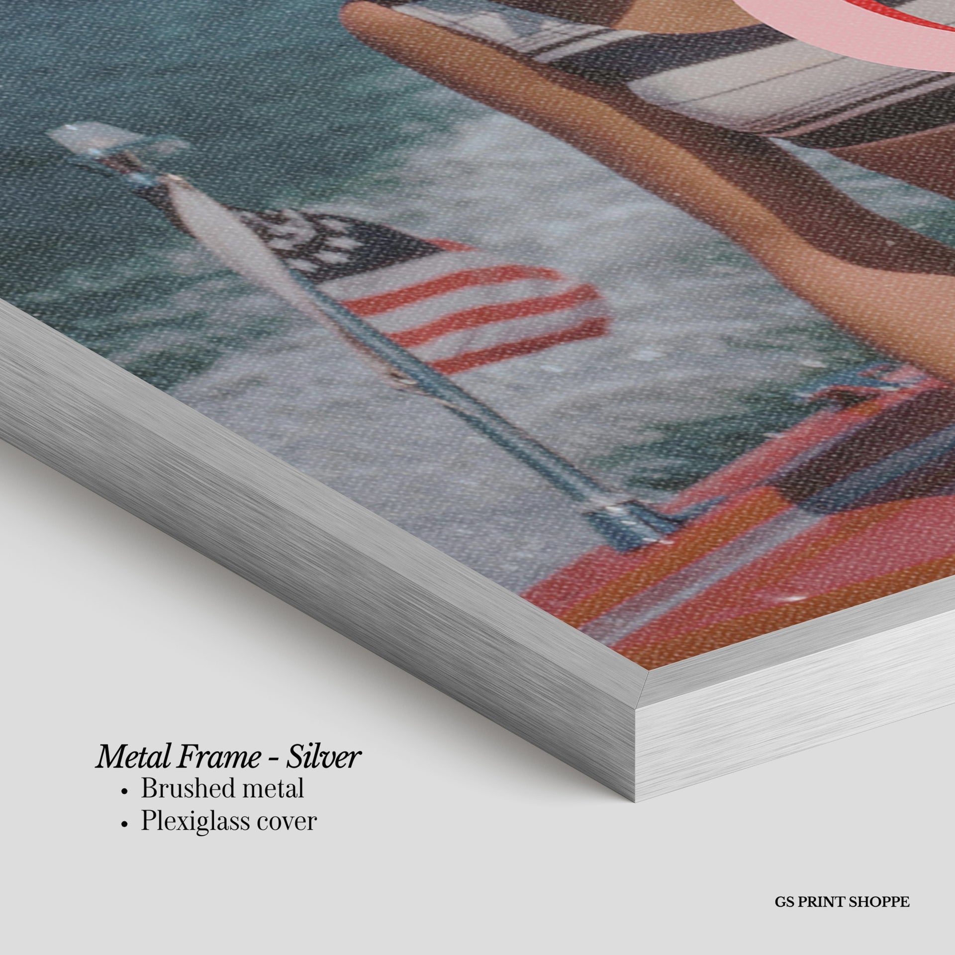 Metal Frame: Sleek and modern, our metal frame is crafted with brushed metal for a polished finish. It comes with durable plexiglass and sturdy metal hangers for horizontal or vertical display.