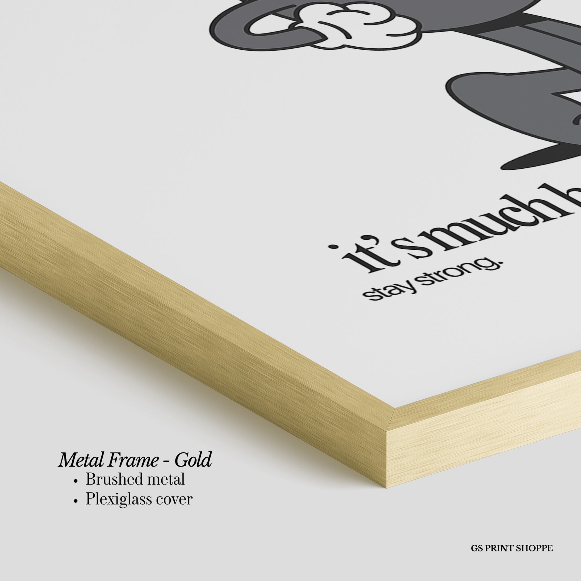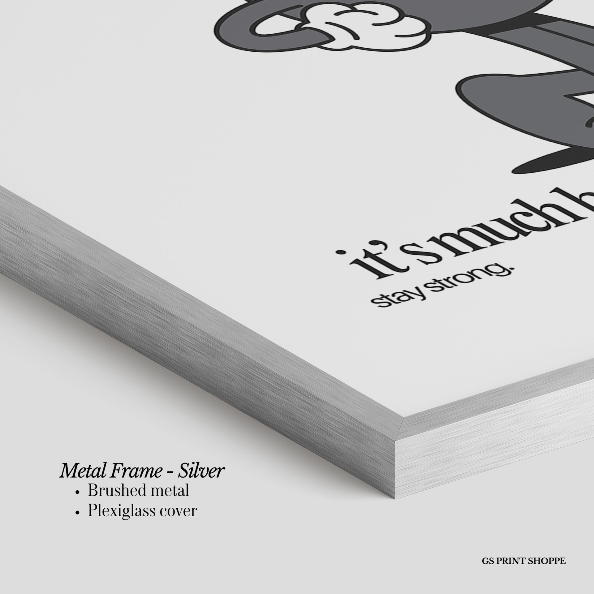 Metal Frame: Sleek and modern, our metal frame is crafted with brushed metal for a polished finish. It comes with durable plexiglass and sturdy metal hangers for horizontal or vertical display.