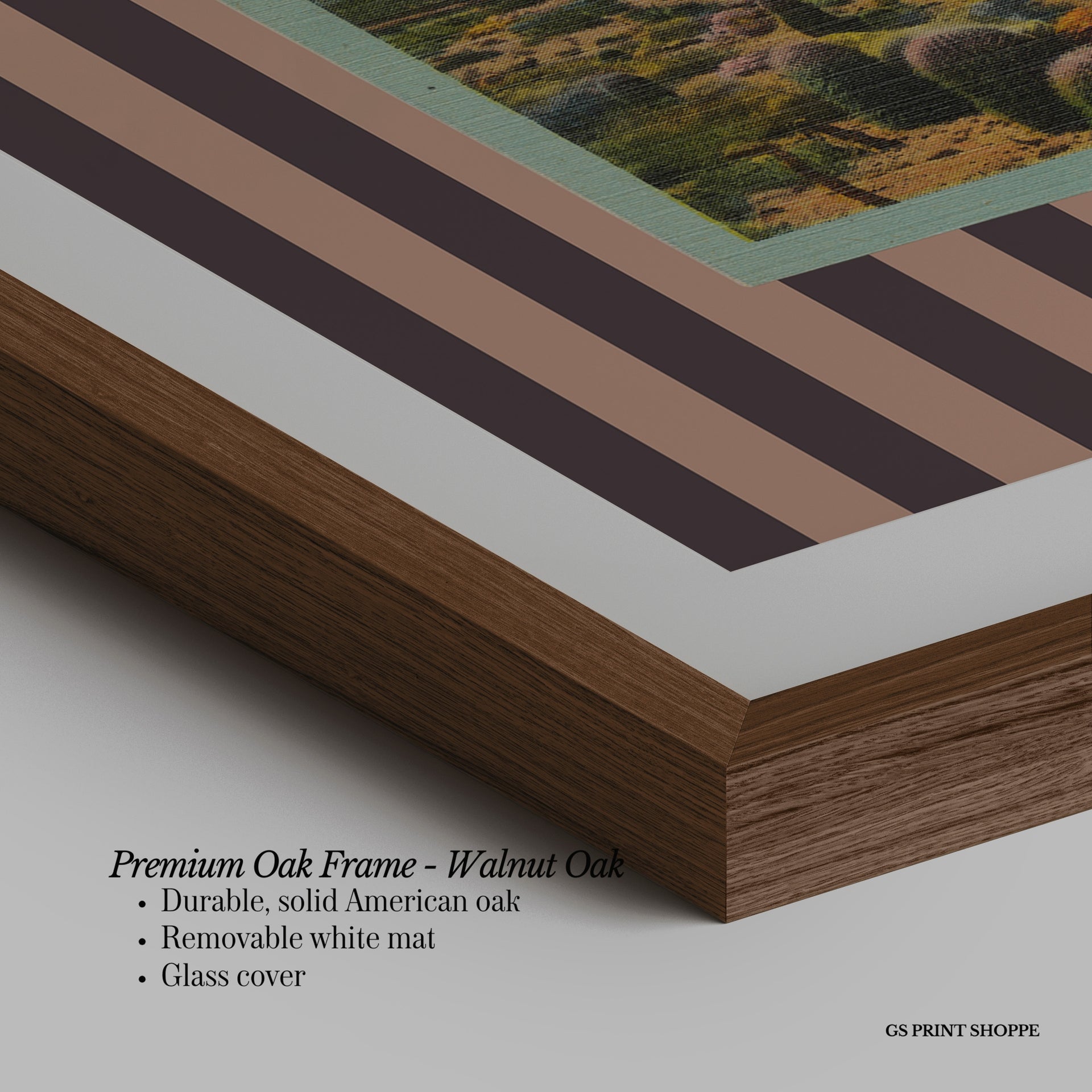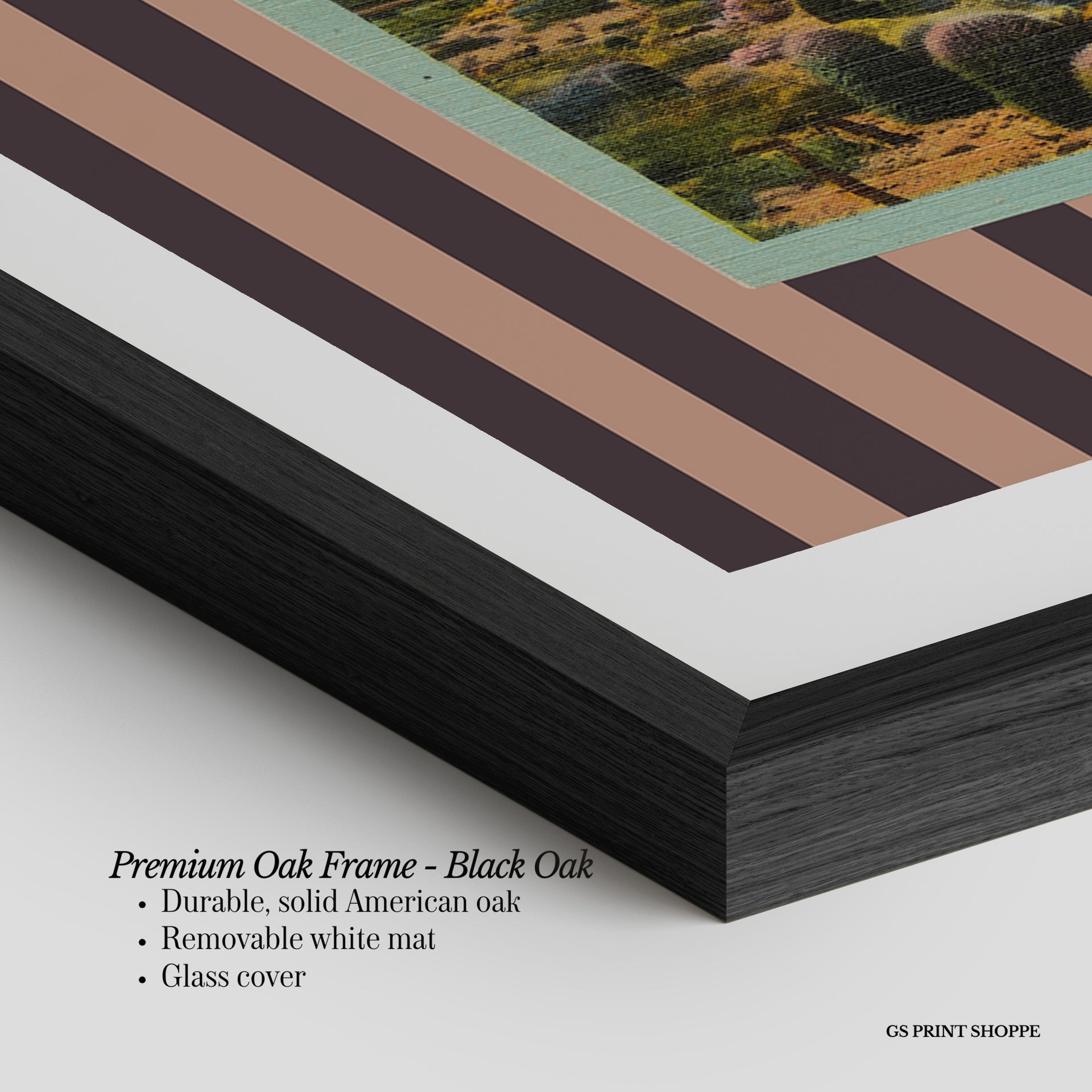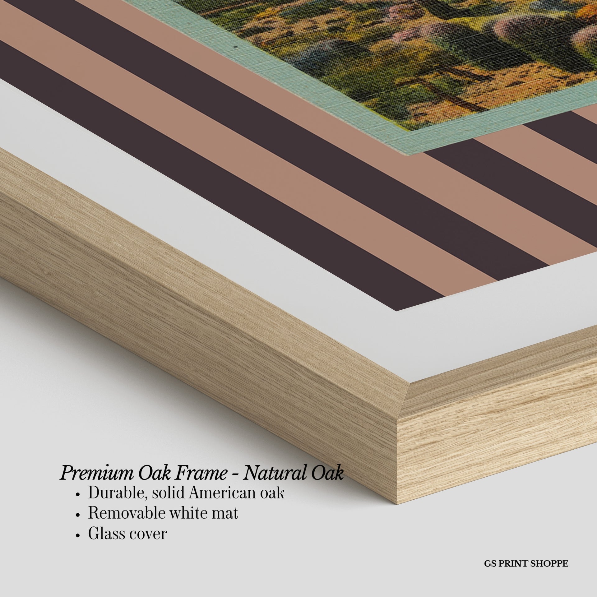Premium Oak Frame: Our premium oak frame is crafted from solid American oak, offering a warm, natural feel with a high-end finish. We complete this elevated offering with a bright white removable mat and real glass for a versatile and polished look.