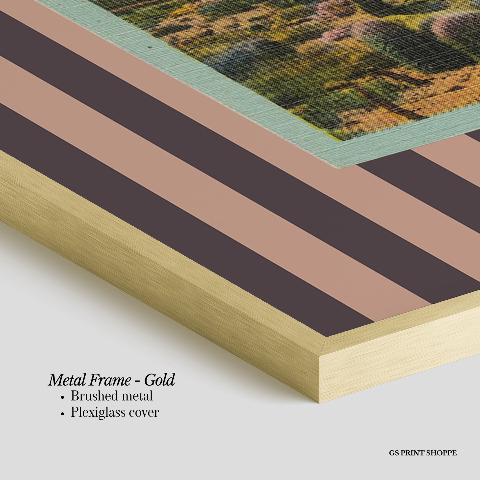 Metal Frame: Sleek and modern, our metal frame is crafted with brushed metal for a polished finish. It comes with durable plexiglass and sturdy metal hangers for horizontal or vertical display.