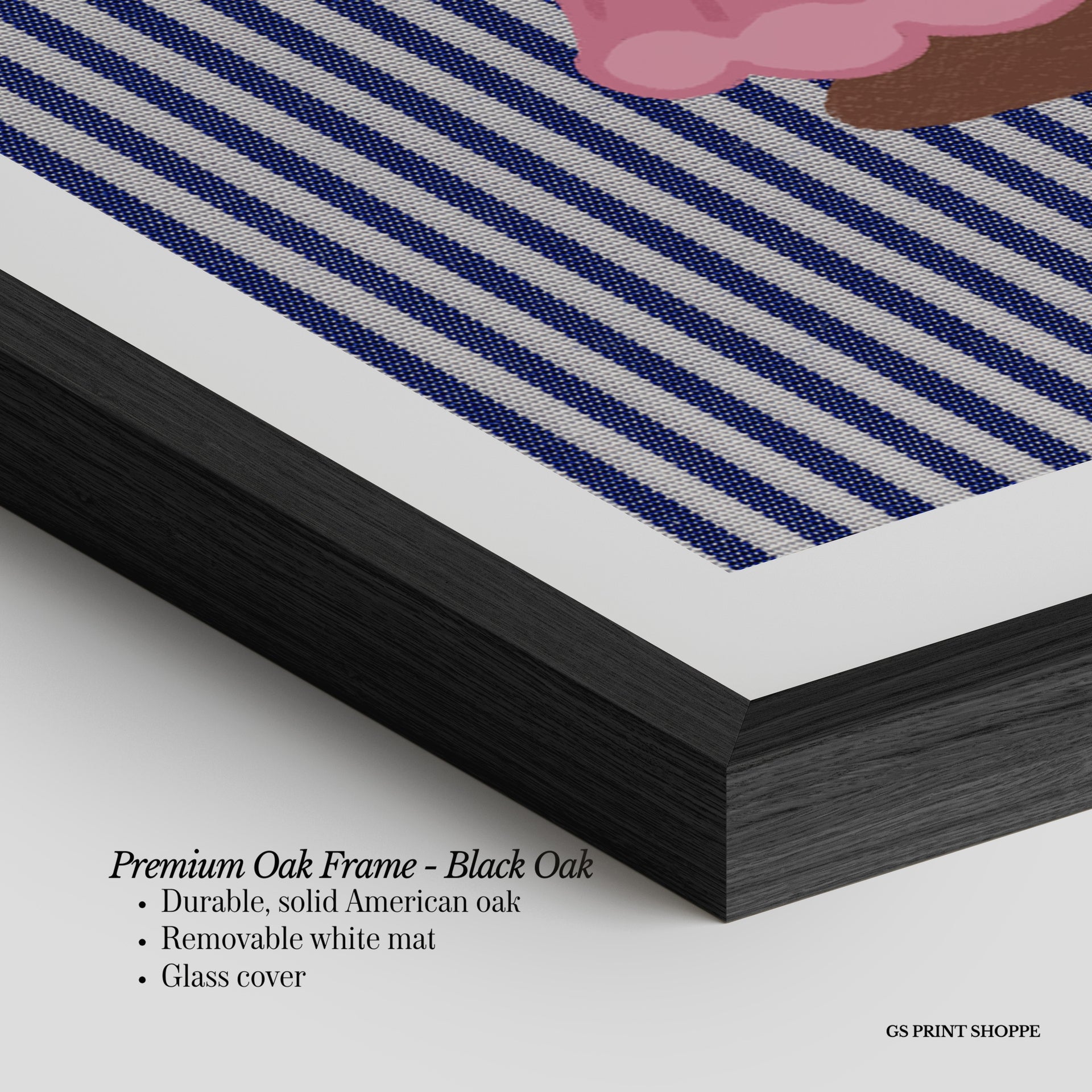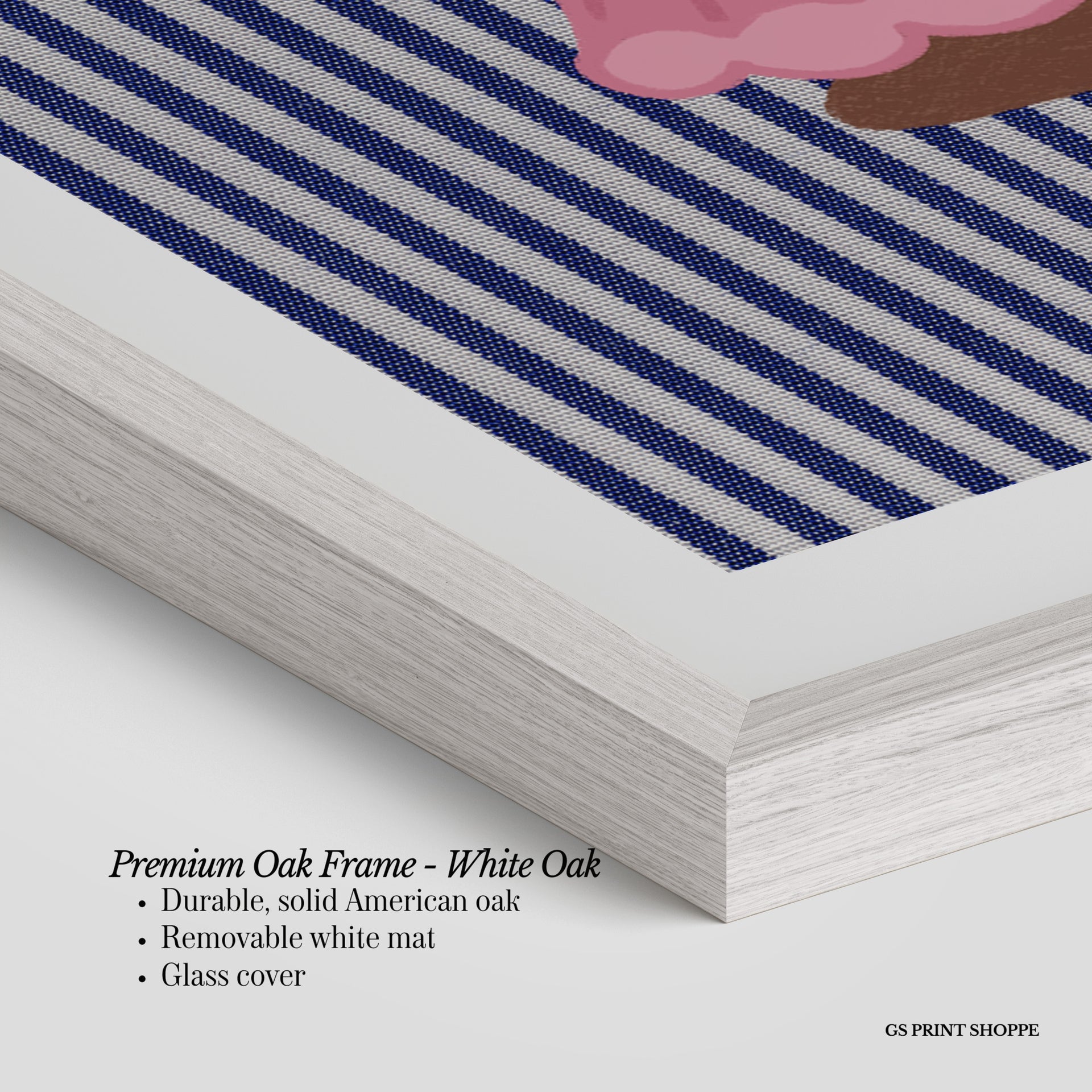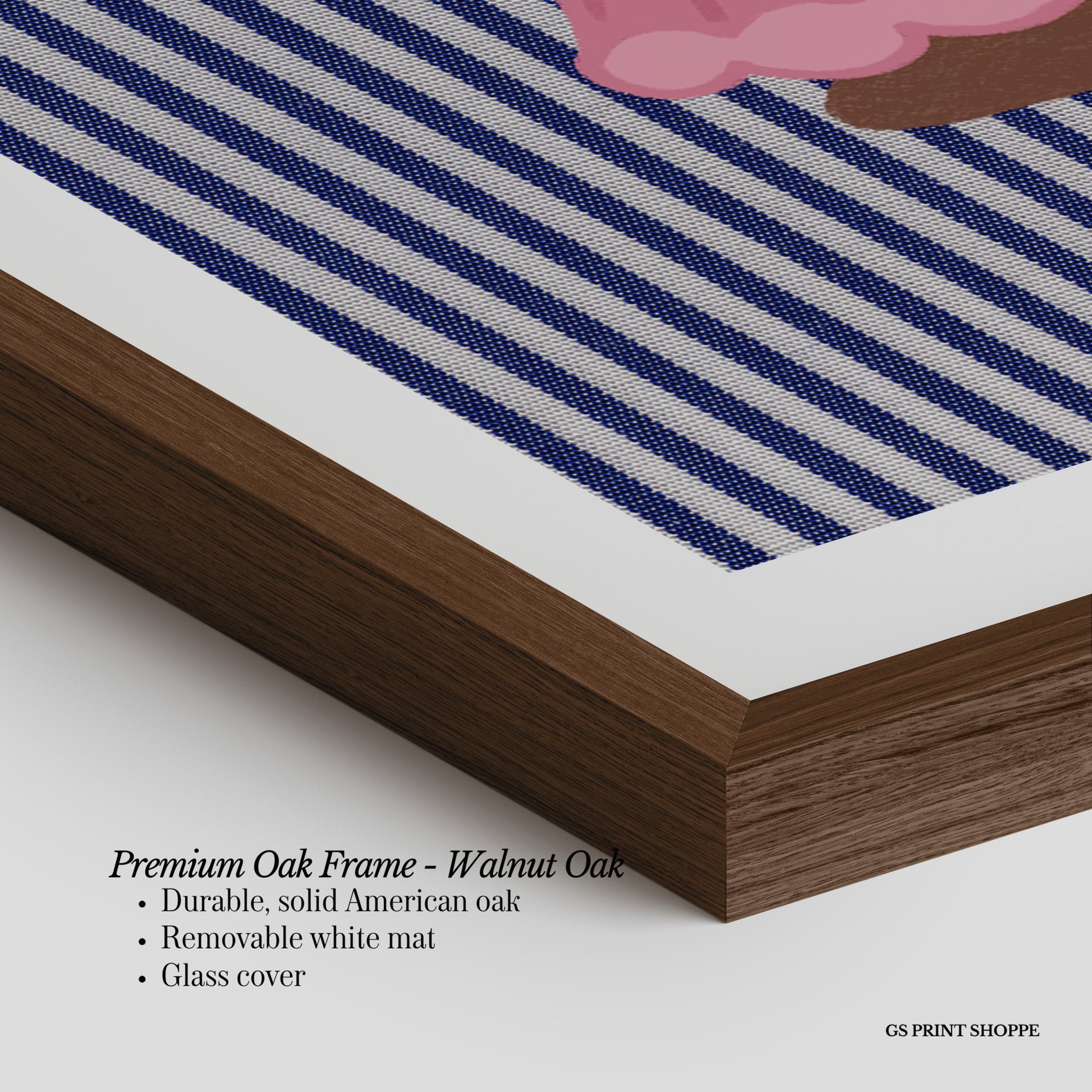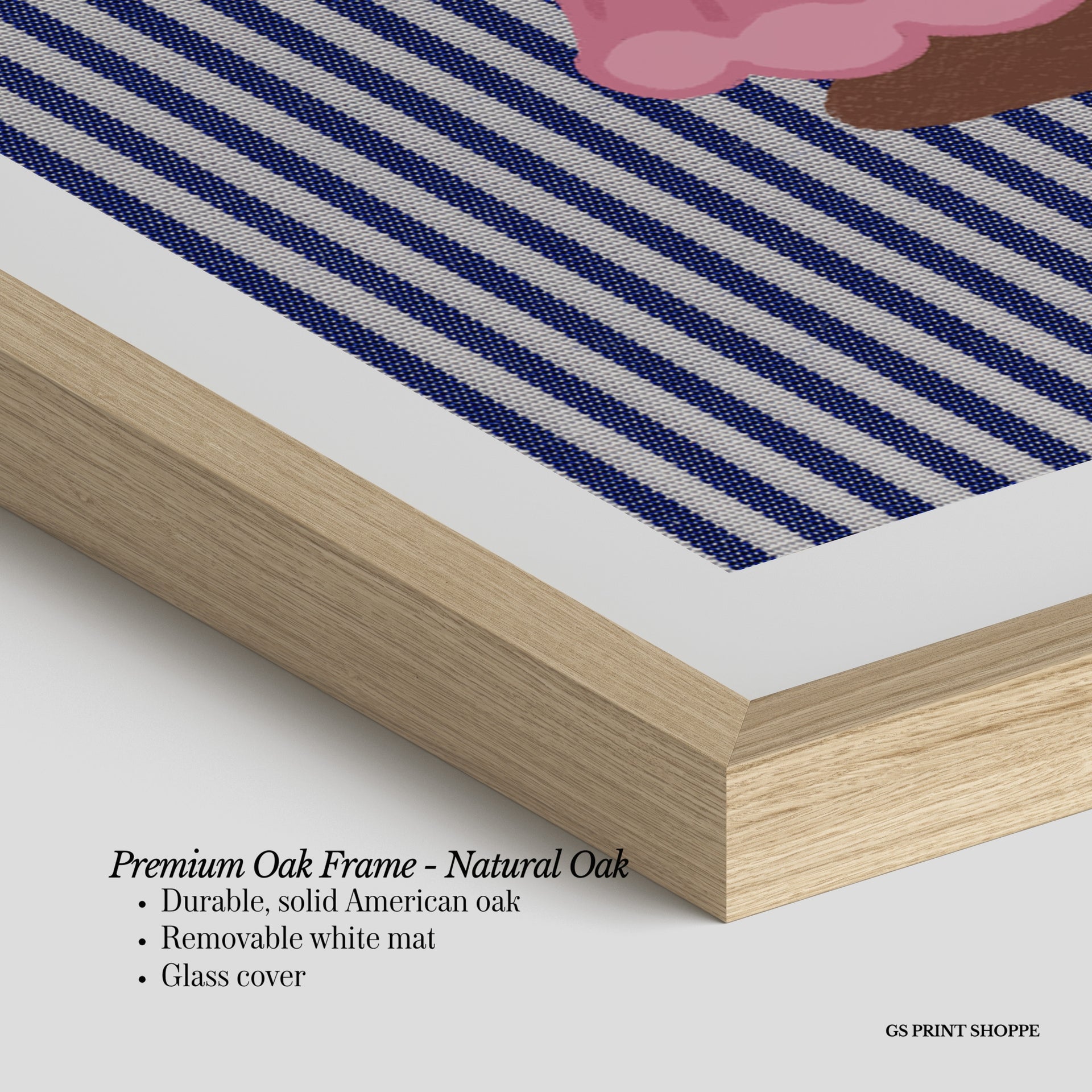 Premium Oak Frame: Our premium oak frame is crafted from solid American oak, offering a warm, natural feel with a high-end finish. We complete this elevated offering with a bright white removable mat and real glass for a versatile and polished look.
