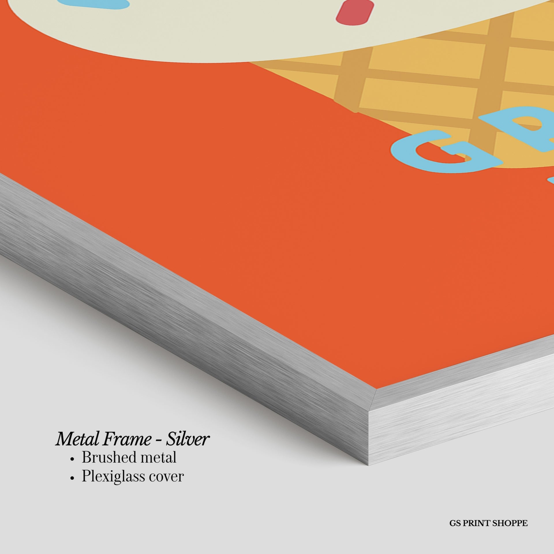 Metal Frame: Sleek and modern, our metal frame is crafted with brushed metal for a polished finish. It comes with durable plexiglass and sturdy metal hangers for horizontal or vertical display.