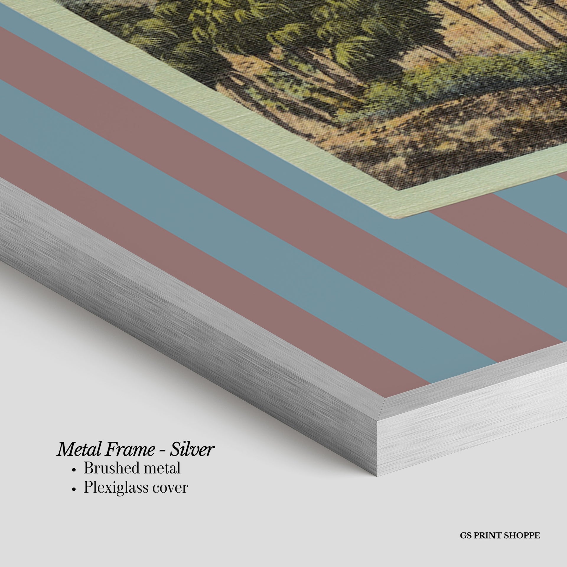 Metal Frame: Sleek and modern, our metal frame is crafted with brushed metal for a polished finish. It comes with durable plexiglass and sturdy metal hangers for horizontal or vertical display.
