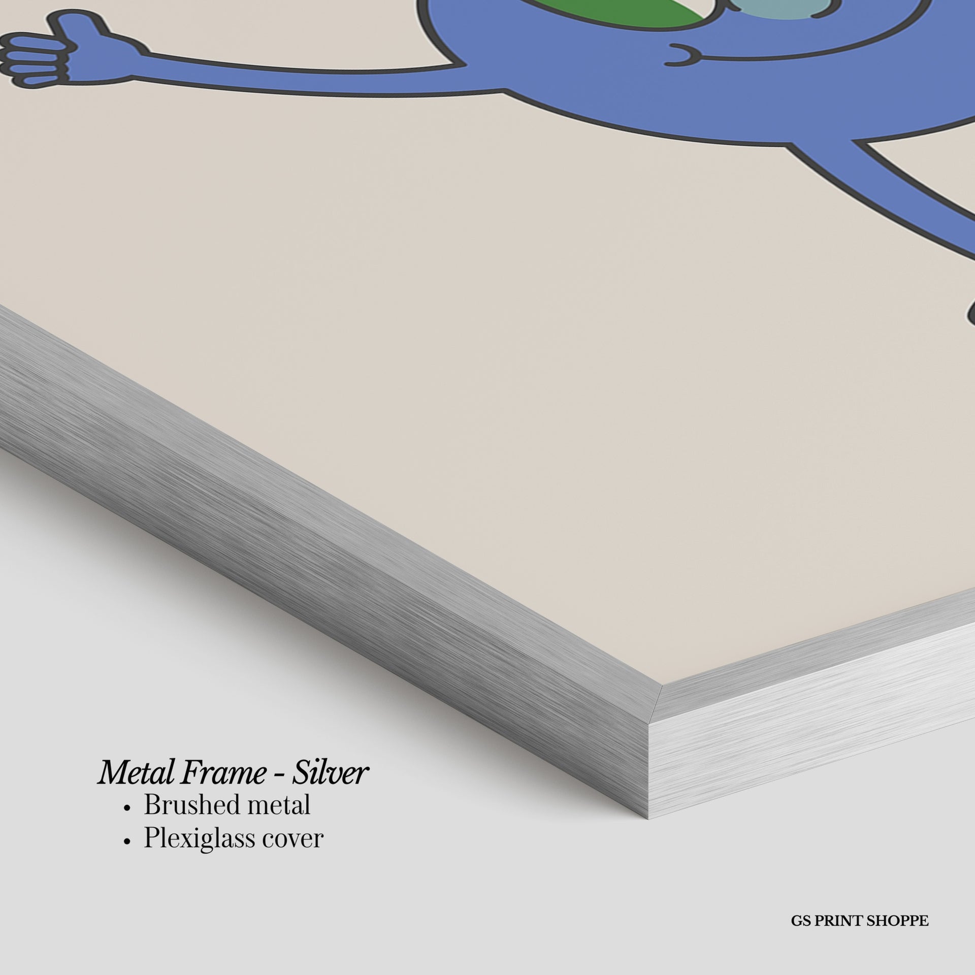 Metal Frame: Sleek and modern, our metal frame is crafted with brushed metal for a polished finish. It comes with durable plexiglass and sturdy metal hangers for horizontal or vertical display.