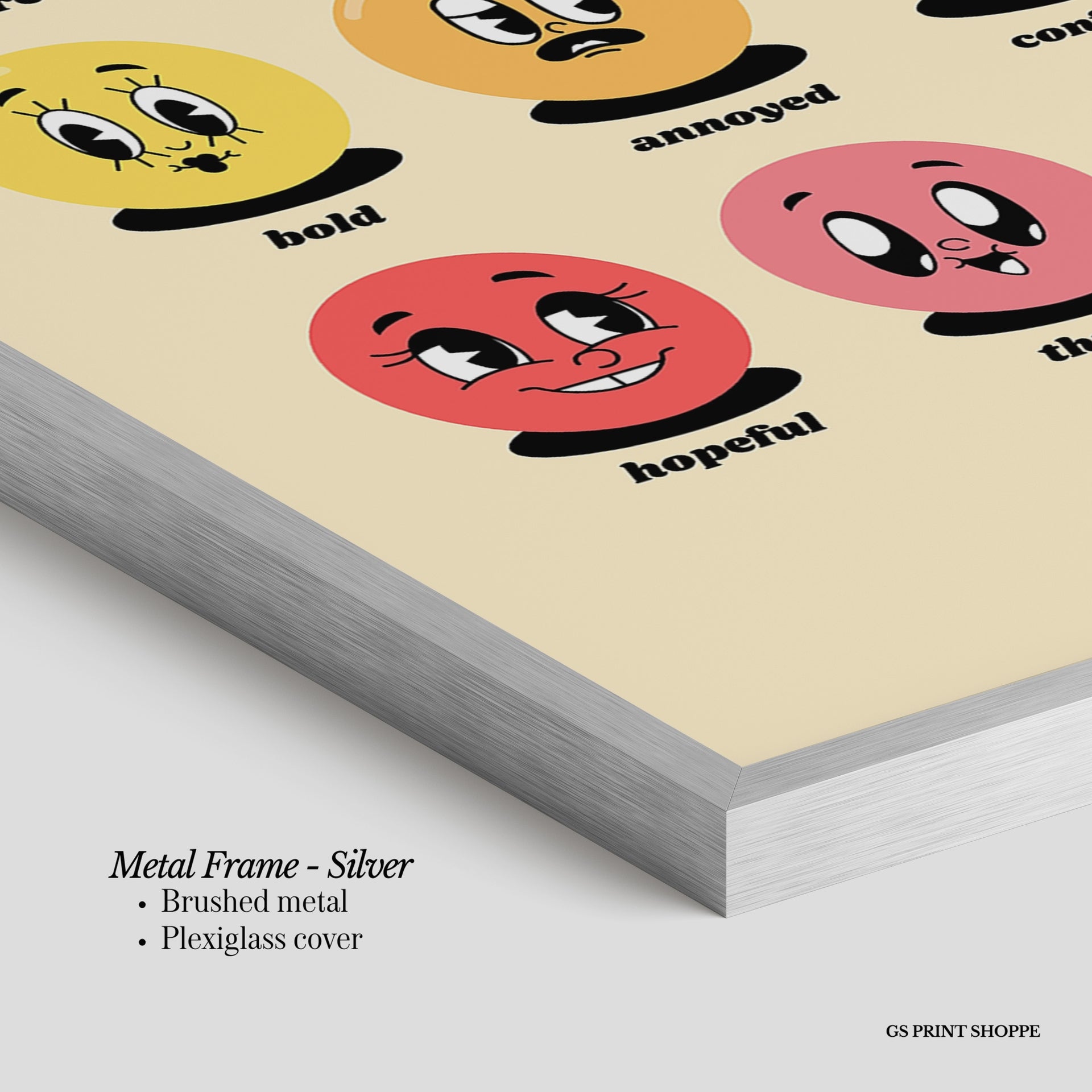 Metal Frame: Sleek and modern, our metal frame is crafted with brushed metal for a polished finish. It comes with durable plexiglass and sturdy metal hangers for horizontal or vertical display.