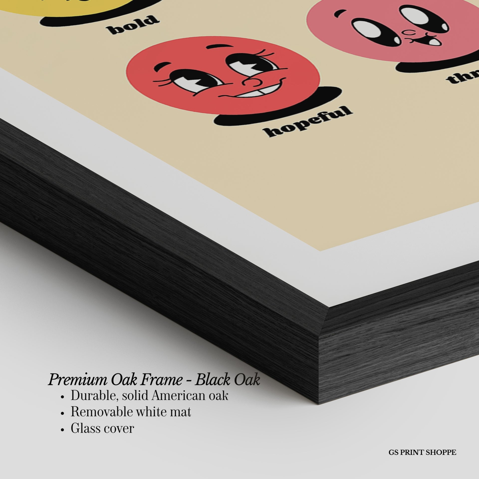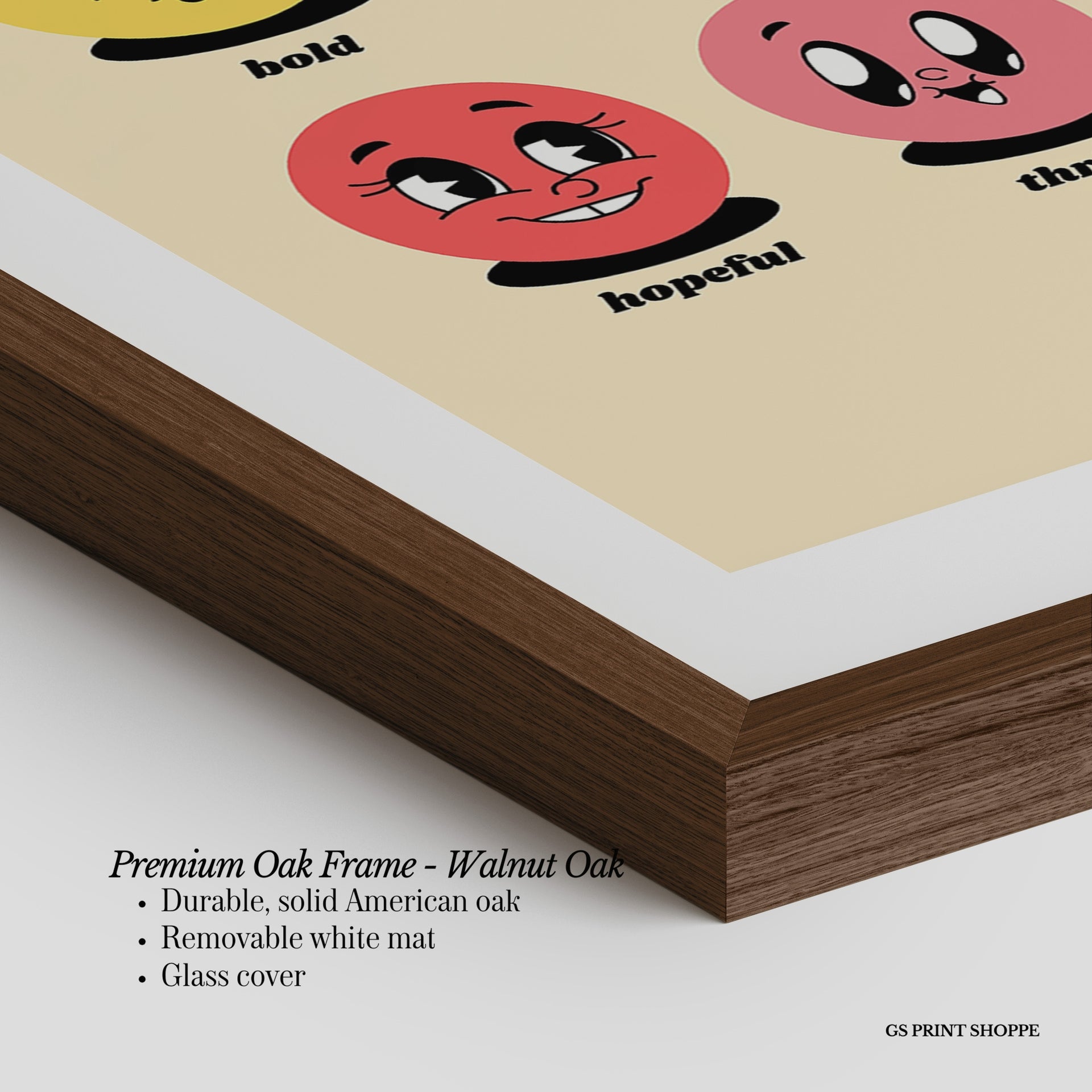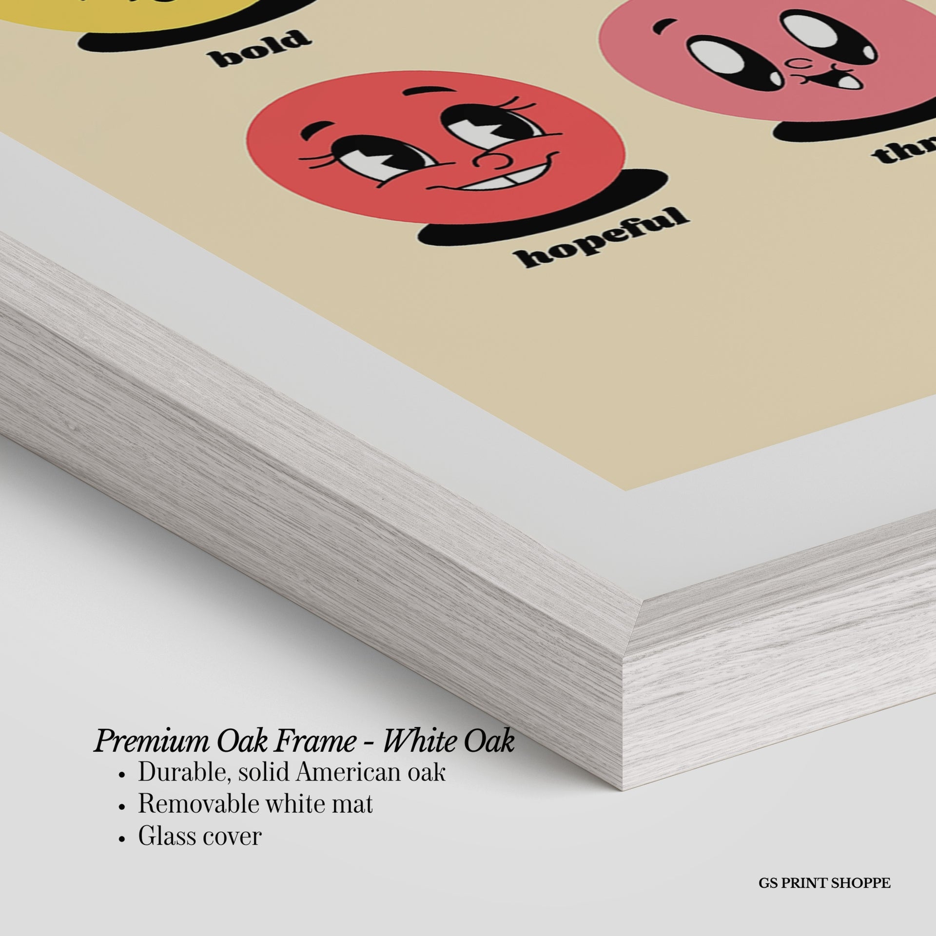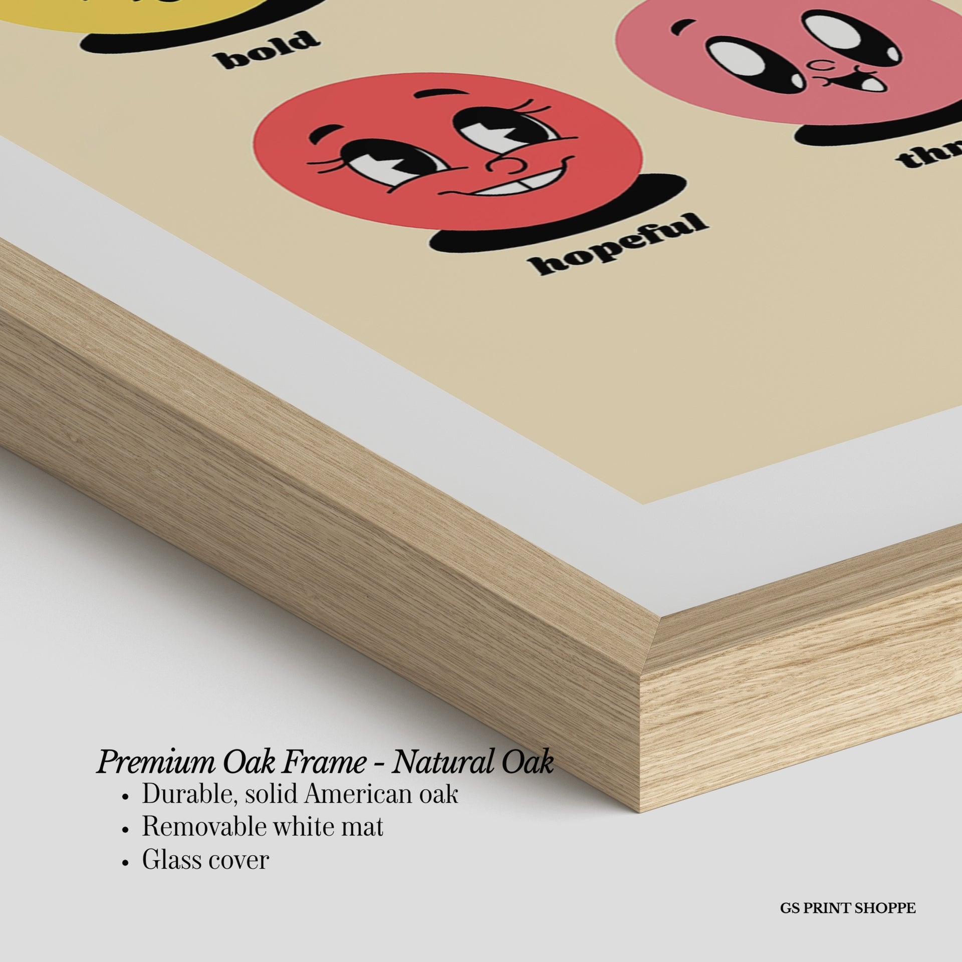 Premium Oak Frame: Our premium oak frame is crafted from solid American oak, offering a warm, natural feel with a high-end finish. We complete this elevated offering with a bright white removable mat and real glass for a versatile and polished look.