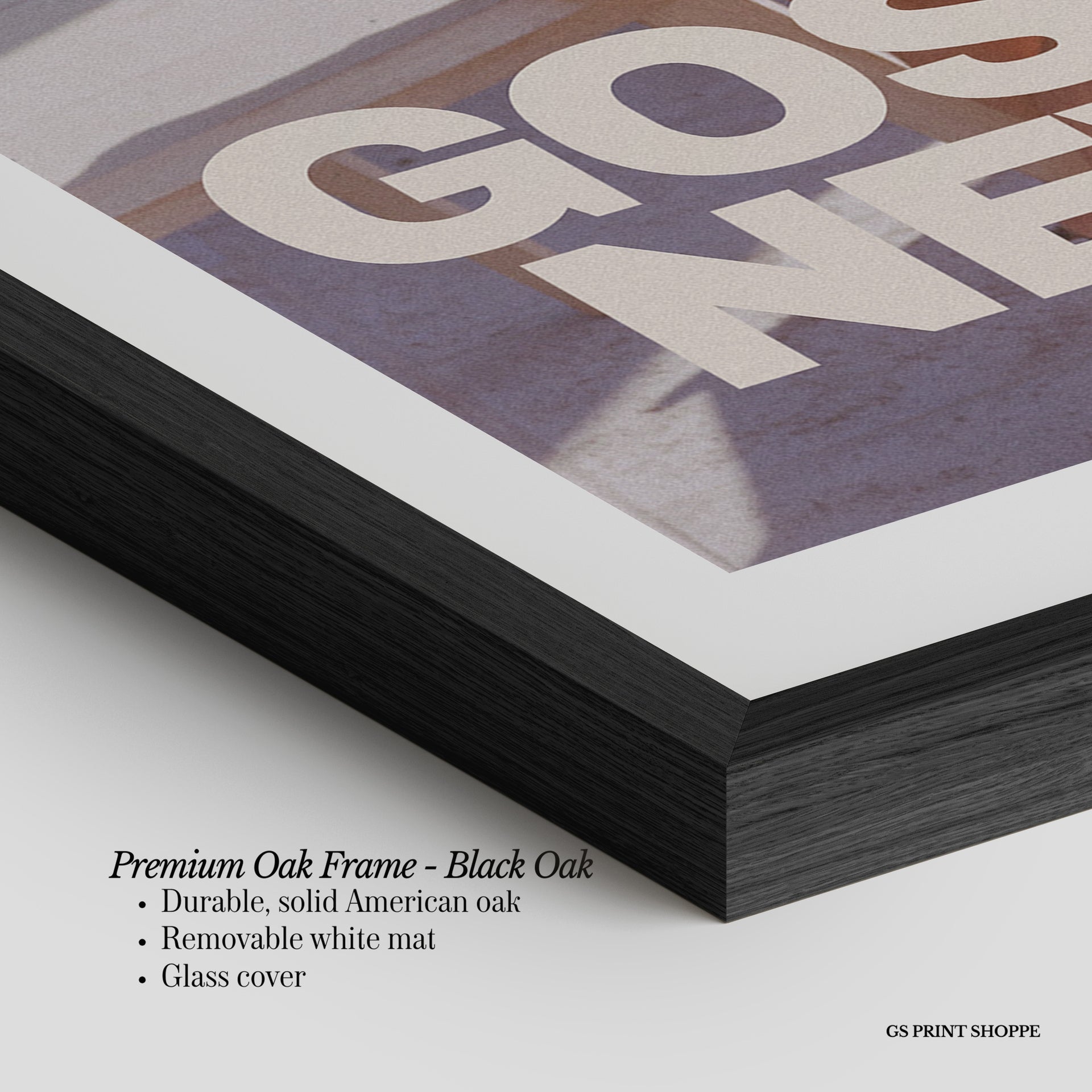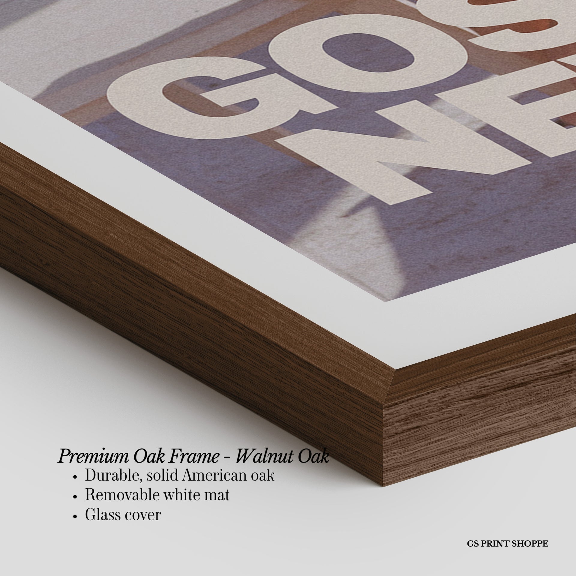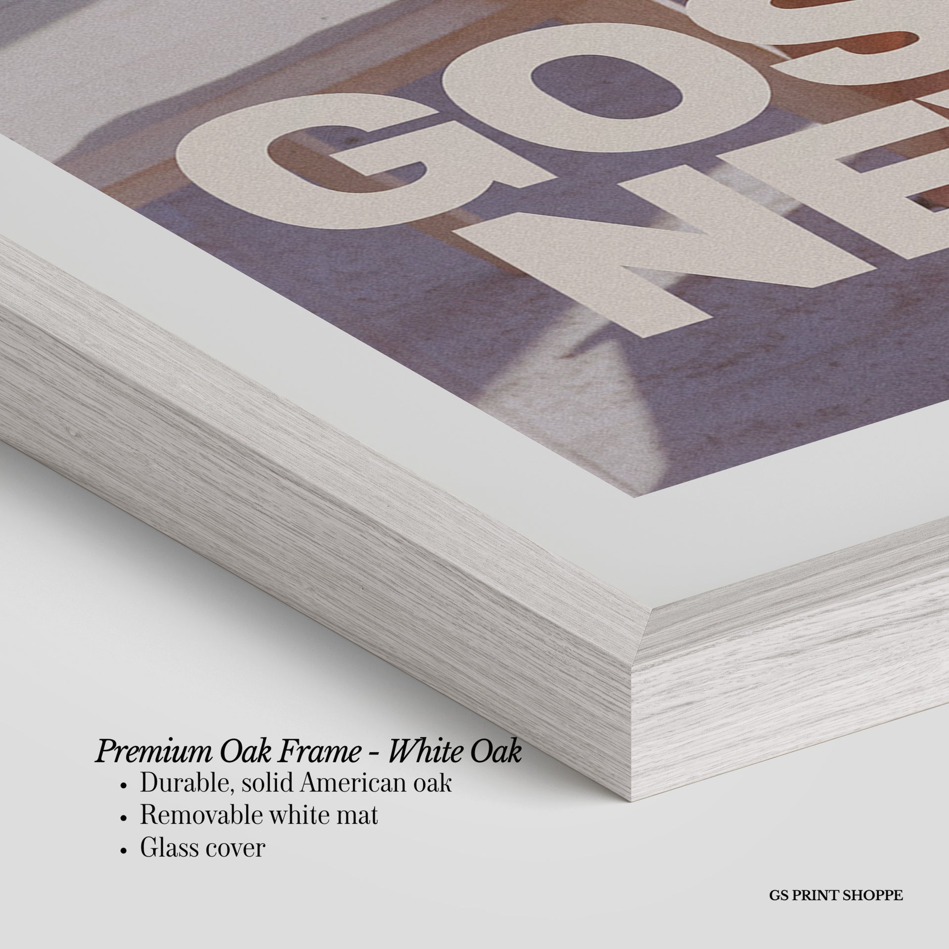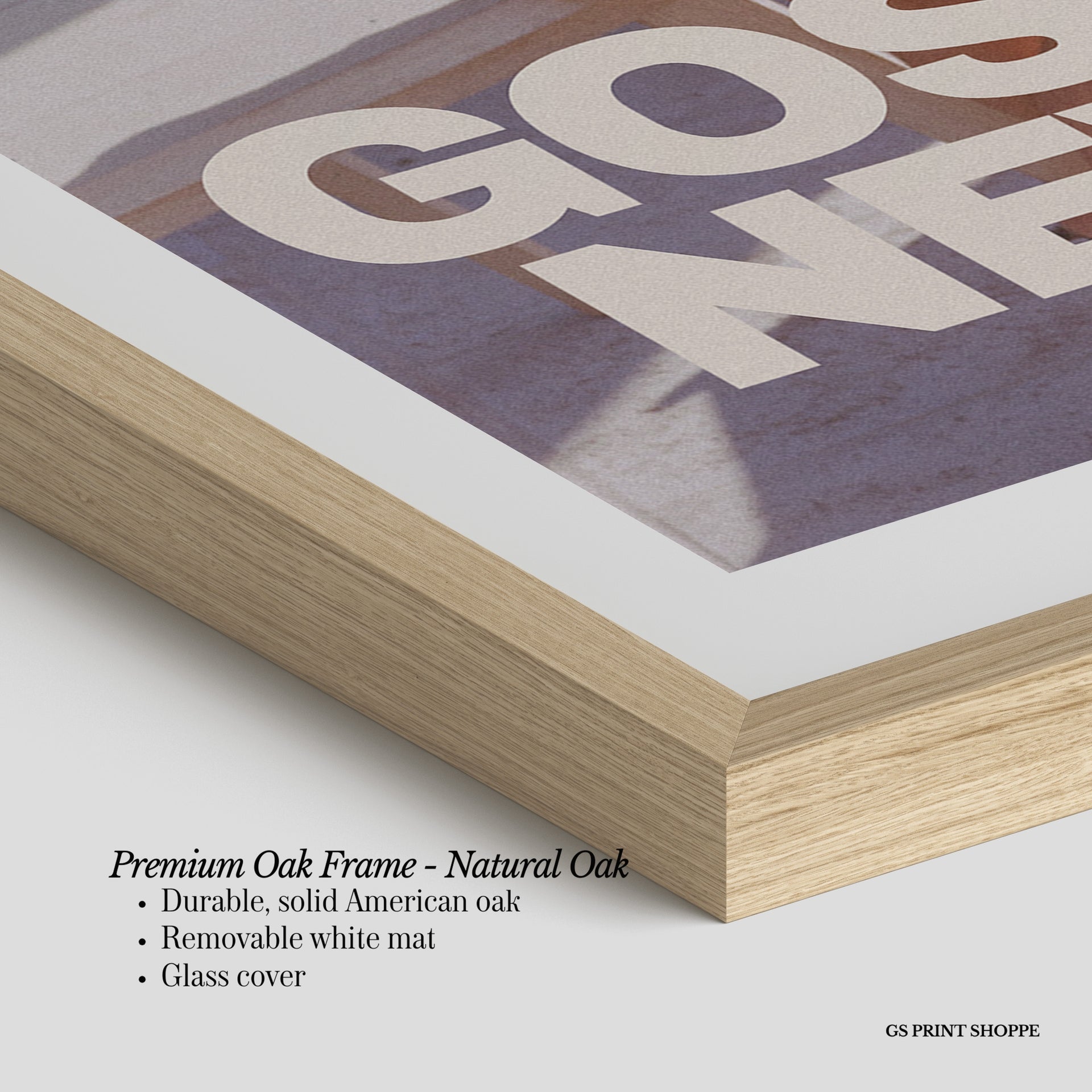 Premium Oak Frame: Our premium oak frame is crafted from solid American oak, offering a warm, natural feel with a high-end finish. We complete this elevated offering with a bright white removable mat and real glass for a versatile and polished look.