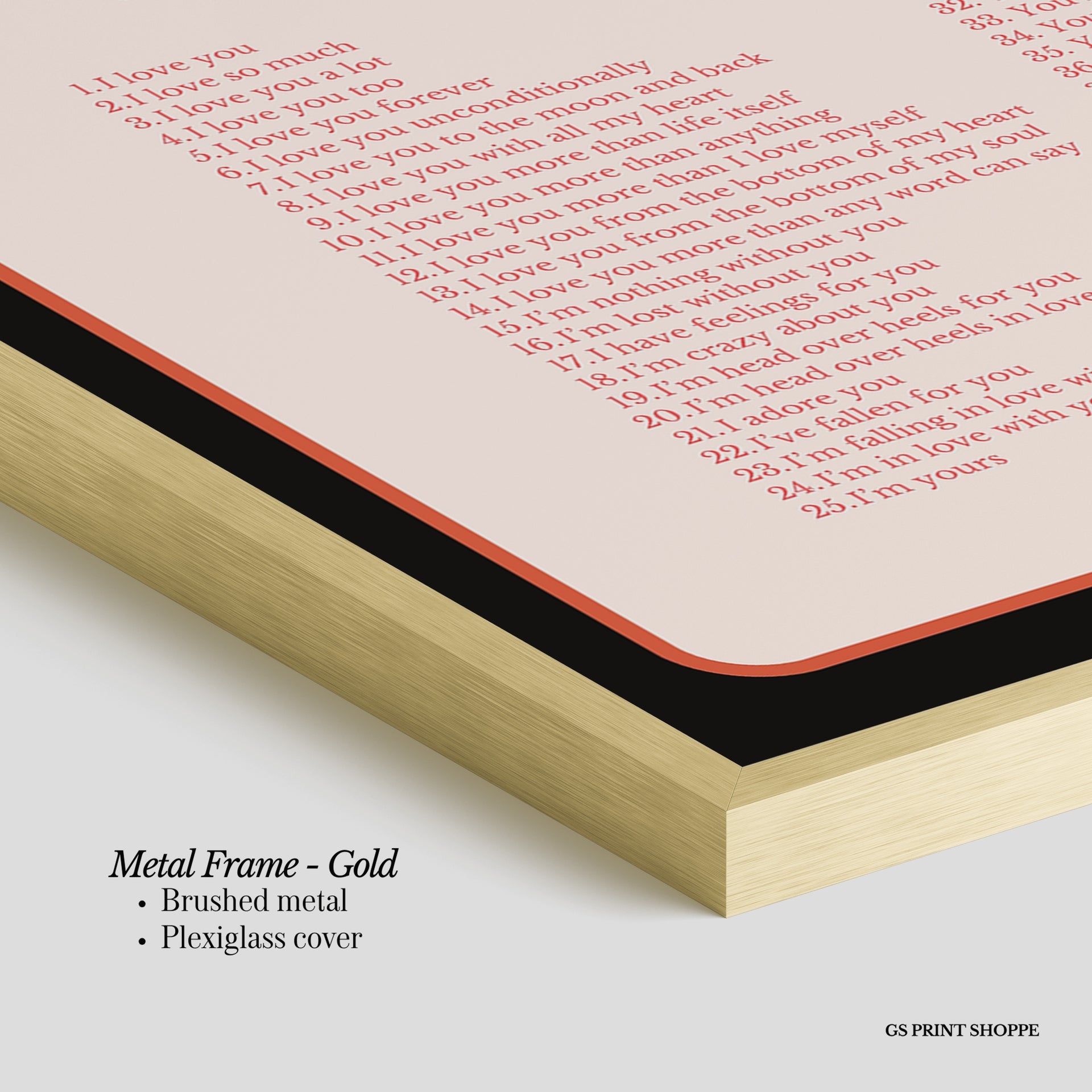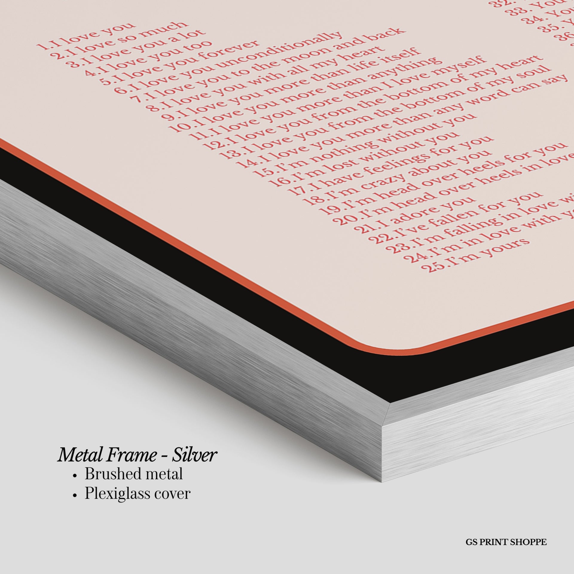 Metal Frame: Sleek and modern, our metal frame is crafted with brushed metal for a polished finish. It comes with durable plexiglass and sturdy metal hangers for horizontal or vertical display.