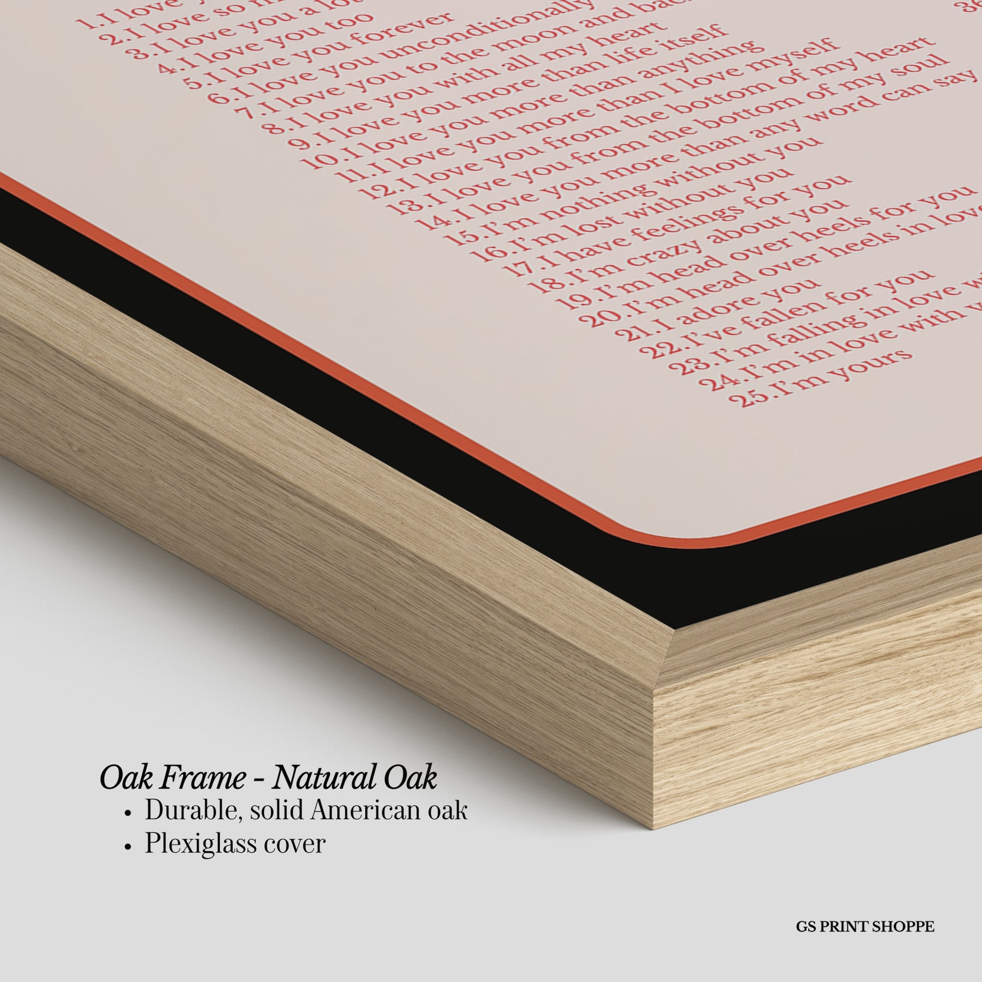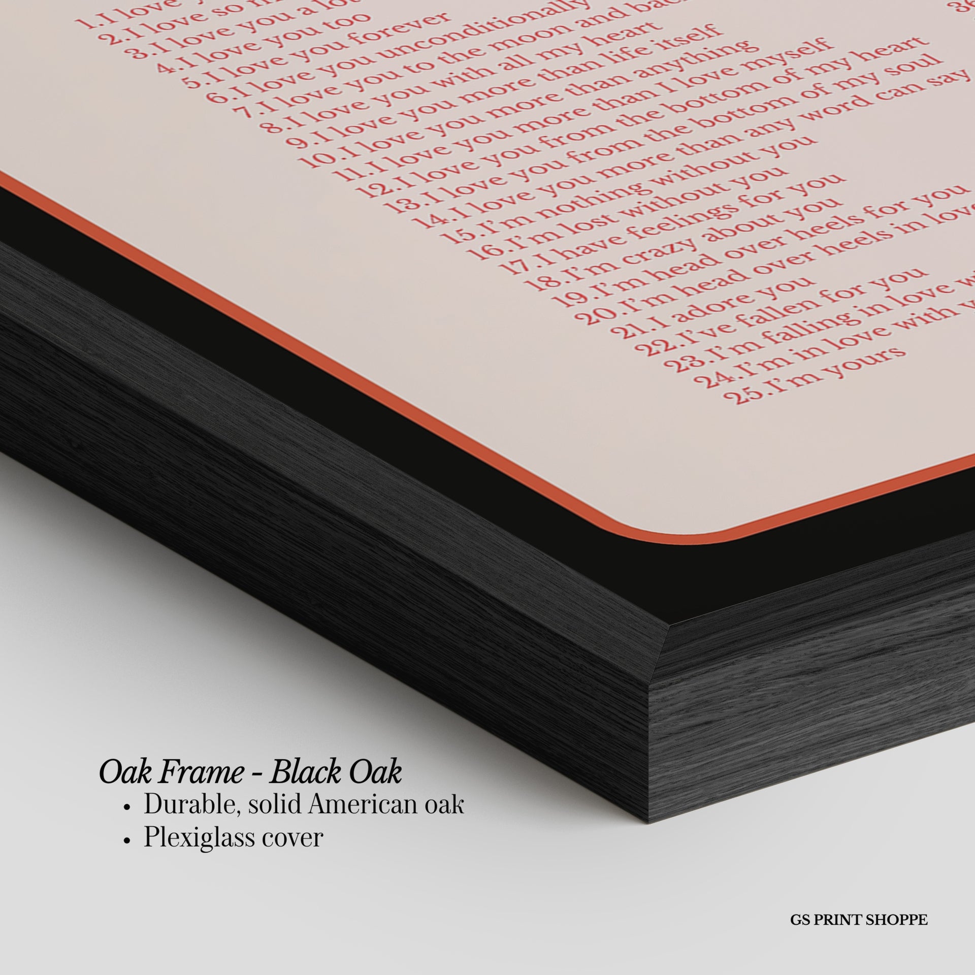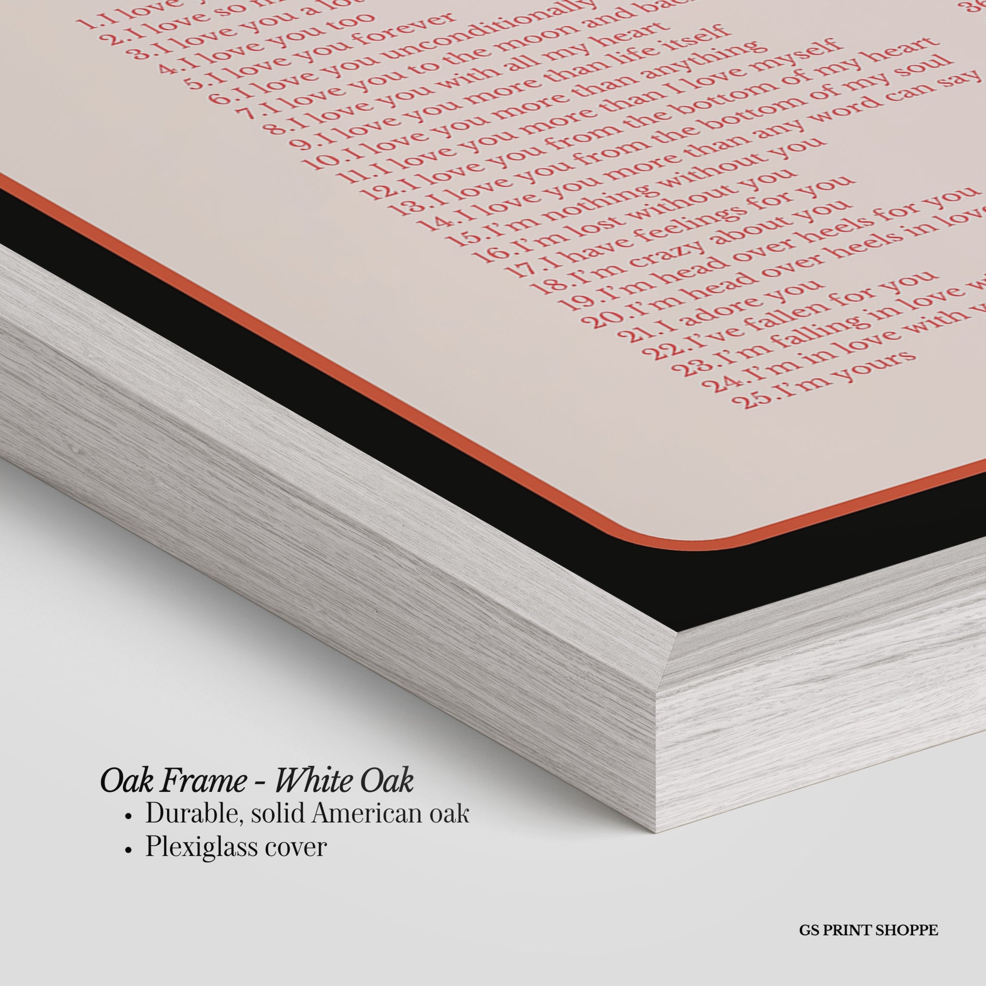 Oak Frame: Our solid oak frame blends durability with timeless appeal. Made from American oak, it features a smooth finish and plexiglass for long-lasting quality.
