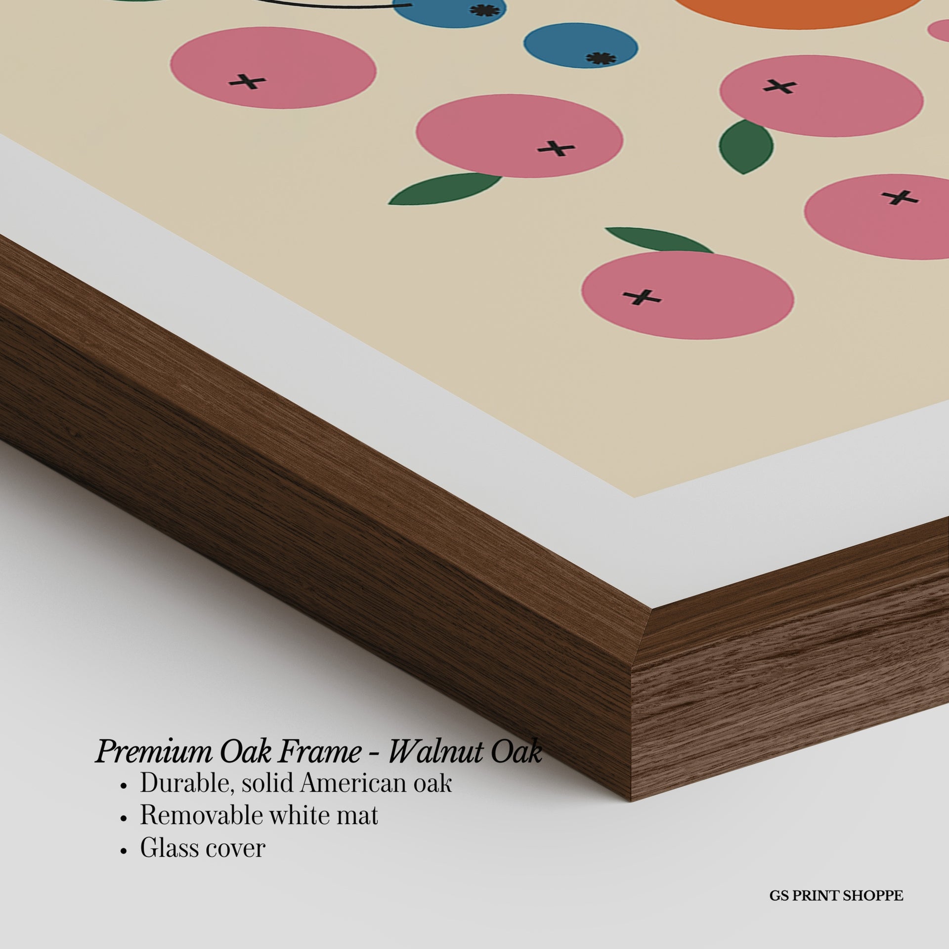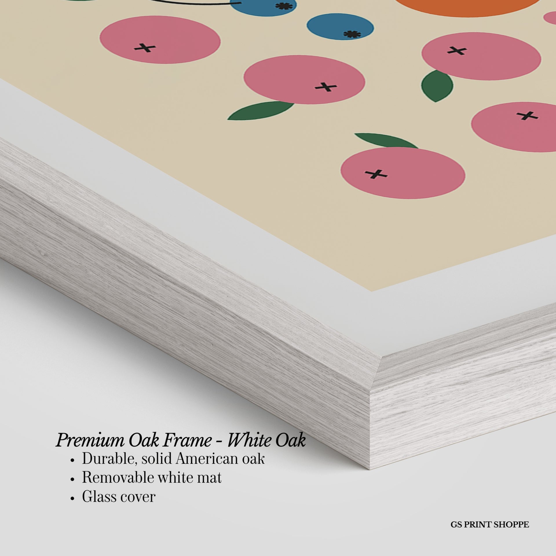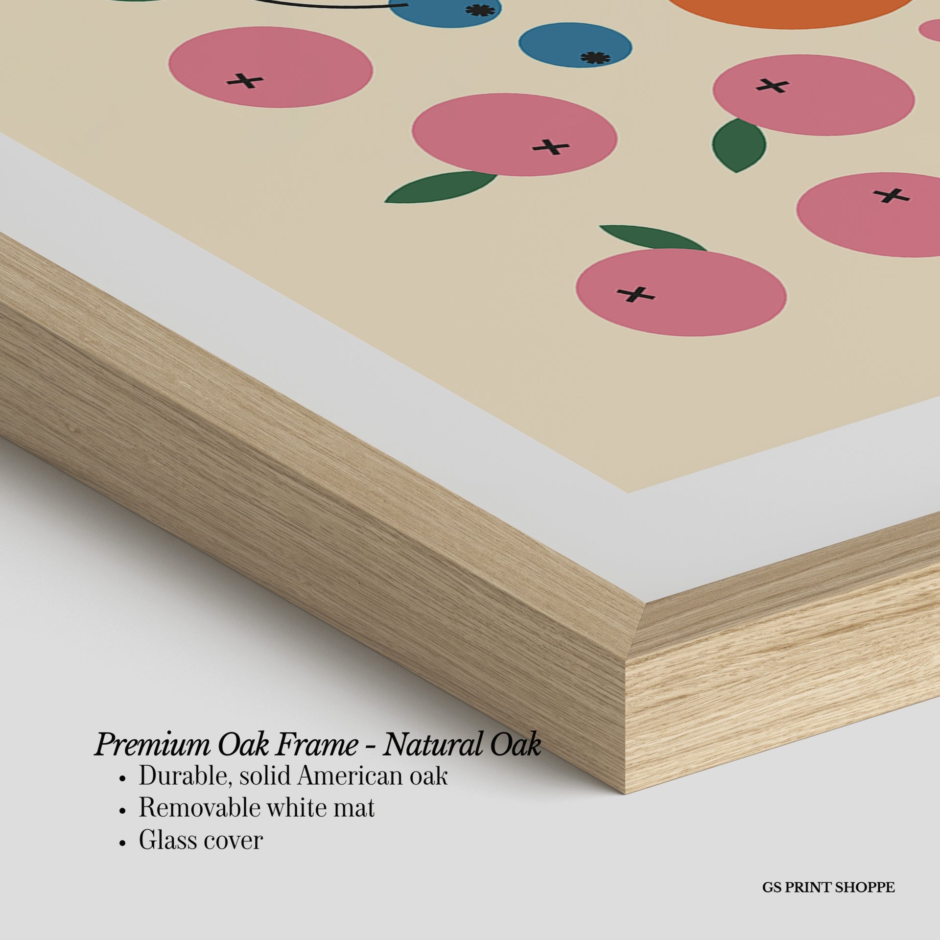 Premium Oak Frame: Our premium oak frame is crafted from solid American oak, offering a warm, natural feel with a high-end finish. We complete this elevated offering with a bright white removable mat and real glass for a versatile and polished look.
