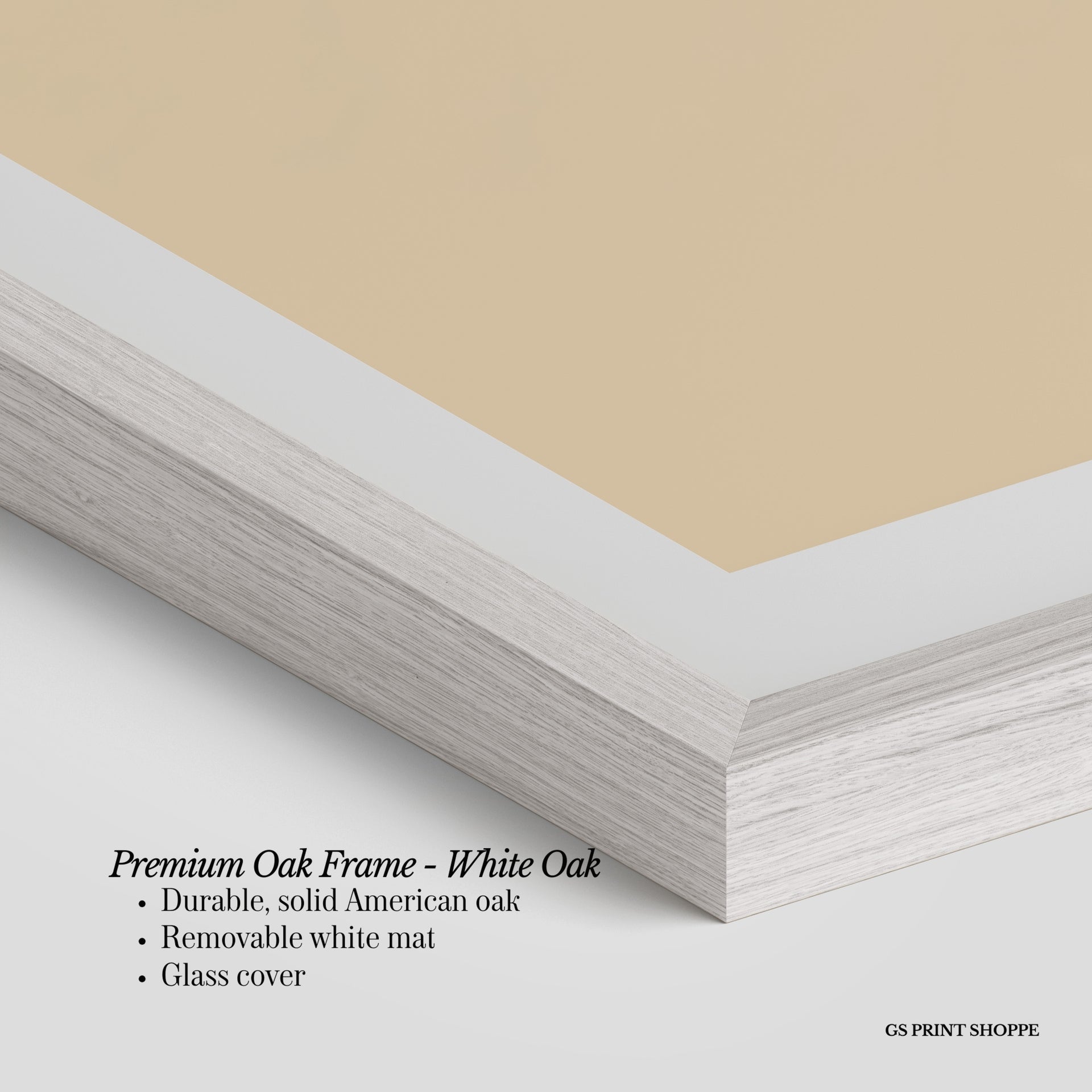 Premium Oak Frame: Our premium oak frame is crafted from solid American oak, offering a warm, natural feel with a high-end finish. We complete this elevated offering with a bright white removable mat and real glass for a versatile and polished look.
