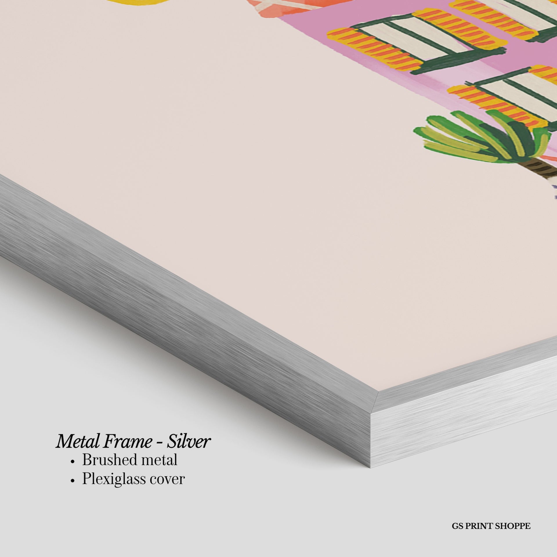 Metal Frame: Sleek and modern, our metal frame is crafted with brushed metal for a polished finish. It comes with durable plexiglass and sturdy metal hangers for horizontal or vertical display.
