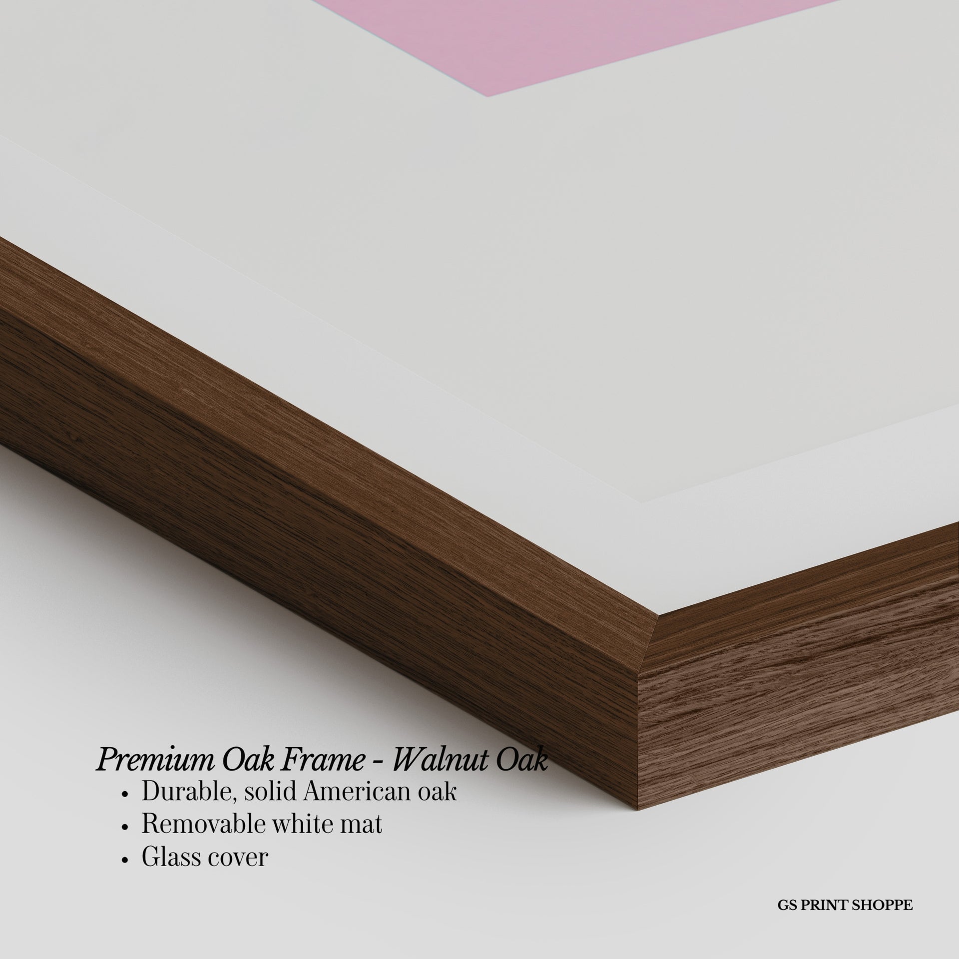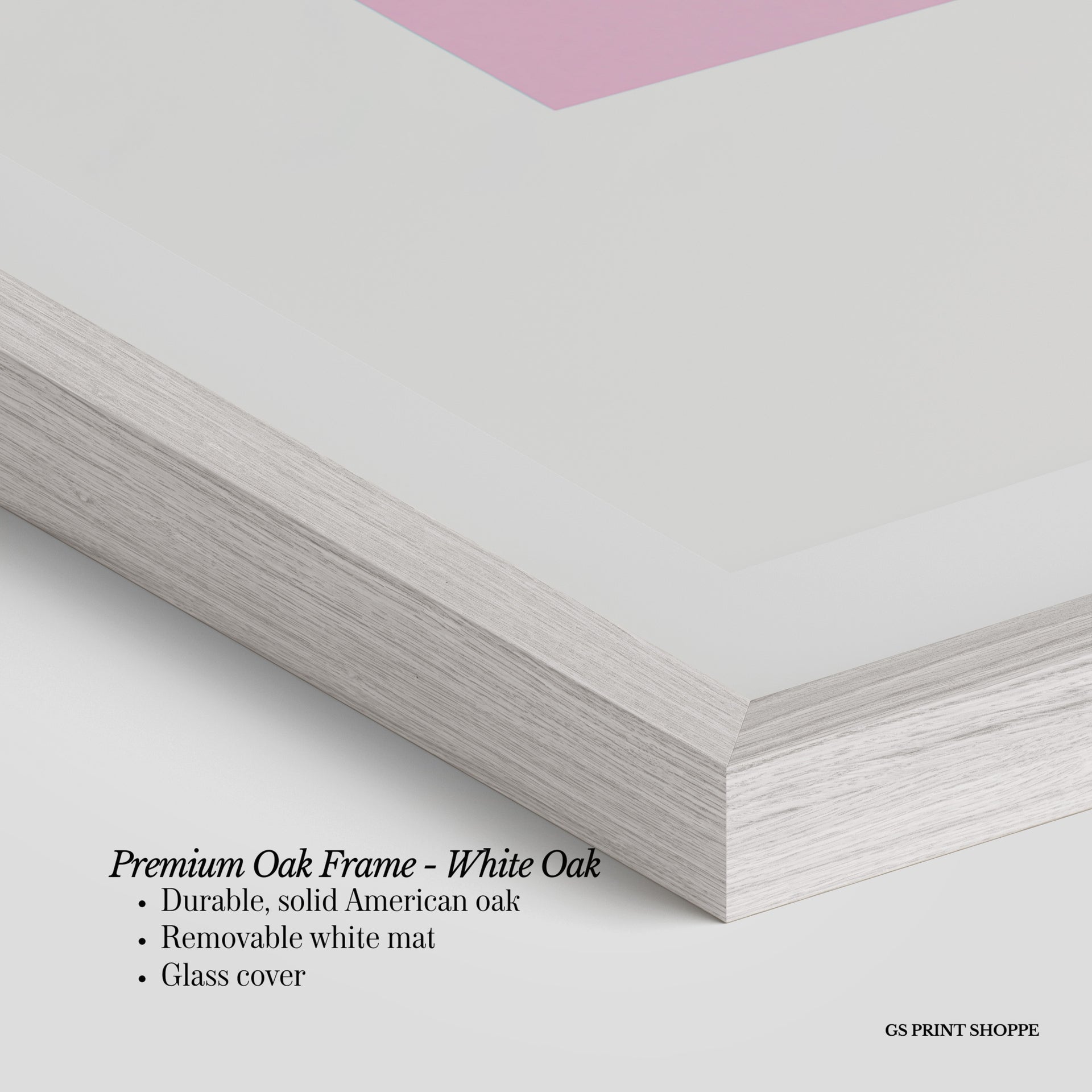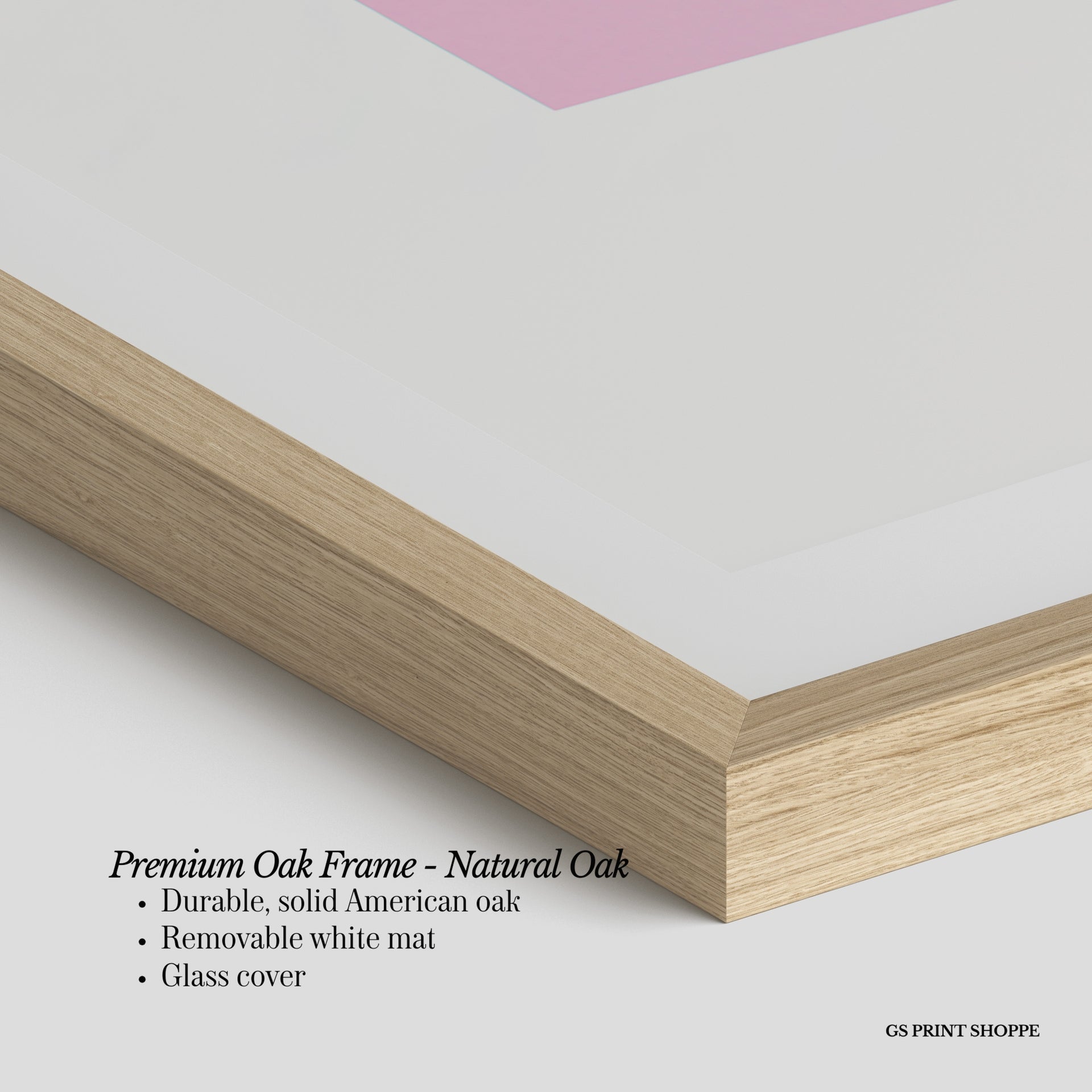 Premium Oak Frame: Our premium oak frame is crafted from solid American oak, offering a warm, natural feel with a high-end finish. We complete this elevated offering with a bright white removable mat and real glass for a versatile and polished look.