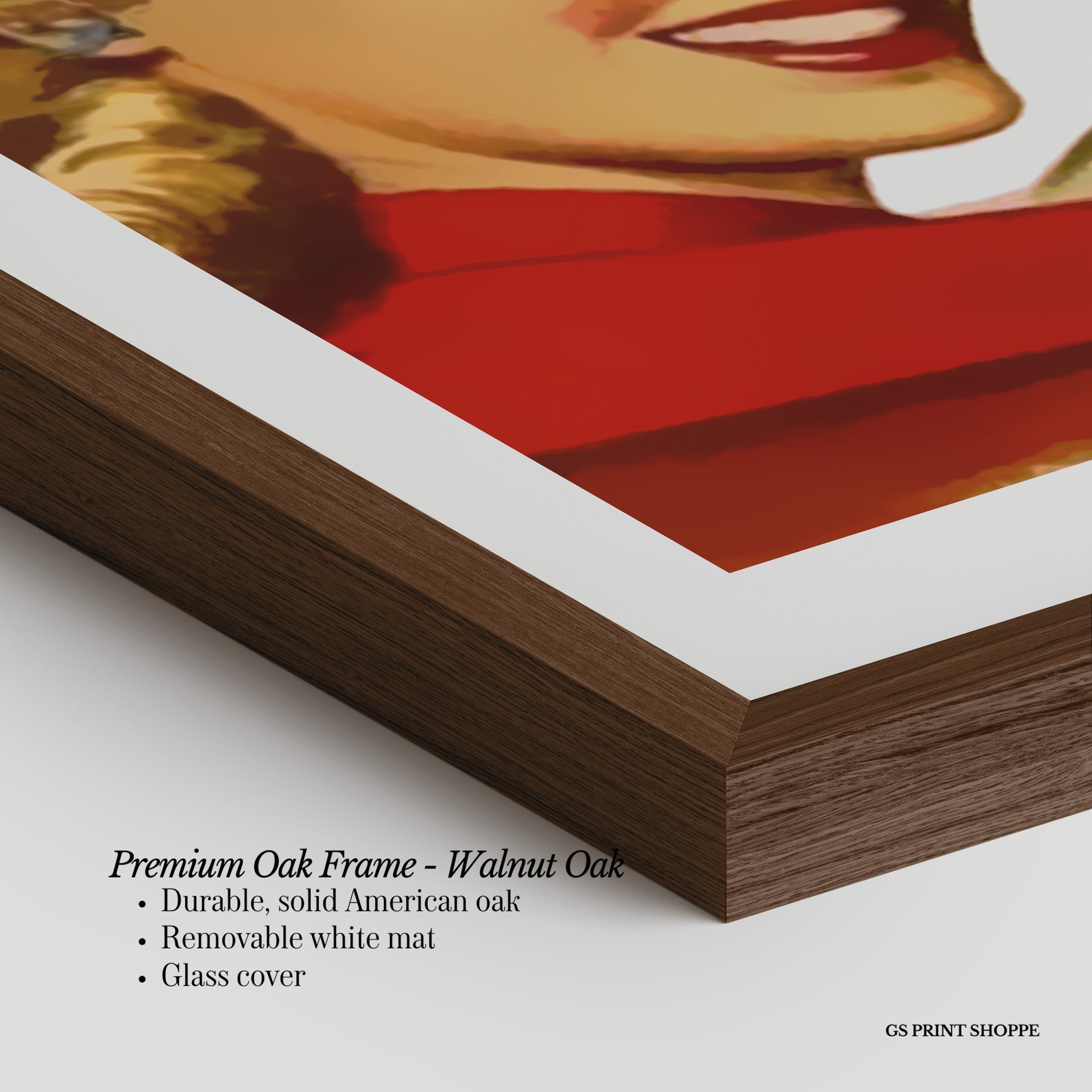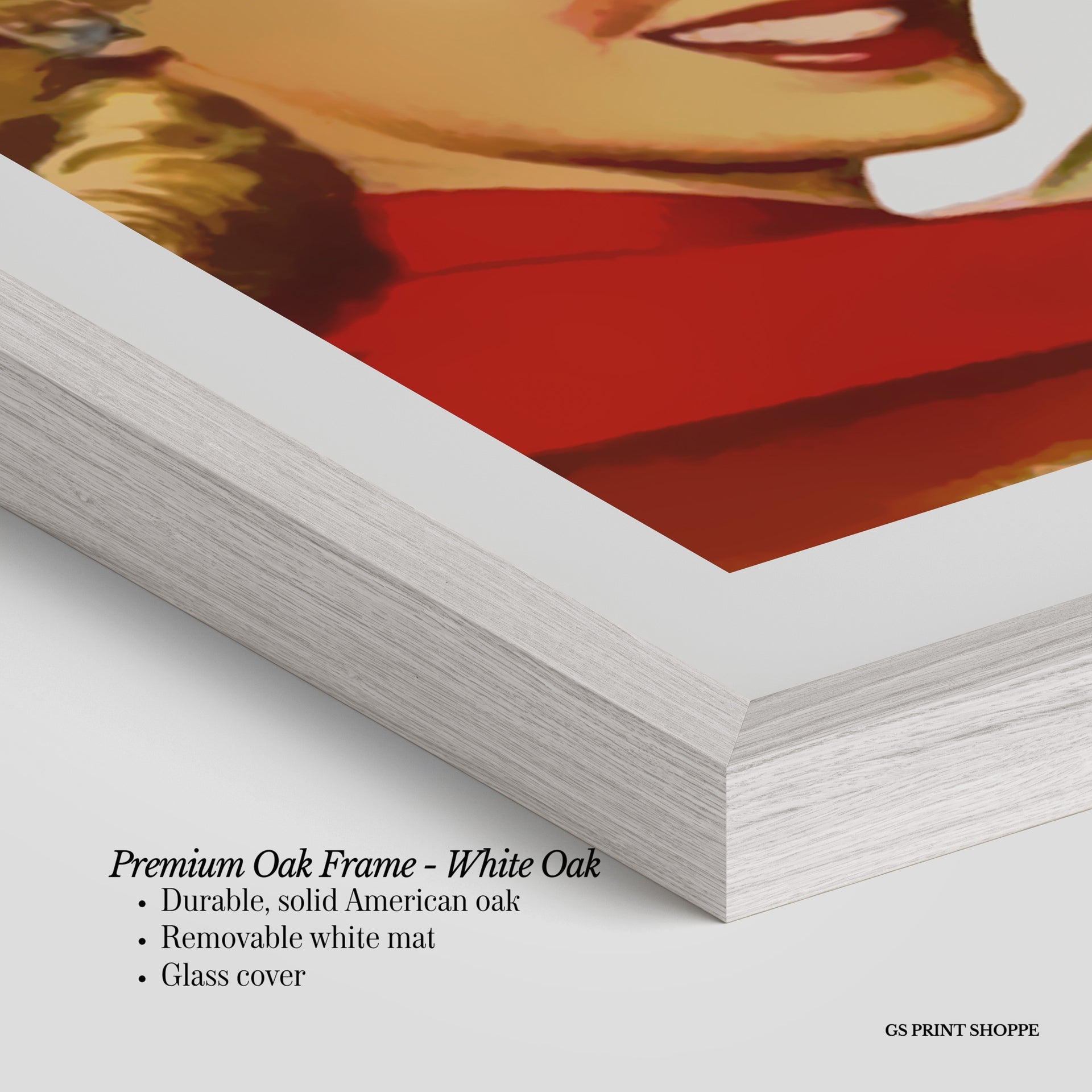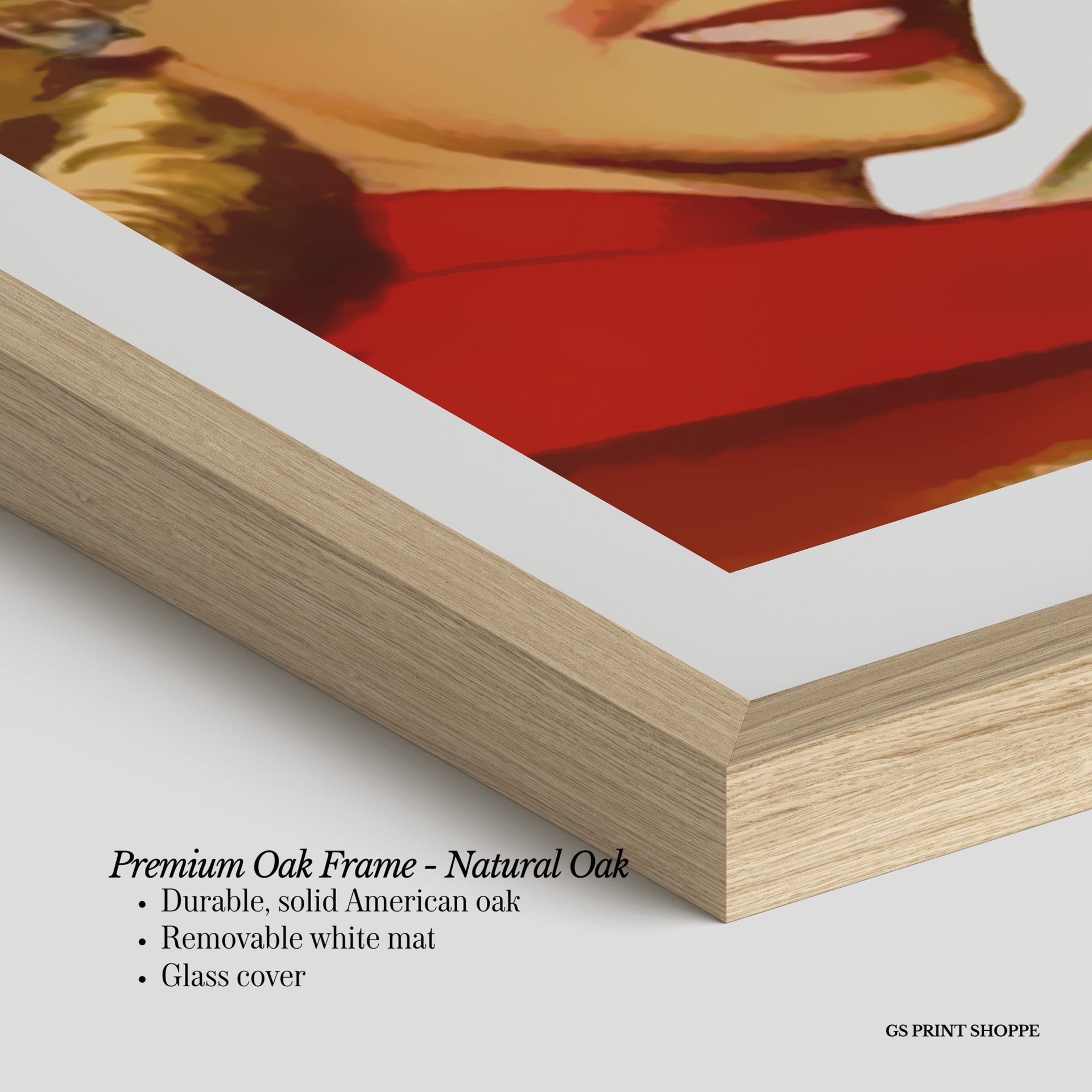 Premium Oak Frame: Our premium oak frame is crafted from solid American oak, offering a warm, natural feel with a high-end finish. We complete this elevated offering with a bright white removable mat and real glass for a versatile and polished look.