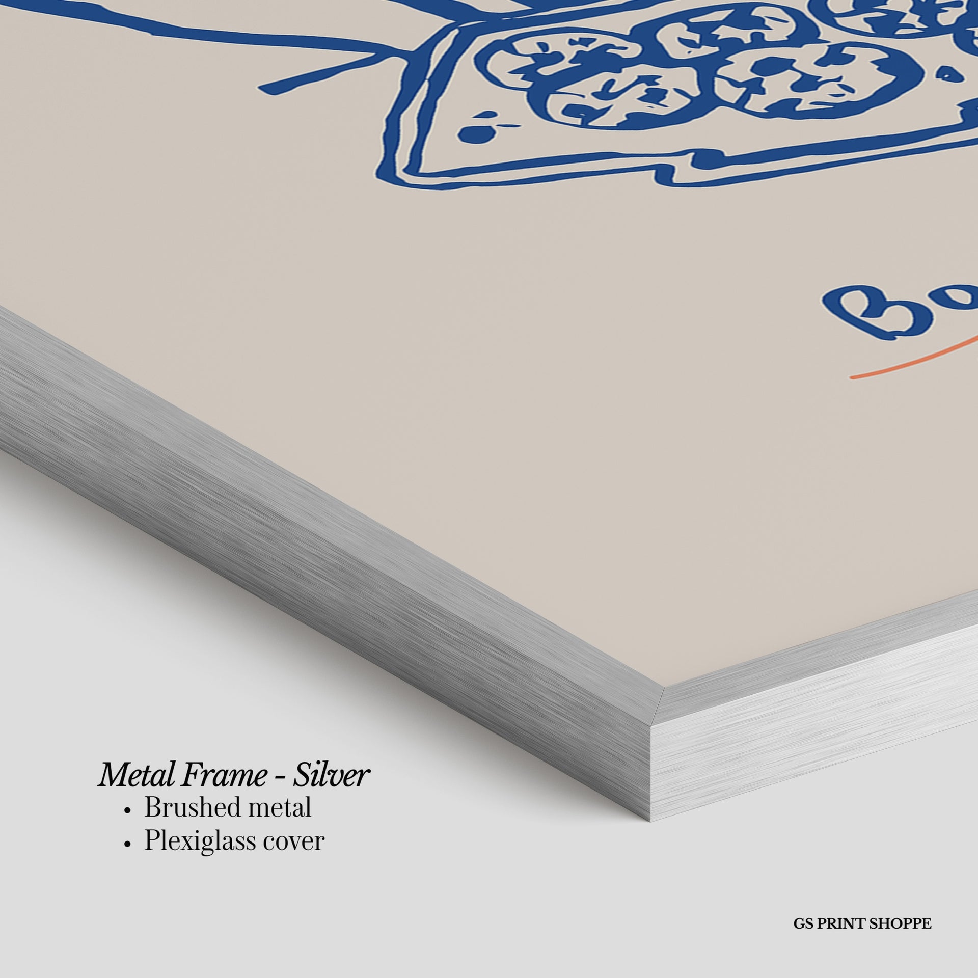 Metal Frame: Sleek and modern, our metal frame is crafted with brushed metal for a polished finish. It comes with durable plexiglass and sturdy metal hangers for horizontal or vertical display.