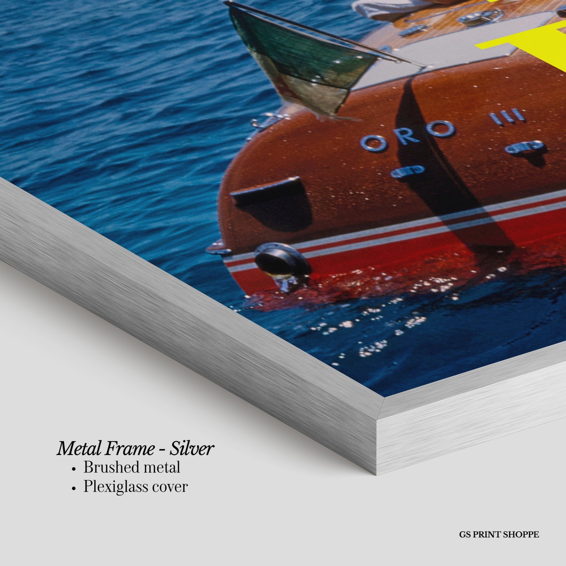 Metal Frame: Sleek and modern, our metal frame is crafted with brushed metal for a polished finish. It comes with durable plexiglass and sturdy metal hangers for horizontal or vertical display.