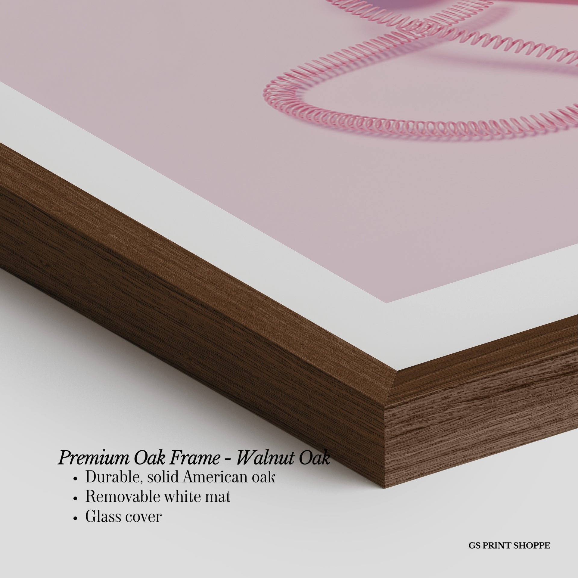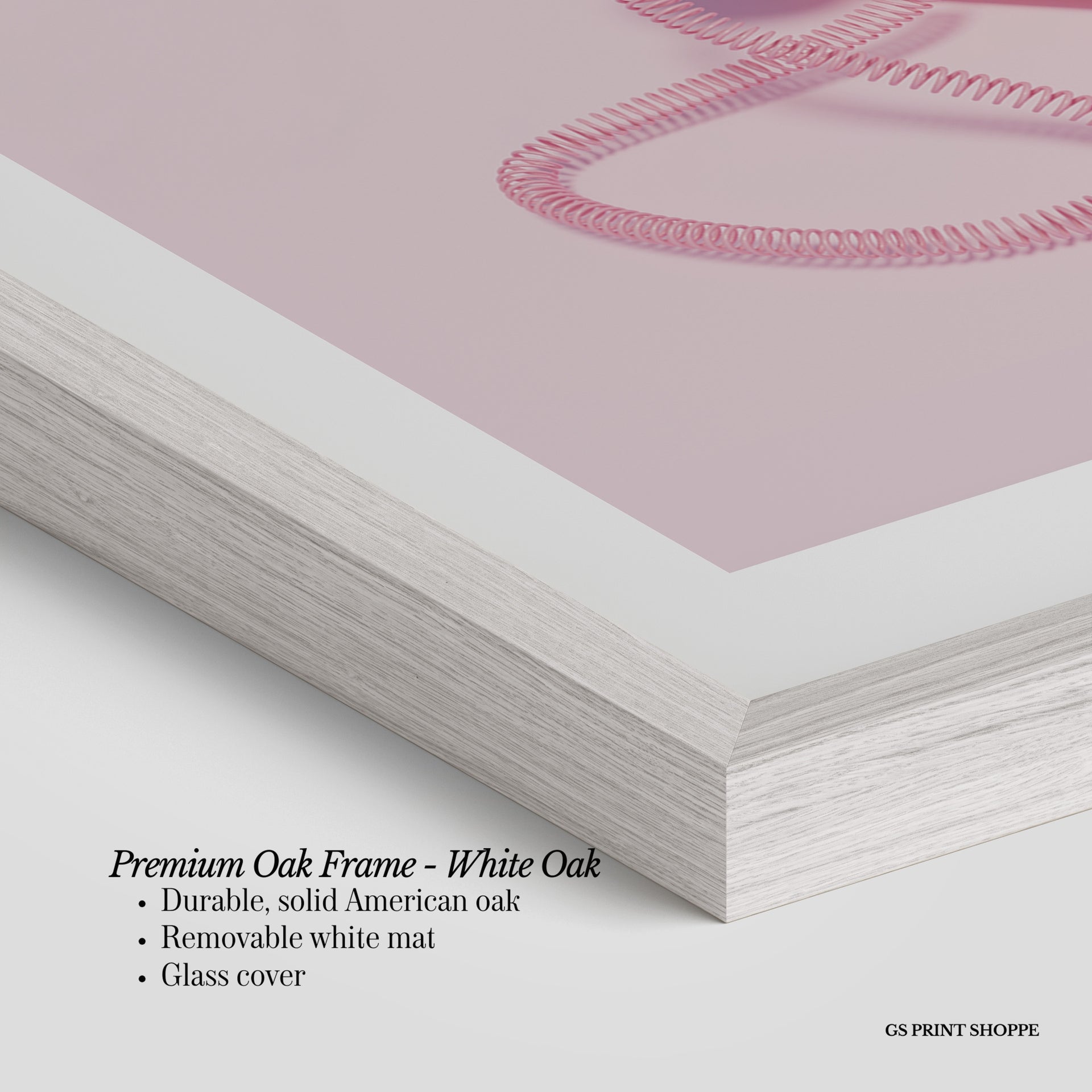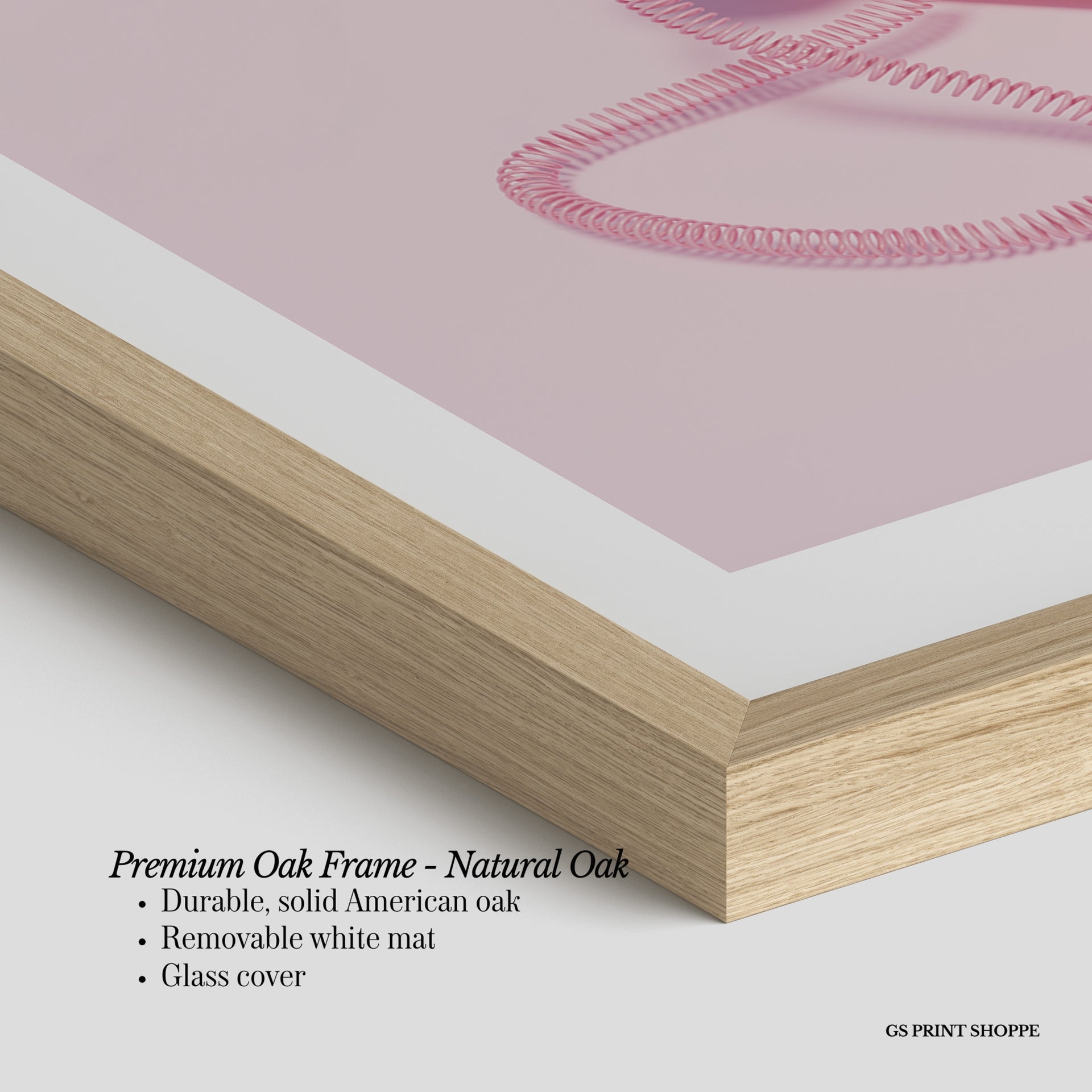 Premium Oak Frame: Our premium oak frame is crafted from solid American oak, offering a warm, natural feel with a high-end finish. We complete this elevated offering with a bright white removable mat and real glass for a versatile and polished look.