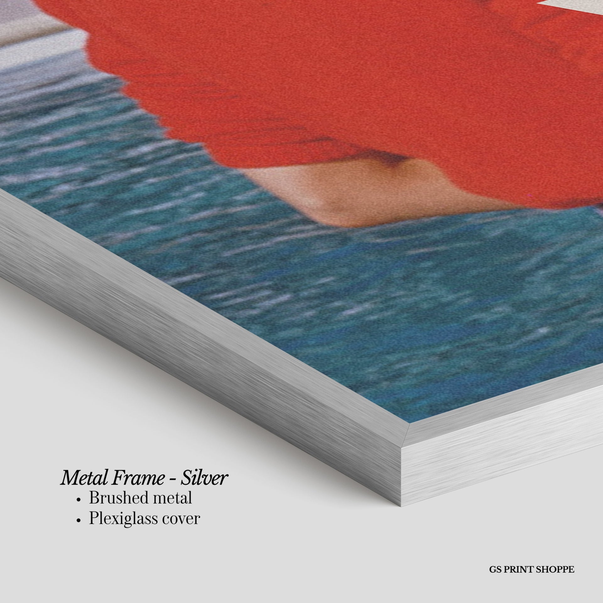 Metal Frame: Sleek and modern, our metal frame is crafted with brushed metal for a polished finish. It comes with durable plexiglass and sturdy metal hangers for horizontal or vertical display.