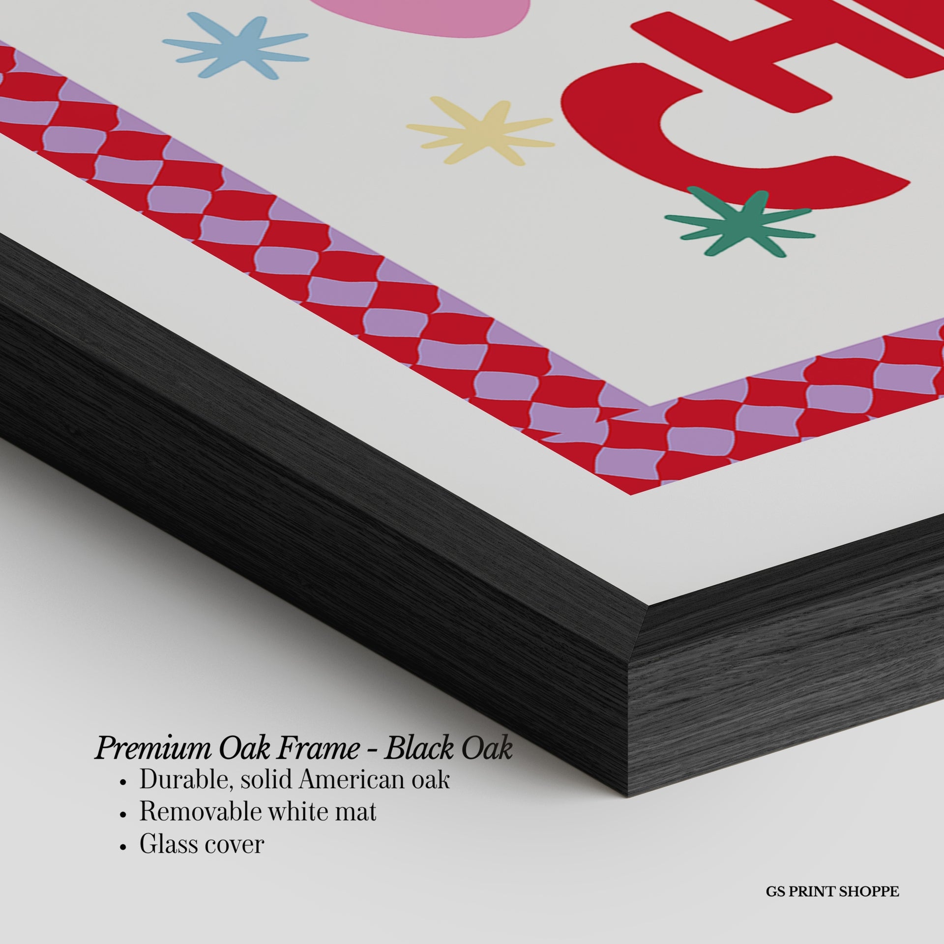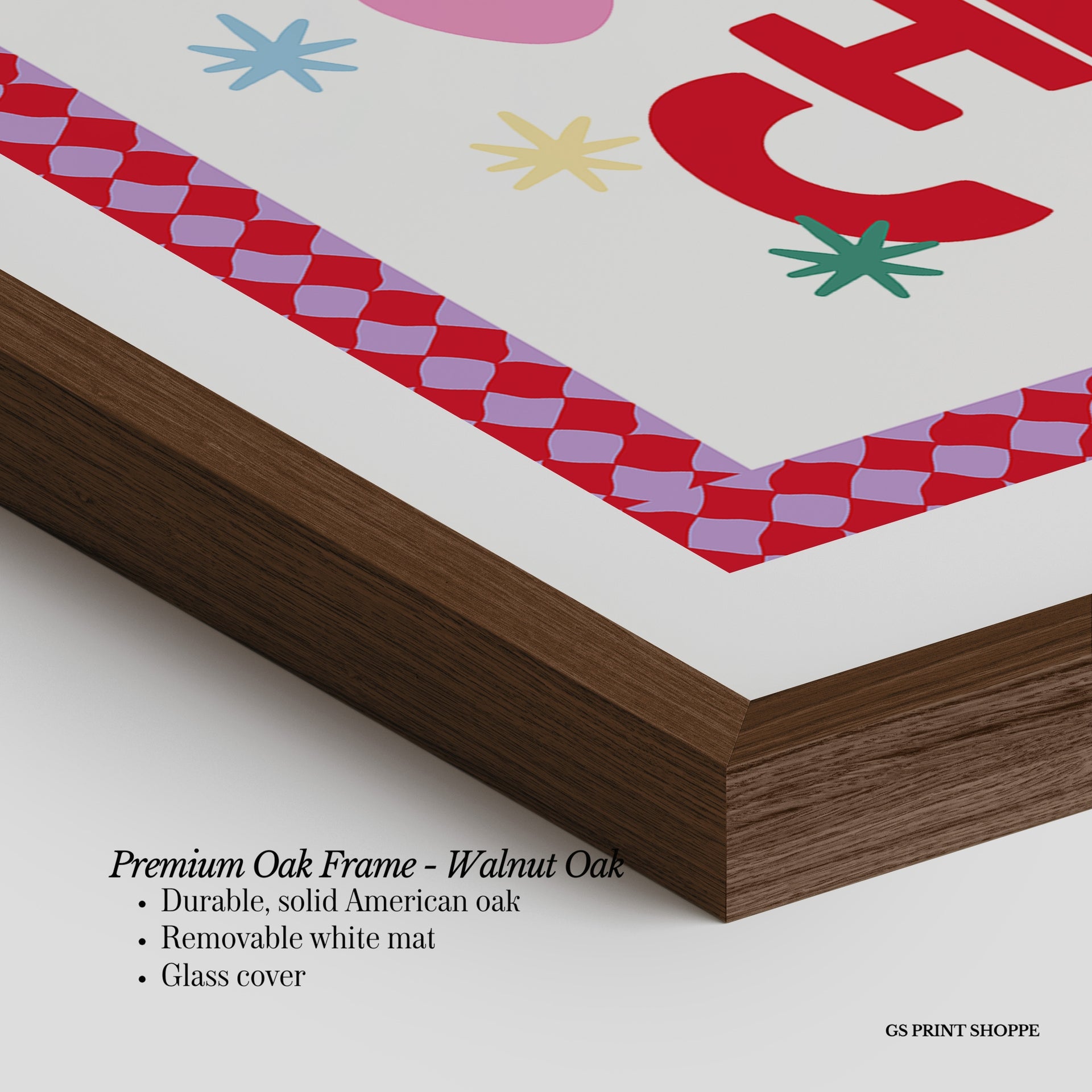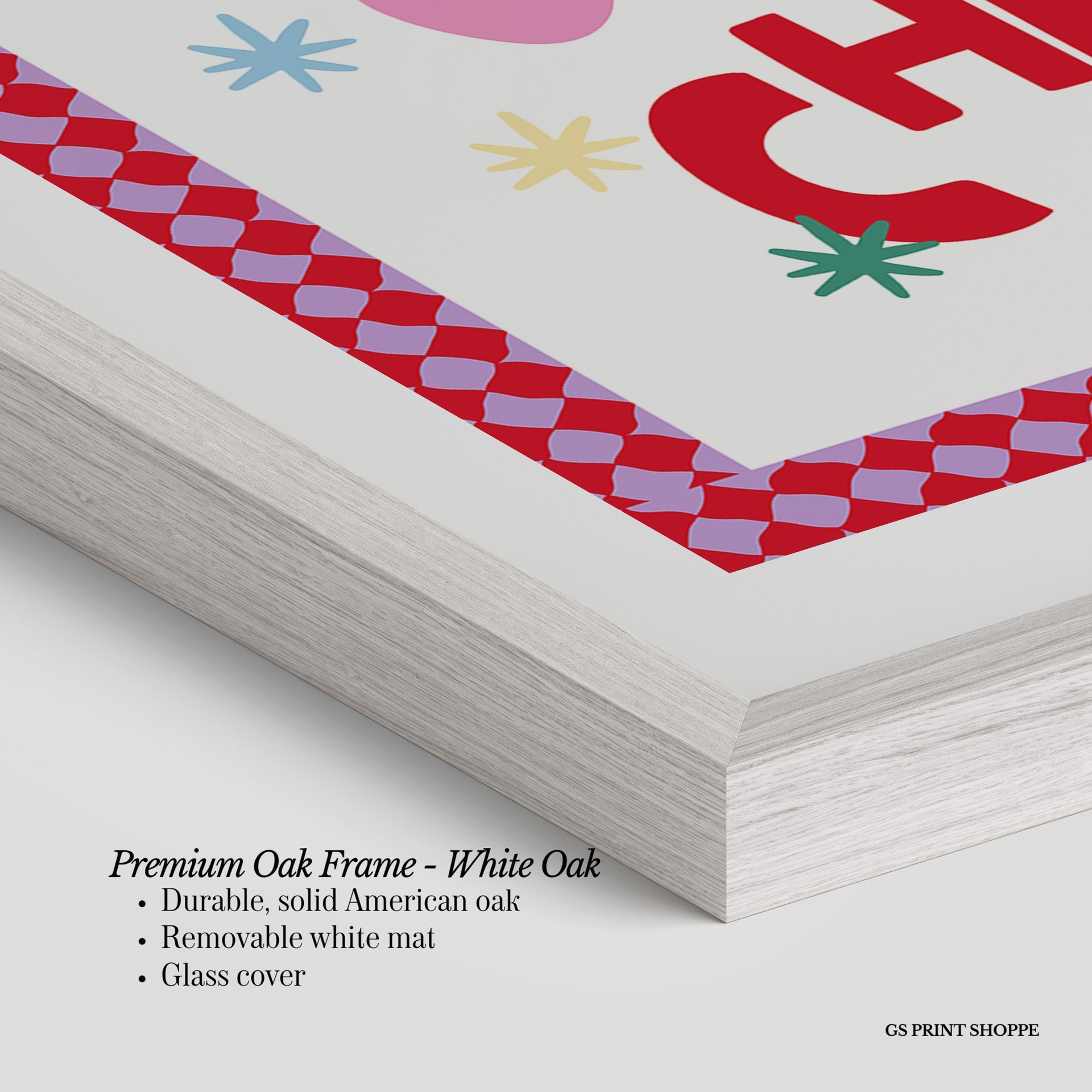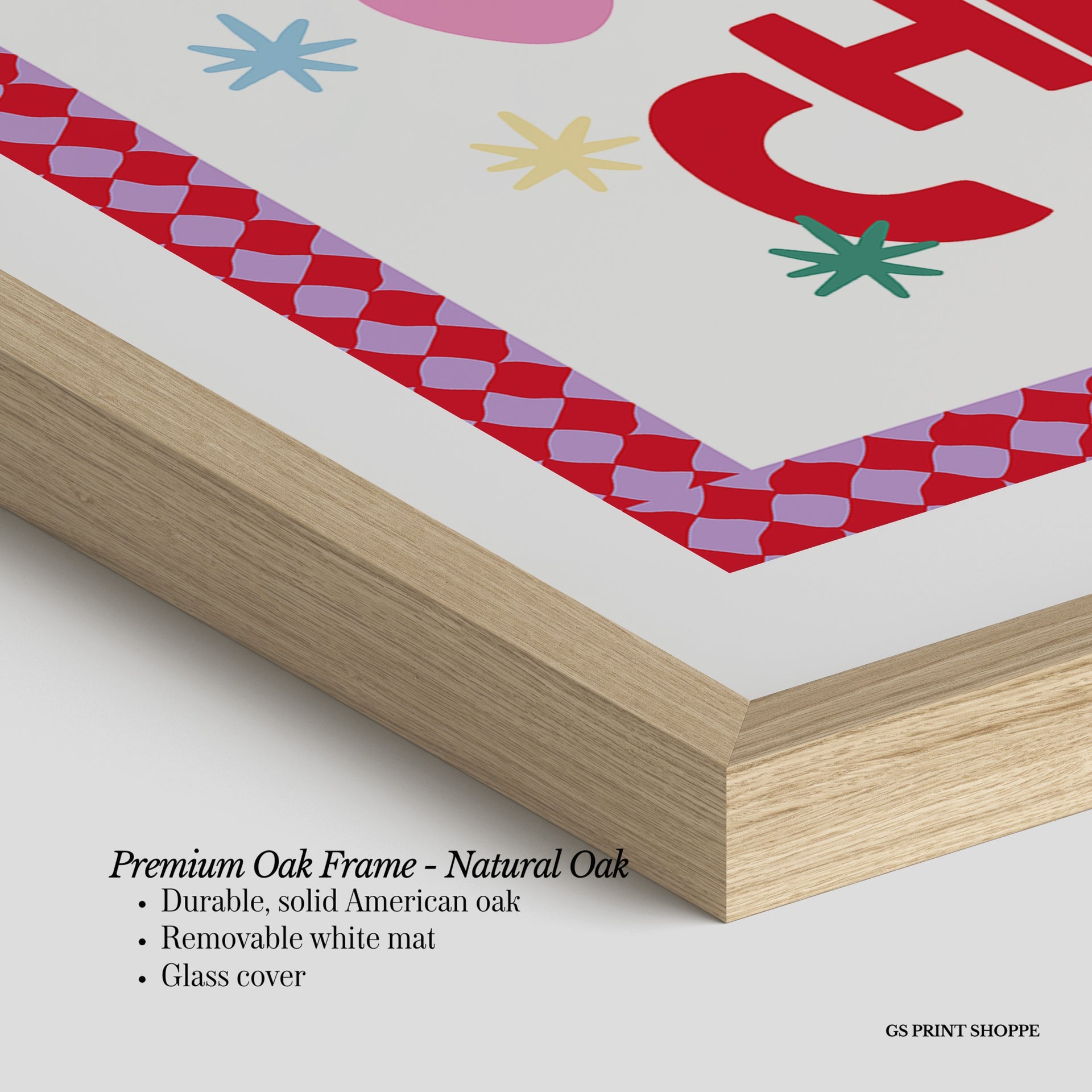 Premium Oak Frame: Our premium oak frame is crafted from solid American oak, offering a warm, natural feel with a high-end finish. We complete this elevated offering with a bright white removable mat and real glass for a versatile and polished look.