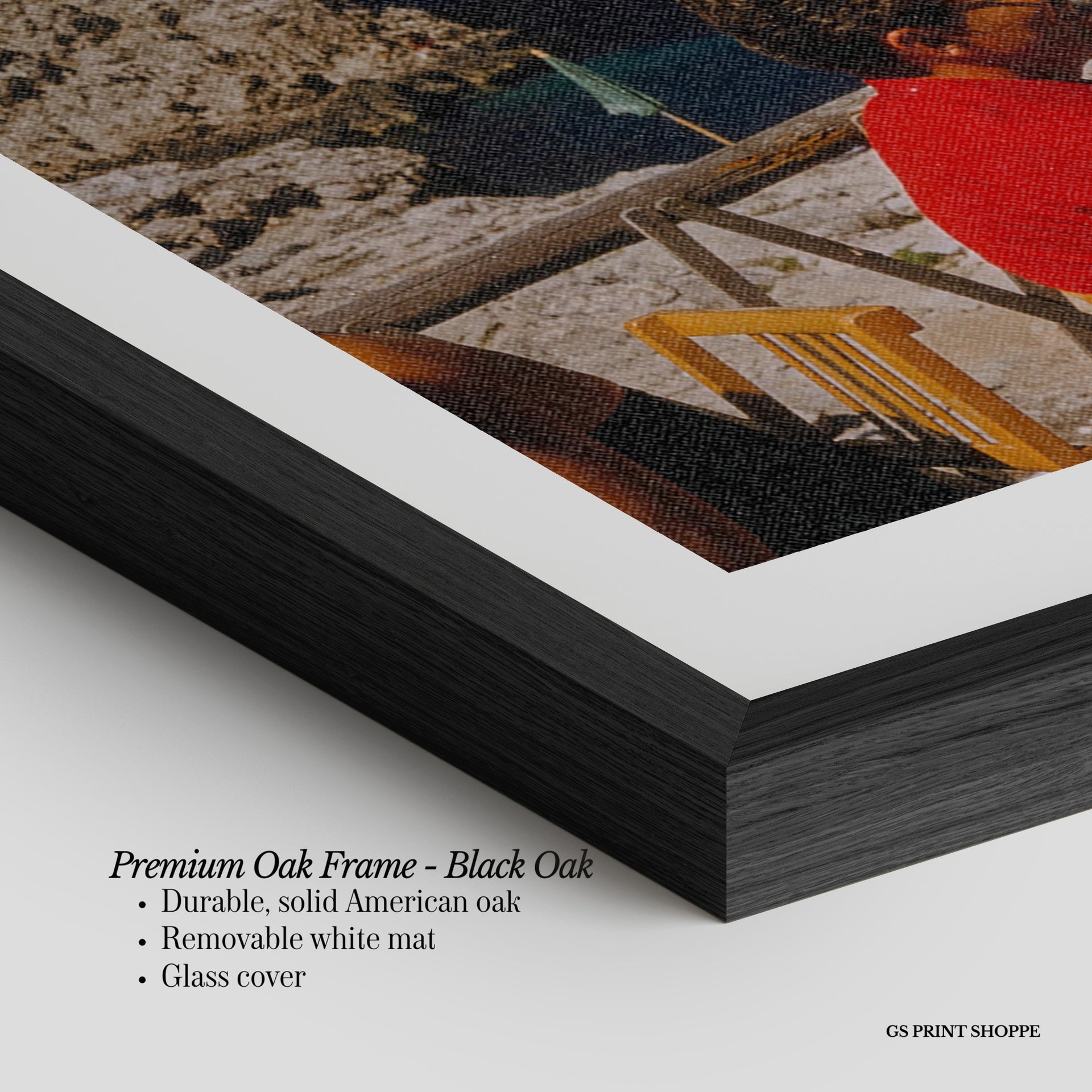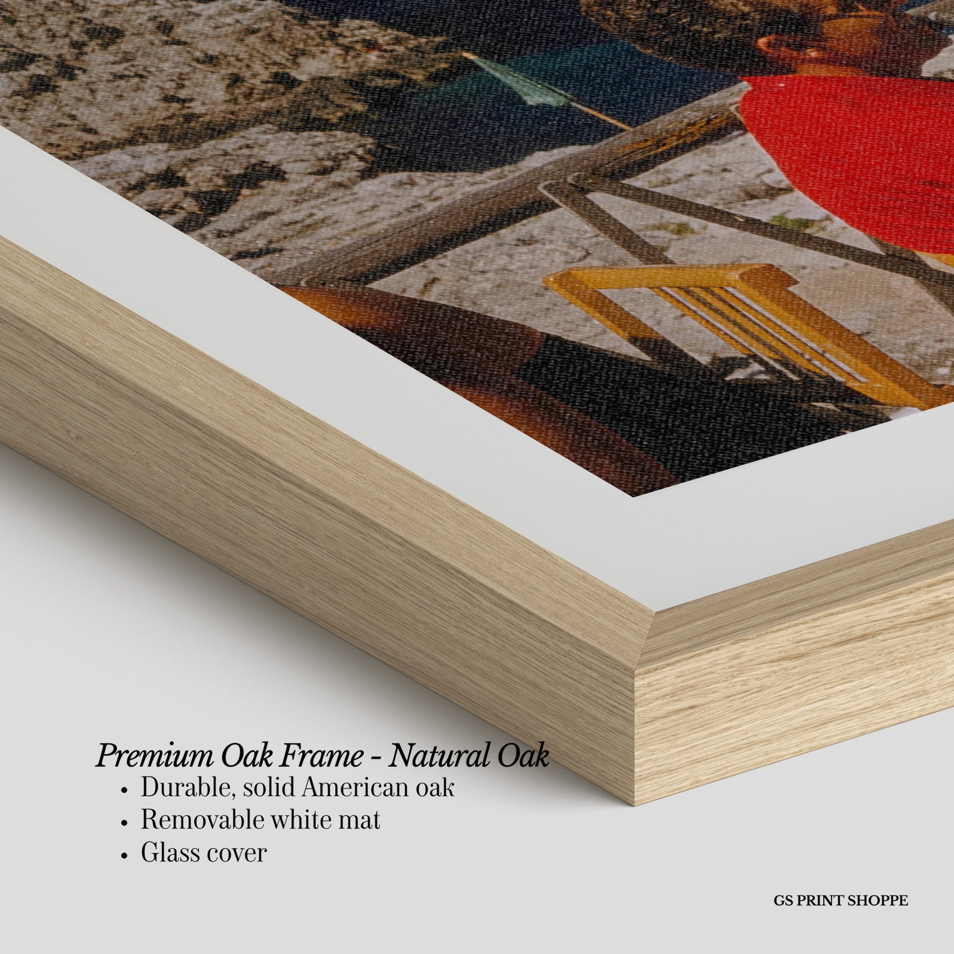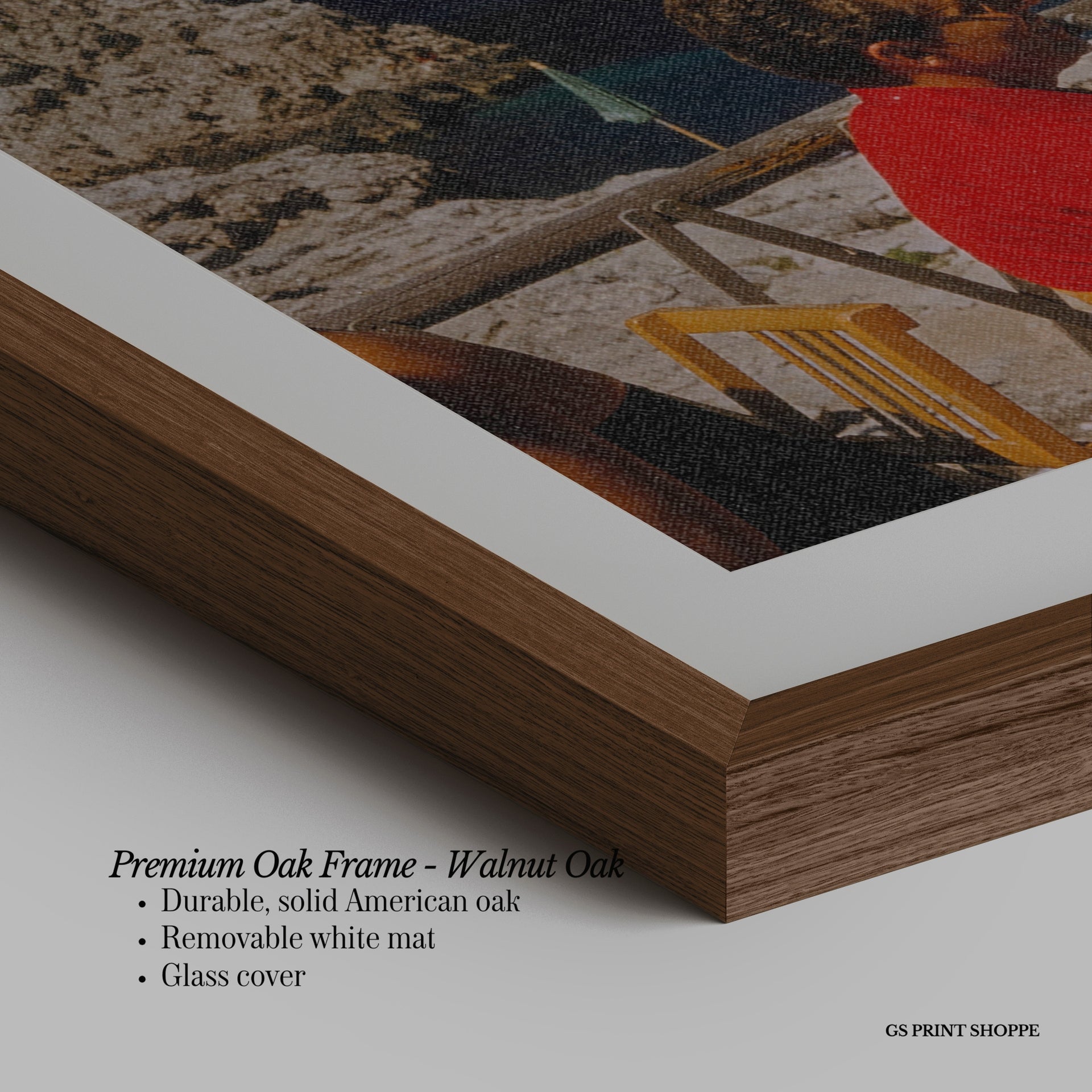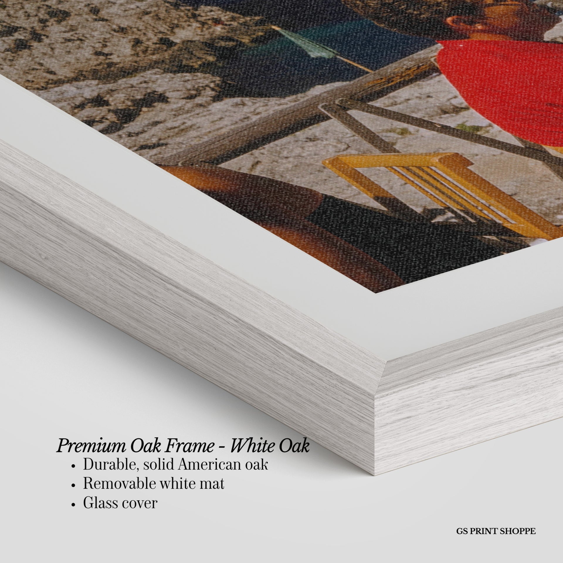 Premium Oak Frame: Our premium oak frame is crafted from solid American oak, offering a warm, natural feel with a high-end finish. We complete this elevated offering with a bright white removable mat and real glass for a versatile and polished look.