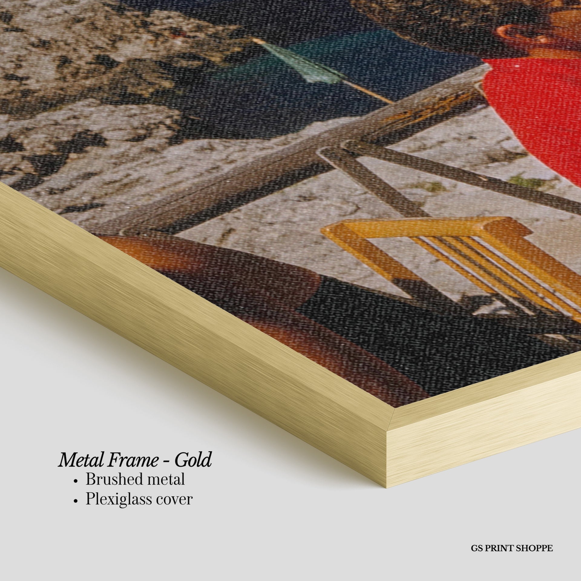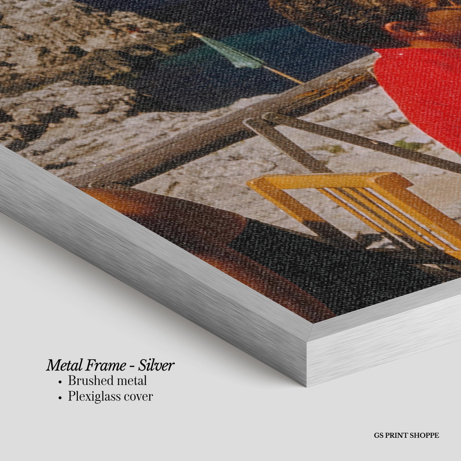 Metal Frame: Sleek and modern, our metal frame is crafted with brushed metal for a polished finish. It comes with durable plexiglass and sturdy metal hangers for horizontal or vertical display.