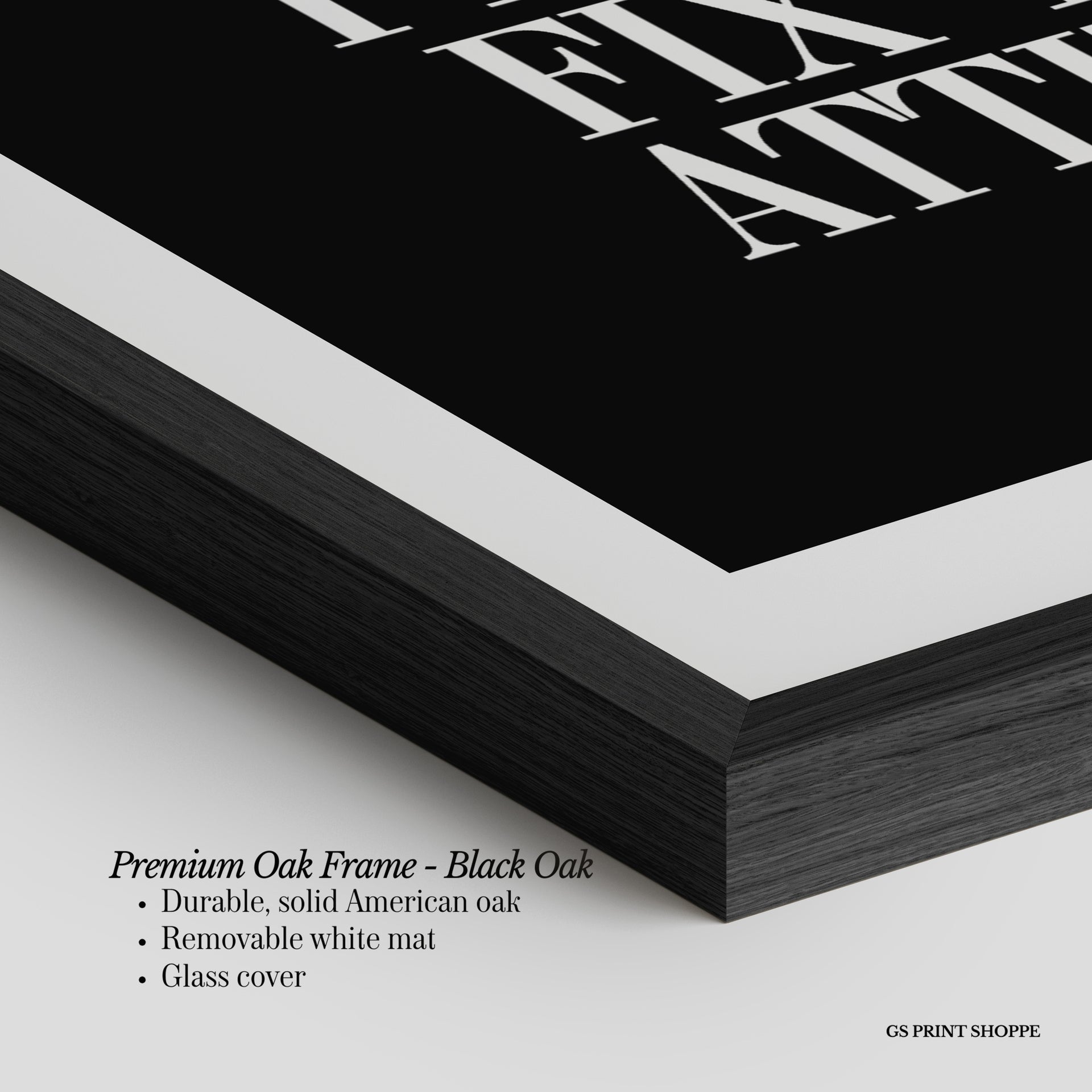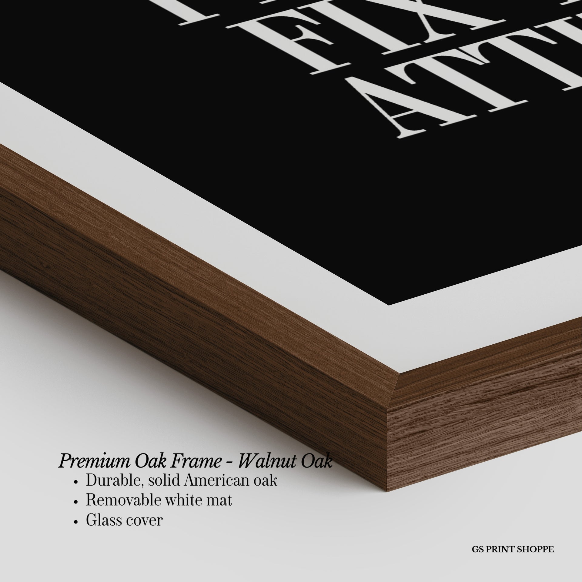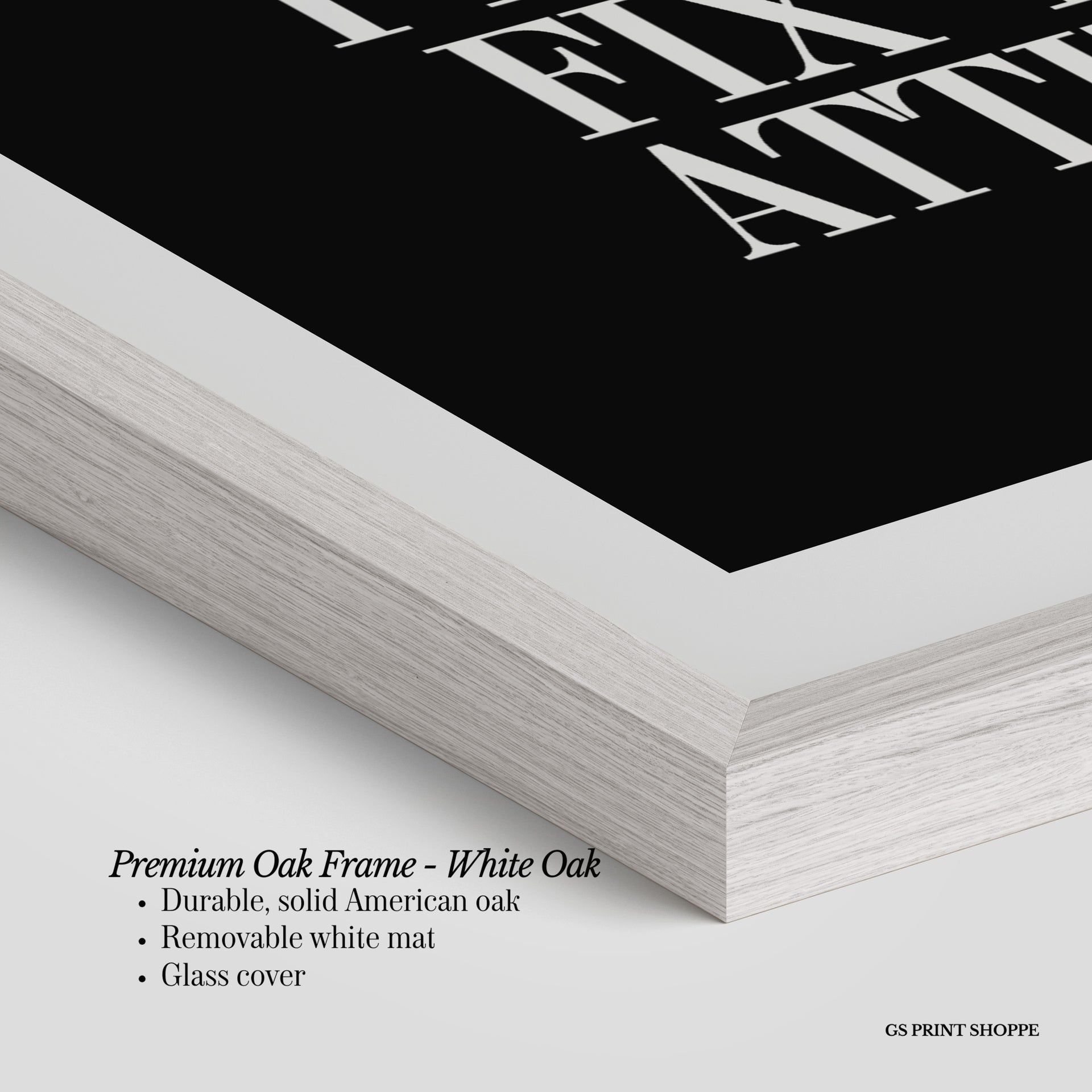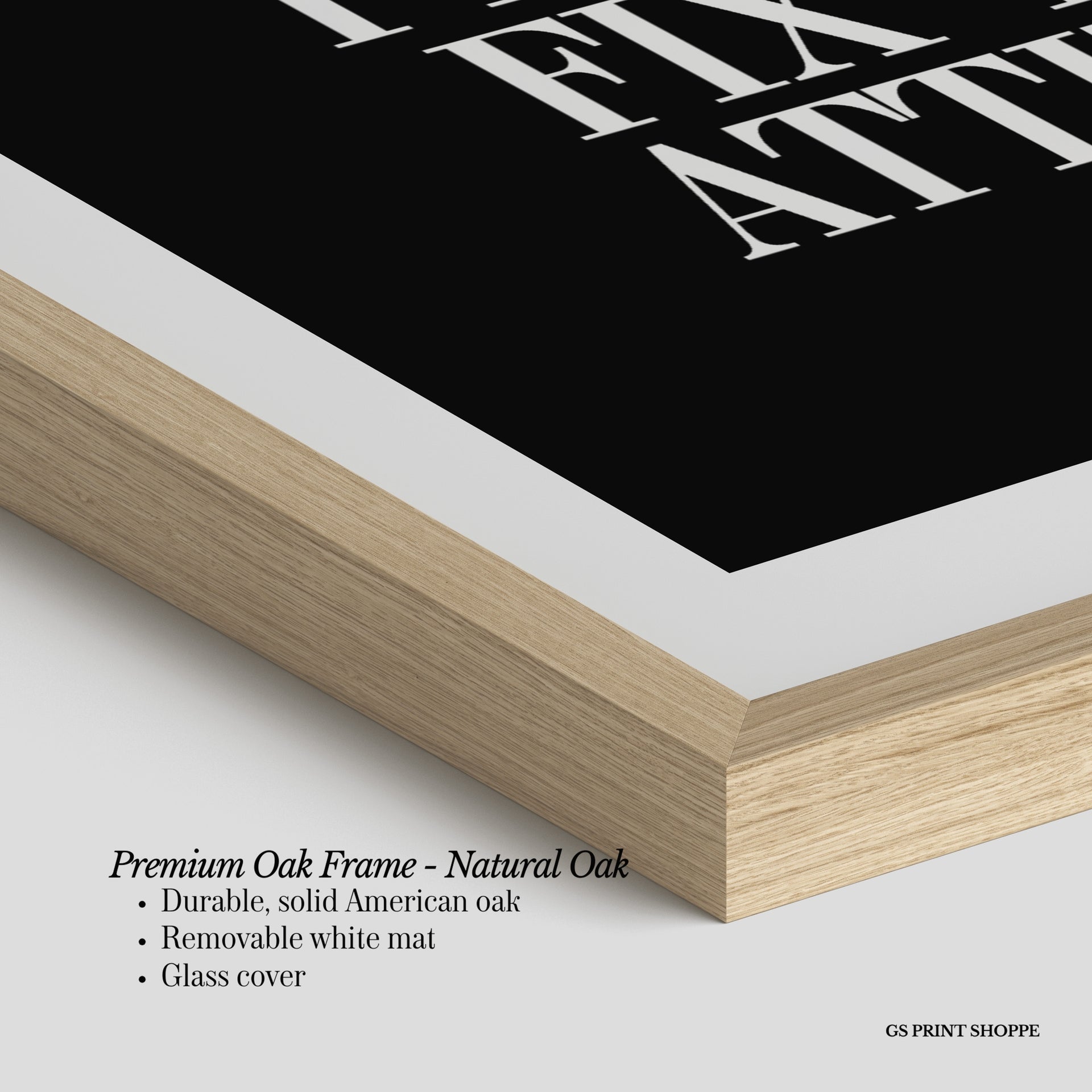 Premium Oak Frame: Our premium oak frame is crafted from solid American oak, offering a warm, natural feel with a high-end finish. We complete this elevated offering with a bright white removable mat and real glass for a versatile and polished look.