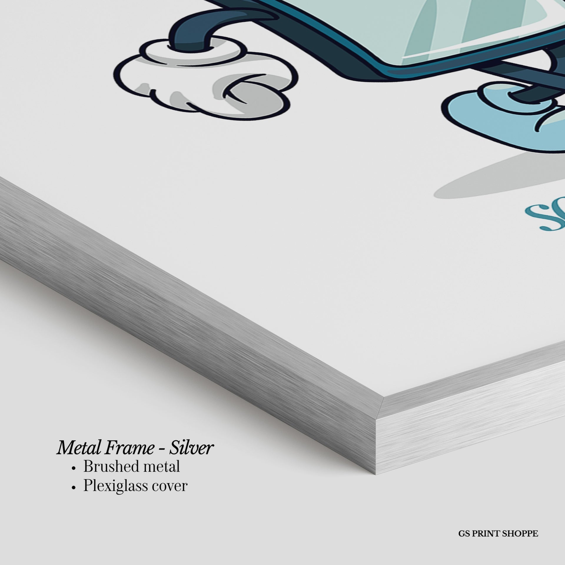 Metal Frame: Sleek and modern, our metal frame is crafted with brushed metal for a polished finish. It comes with durable plexiglass and sturdy metal hangers for horizontal or vertical display.